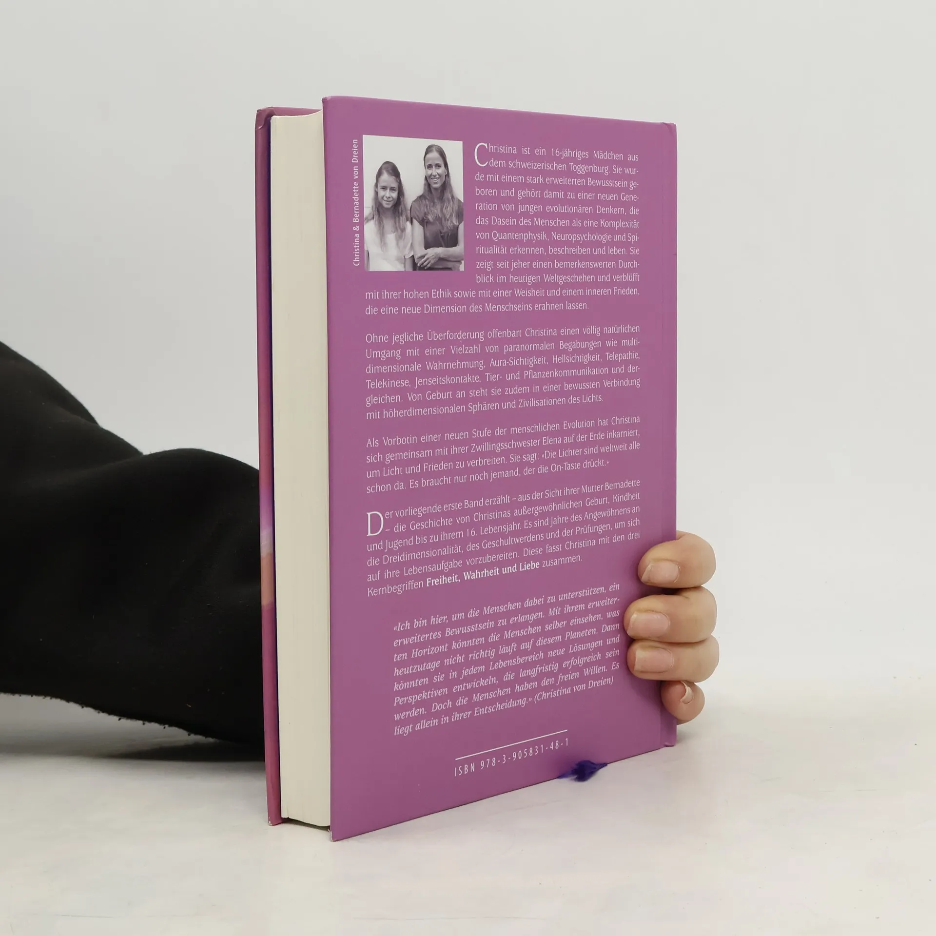 Christina ist ein 16-jähriges Mädchen aus dem Toggenburg, das mit einem stark erweiterten Bewusstsein geboren wurde. Sie gehört zu einer neuen Generation von jungen Denkern, die das menschliche Dasein als eine Komplexität aus Quantenphysik, Neuropsychologie und Spiritualität erkennen. Christina beeindruckt mit ihrer hohen Ethik, Weisheit und einem inneren Frieden, der eine neue Dimension des Menschseins erahnen lässt. Sie zeigt einen natürlichen Umgang mit paranormalen Fähigkeiten wie multidimensionaler Wahrnehmung, Aura-Sichtigkeit, Hellsichtigkeit, Telepathie und Tierkommunikation. Von Geburt an ist sie in bewusster Verbindung mit höheren Dimensionen und Zivilisationen des Lichts. Gemeinsam mit ihrer Zwillingsschwester Elena ist sie auf der Erde inkarniert, um Licht und Frieden zu verbreiten. Band 1 erzählt aus der Sicht ihrer Mutter Bernadette von Christinas außergewöhnlicher Geburt, Kindheit und Jugend bis zu ihrem 16. Lebensjahr. Diese Jahre sind geprägt von der Anpassung an die Dreidimensionalität und der Vorbereitung auf ihre Lebensaufgabe, die sie mit den Begriffen Freiheit, Wahrheit und Liebe zusammenfasst. Christina möchte den Menschen helfen, ein erweitertes Bewusstsein zu erlangen, um neue Lösungen für die Herausforderungen der Welt zu finden. Doch letztlich liegt die Entscheidung im freien Willen der Menschen.