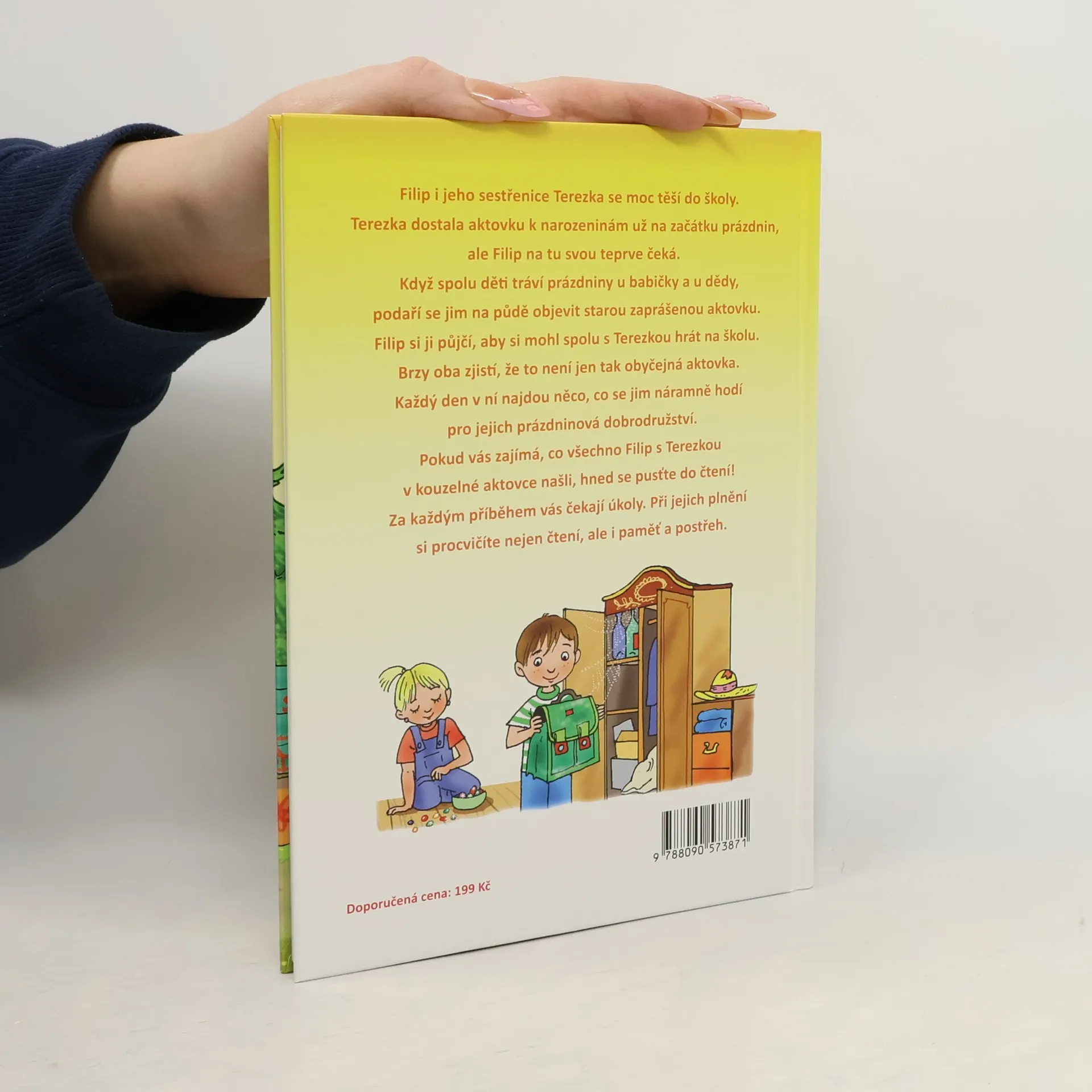 Filip i jeho sestřenice Terezka se moc těší do školy. Terezka dostala aktovku k narozeninám už na začátku prázdnin, ale Filip na tu svou teprve čeká. Když spolu děti tráví prázdniny u babičky a u dědy, podaří se jim na půdě objevit starou zaprášenou aktovku. Filip si ji půjčí, aby si mohl spolu s Terezkou hrát na školu. Brzy oba zjistí, že to není jen tak obyčejná aktovka. Každý den v ní najdou něco, co se jim náramně hodí pro jejich prázdninová dobrodružství. Pokud vás zajímá, co všechno Filip s Terezkou v kouzelné aktovce našli, hned se pusťte do čtení! Za každým příběhem na vás čekají úkoly. Při jejich plnění si procvičíte nejen čtení, ale i paměť a postřeh.