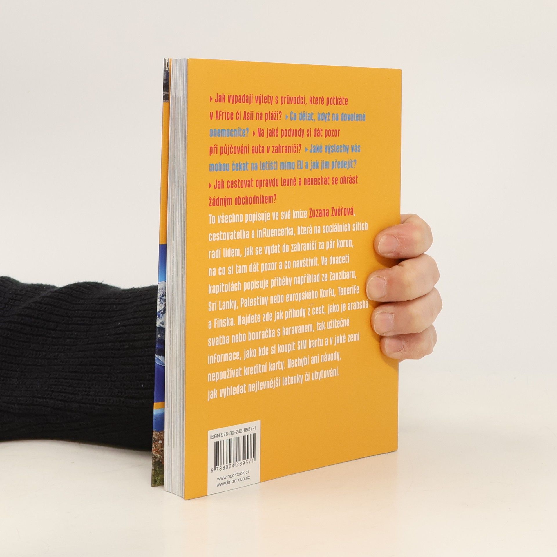 Jak vypadají výlety s průvodci, které potkáte v Africe či Asii na pláži? Co dělat, když na dovolené onemocníte? Na jaké podvody si dát pozor při půjčování auta v zahraničí? Jaké výslechy vás mohou čekat na letišti mimo EU a jak jim předejít? Jak cestovat opravdu levně a nenechat se okrást žádným obchodníkem? To všechno popisuje ve své knize Zuzana Zvěřová, cestovatelka a influencerka, která na sociálních sítích radí lidem, jak se vydat do zahraničí za pár korun, na co si tam dát pozor a co navštívit. Ve dvaceti kapitolách popisuje mimo jiné příběhy ze Zanzibaru, Srí Lanky, Palestiny, ale i z evropského Korfu, Tenerife nebo Finska. Najdete v nich jak příhody z cest, jako je arabská svatba nebo bouračka s karavanem, tak užitečné informace, jako kde si koupit SIM kartu a v jaké zemi nepoužívat kreditní karty. Nechybí ani návody na to, jak vyhledat nejlevnější letenky či ubytování.