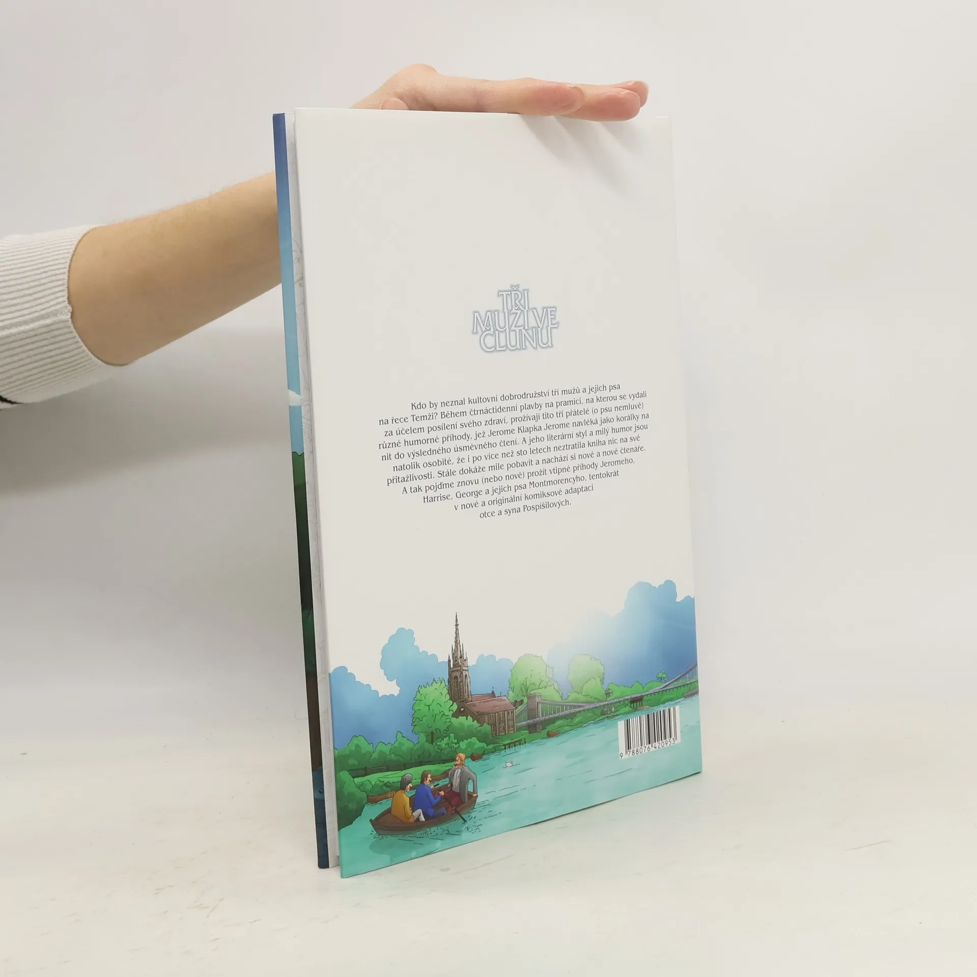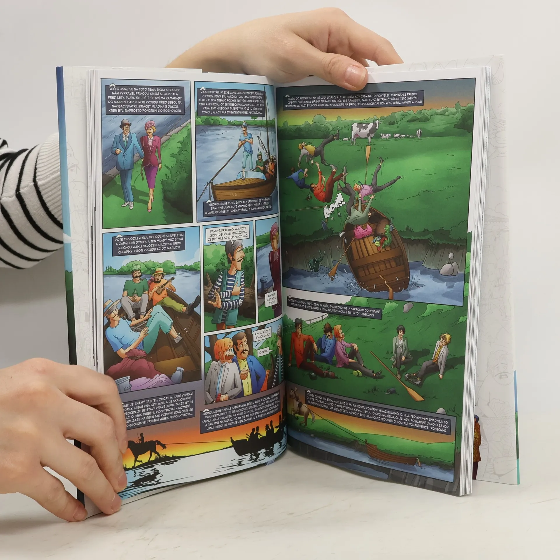 Grafický román podle slavné předlohy z pera Jerome Klapky Jeromeho. Příběh začíná setkáním tří dobrých přátel. Obklopeni tabákovým dýmem si vzájemně začnou stěžovat na přerůzné neduhy, které je poslední dobou pronásledují. Po pečlivém rozboru všemožných nemocí a problémů pánové usoudí, že jediné, co jim může zachránit psychické i fyzické zdraví, je příjemná dovolená. A tak se rozhodnou vyrazit i se psem Montmorencym na řeku. Tak začíná nesmrtelná kniha Tři muži ve člunu, kterou bez velké nadsázky můžeme označit za základ moderního britského humoru. Dočkala se mnoha filmových i televizních zpracování a časopis Guardian ji zařadil mezi padesát nejvýznamnějších literárních děl všech dob.