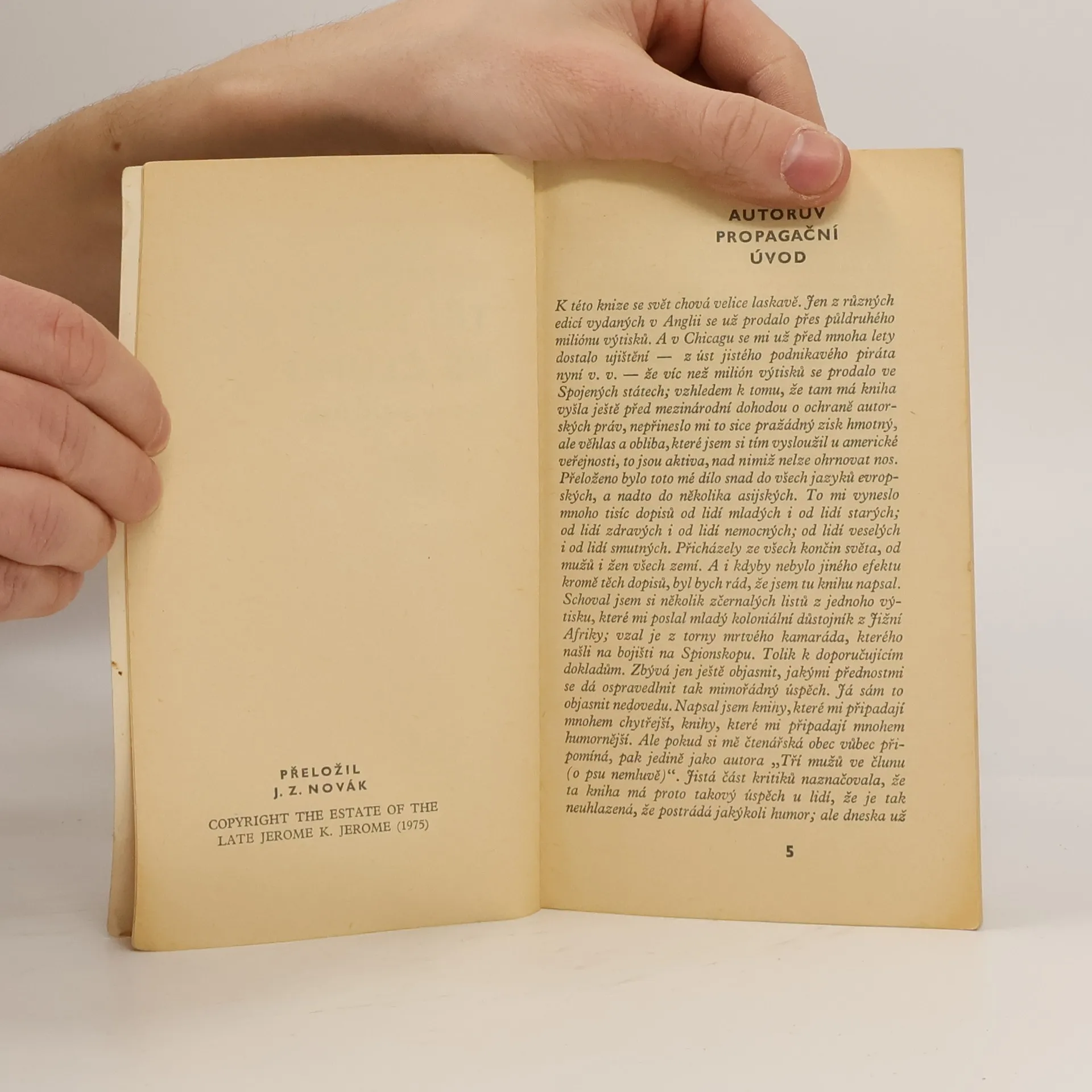 Rozmarný příběh tří přátel, kteří se vypraví společně na několikadenní dovolenou po řece Temži, patří ke klasickým dílům světové humoristické literatury. Vyprávění je pestrou směsicí příhod a událostí, které je po dobu této svérázné výpravy potkávají na palubě jejich člunu i v pobřežních hospůdkách. Autor používá klidný, suchý humor, s jehož pomocí odhaluje lidské slabosti, návyky a zlozvyky a velebí přátelskou solidaritou a touhou po dobrodružství.