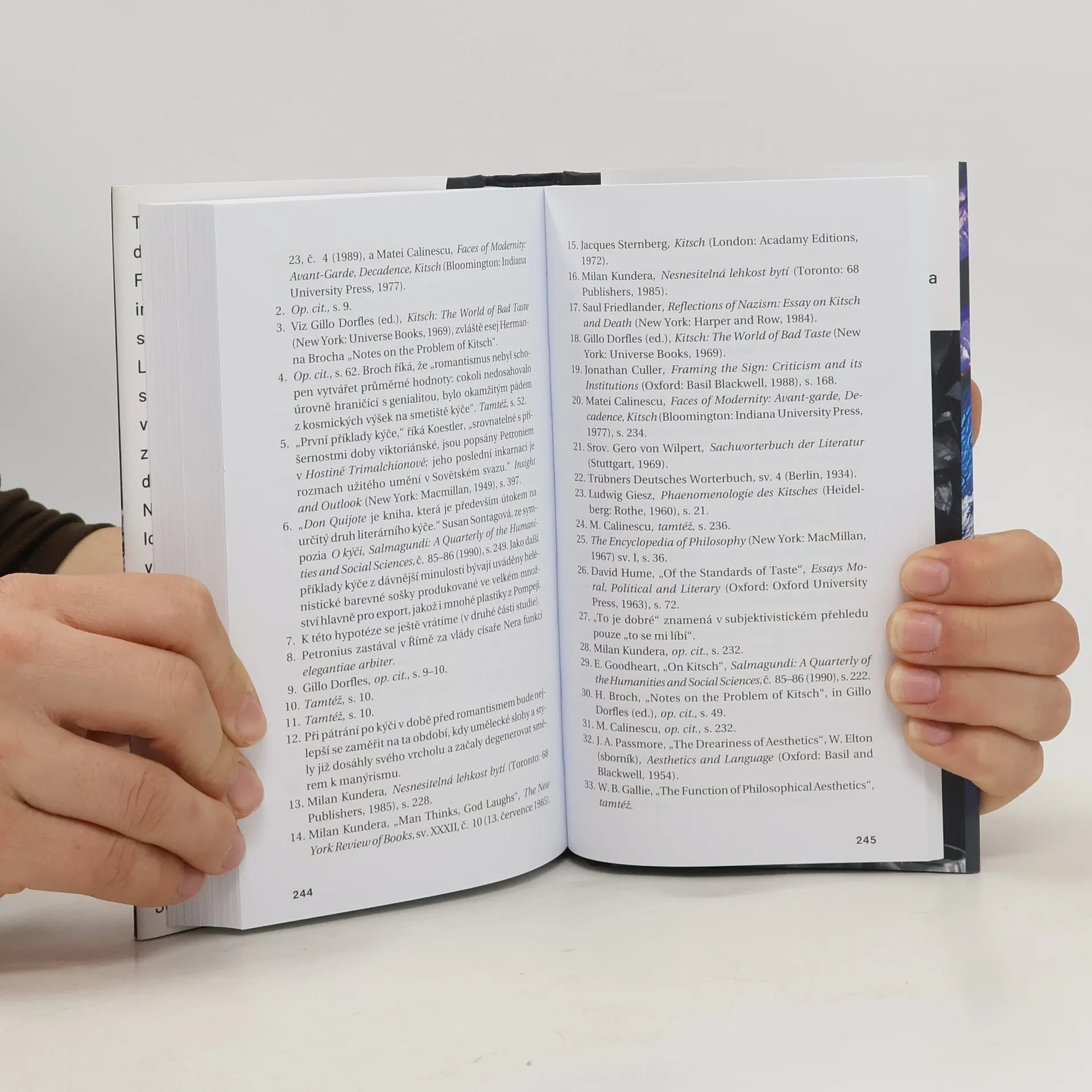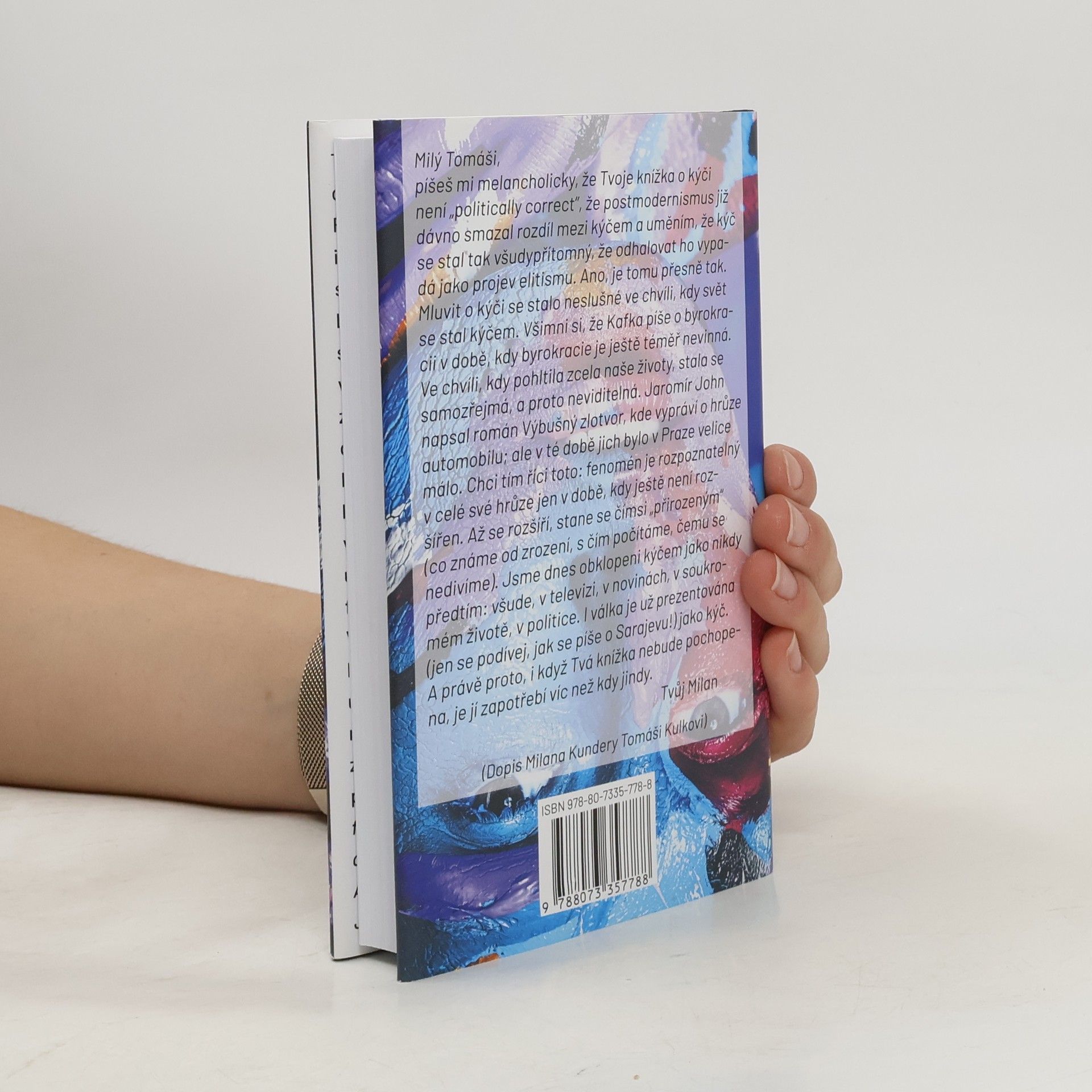 „Milý Tomáši, píšeš mi melancholicky, že Tvoje knížka o kýči není „politically correct“, že postmodernismus již dávno smazal rozdíl mezi kýčem a uměním, že kýč se stal tak všudypřítomný, že odhalovat ho vypadá jako projev elitismu. Ano, je tomu přesně tak. Mluvit o kýči se stalo neslušné ve chvíli, kdy svět se stal kýčem. Všimni si, že Kafka píše o byrokracii v době, kdy byrokracie je ještě téměř nevinná. Ve chvíli, kdy pohltila zcela naše životy, stala se samozřejmá, a proto neviditelná. Jaromír John napsal román Výbušný zlotvor, kde vypráví o hrůze automobilu; ale v té době jich bylo v Praze velice málo. Chci tím říci toto: fenomén je rozpoznatelný v celé své hrůze jen v době, kdy ještě není rozšířen. Až se rozšíří, stane s čímsi „přirozeným“ (co známe od zrození, s čím počítáme, čemu se nedivíme). Jsme dnes obklopeni kýčem jako nikdy předtím: všude, v televizi, v novinách, v soukromém životě, v politice. I válka je už prezentována (jen se podívej, jak se píše o Sarajevu!) jako kýč. A právě proto, i když Tvá knížka nebude pochopena, je jí zapotřebí víc než kdy jindy. Tvůj Milan" (Dopis Milana Kundery Tomáši Kulkovi z Paříže do Jeruzaléma) Kniha studuje jednak specifickou estetickou kategorii kýče, jednak obecnou problematiku hodnocení uměleckého díla.