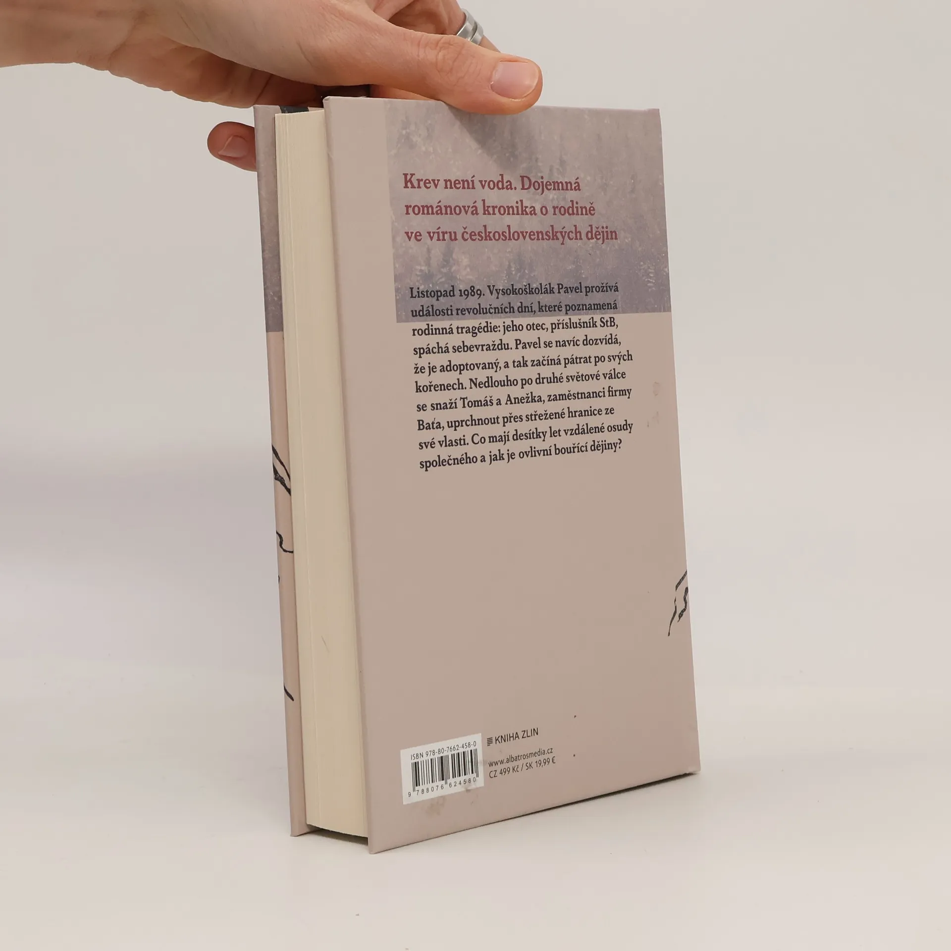 Krev není voda. Románová kronika o rodině ve víru československých dějin. Listopad 1989. Vysokoškolák Pavel prožívá události revolučních dní, které poznamená rodinná tragédie: jeho otec, příslušník StB, spáchá sebevraždu. Pavel se navíc dozvídá, že je adoptovaný, a tak začíná pátrat po svých kořenech. Nedlouho po druhé světové válce se snaží Tomáš a Anežka, zaměstnanci firmy Baťa, uprchnout přes střežené hranice ze své vlasti. Co mají desítky let vzdálené osudy společného a jak je ovlivní bouřící dějiny?