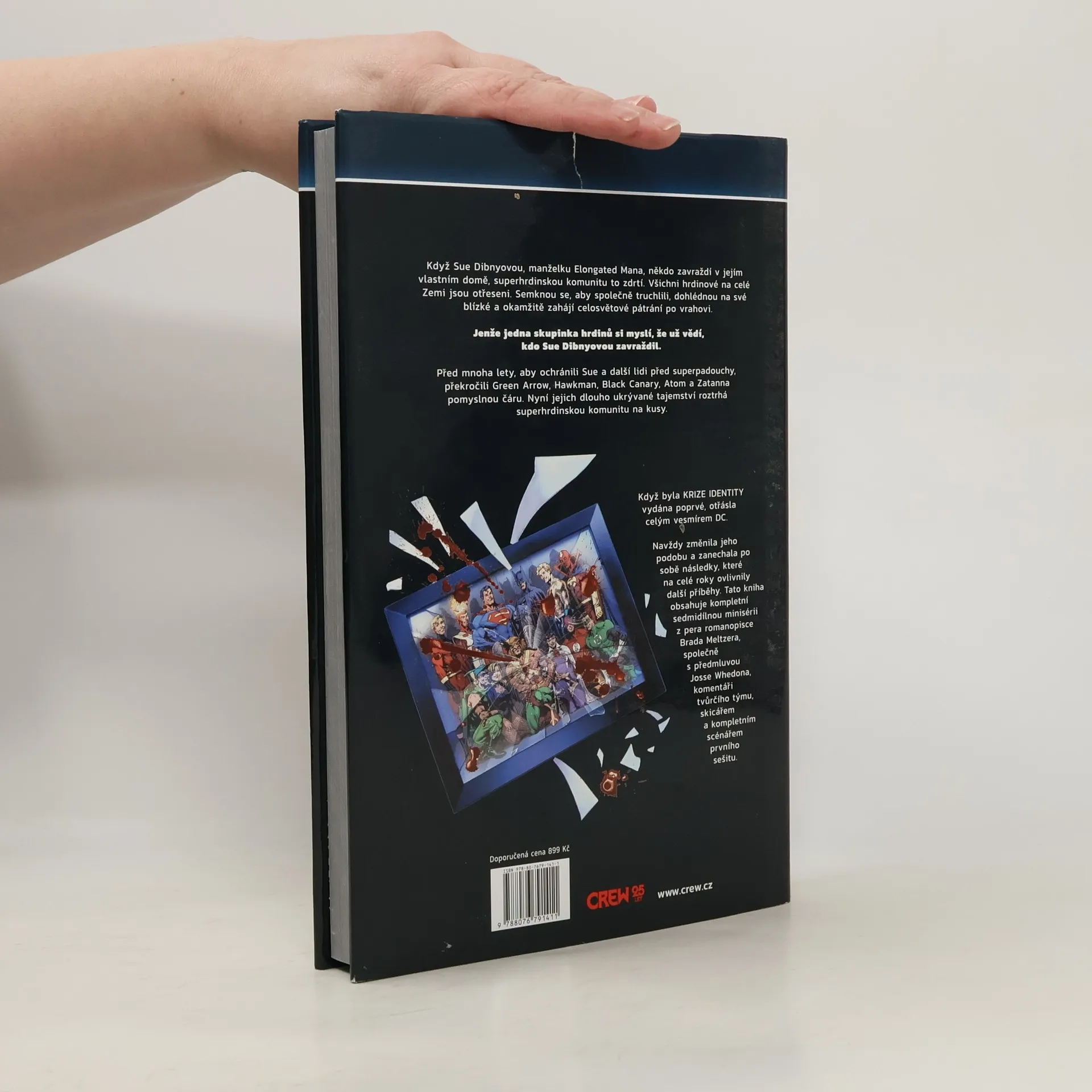 Když Sue Dibnyovou, manželku Elongated Mana, někdo zavraždí v jejím vlastním domě, superhrdinskou komunitu to zdrtí. Všichni hrdinové na celé Zemi jsou otřeseni. Semknou se, aby společně truchlili, dohlédnou na své blízké a okamžitě zahájí celosvětové pátrání po vrahovi. Jenže jedna skupinka hrdinů si myslí, že už vědí, kdo Sue Dibnyovou zavraždil. Před mnoha lety, aby ochránili Sue a další lidi před superpadouchy, překročili Green Arrow, Hawkman, Black Canary, Atom a Zatanna pomyslnou čáru. Nyní jejich dlouho ukrývané tajemství roztrhá superhrdinskou komunitu na kusy. Když byla KRIZE IDENTITY vydána poprvé, otřásla celým vesmírem DC. Navždy změnila jeho podobu a zanechala po sobě následky, které na celé roky ovlivnily další příběhy. Tato kniha obsahuje kompletní sedmidílnou minisérii z pera romanopisce Brada Meltzera, společně s předmluvou Josse Whedona, komentáři tvůrčího týmu, skicářem a kompletním scénářem prvního sešitu.
