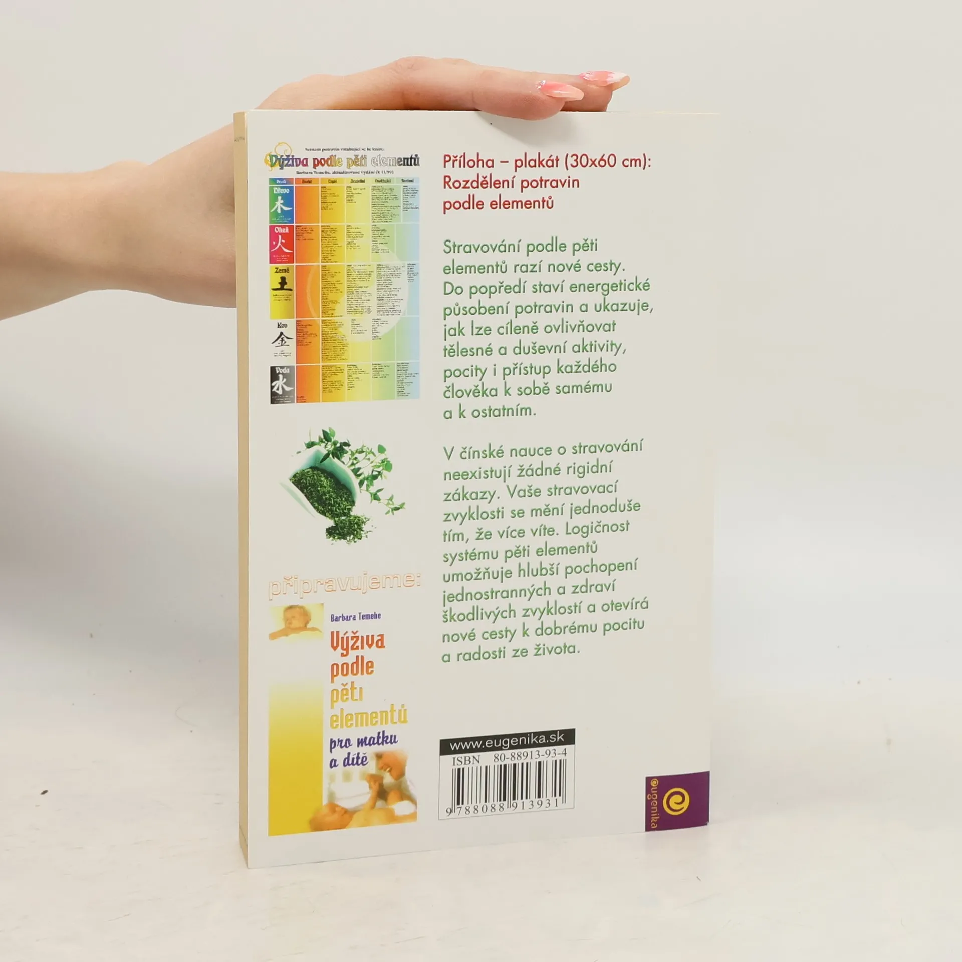 Stravování podle pěti elementů razí nové cesty. Do popředí staví energetické působení potravin a ukazuje, jak lze cíleně ovlivňovat tělesné a duševní aktivity, pocity i přístup každého člověka k sobě samému a k ostatním. V čínské nauce o stravování neexistují žádné rigidní zákazy. Vaše stravovací zvyklosti se mění jednoduše tím, že více víte. logičnost systému pěti elementů umožňuje hlubší pochopení jednostranných a zdraví škodlivých zvyklostí a otevírá nové cesty k dobrému pocitu a radosti ze života. Příloha - plakát (30x60 cm): Rozdělení potravin podle pěti elementů.