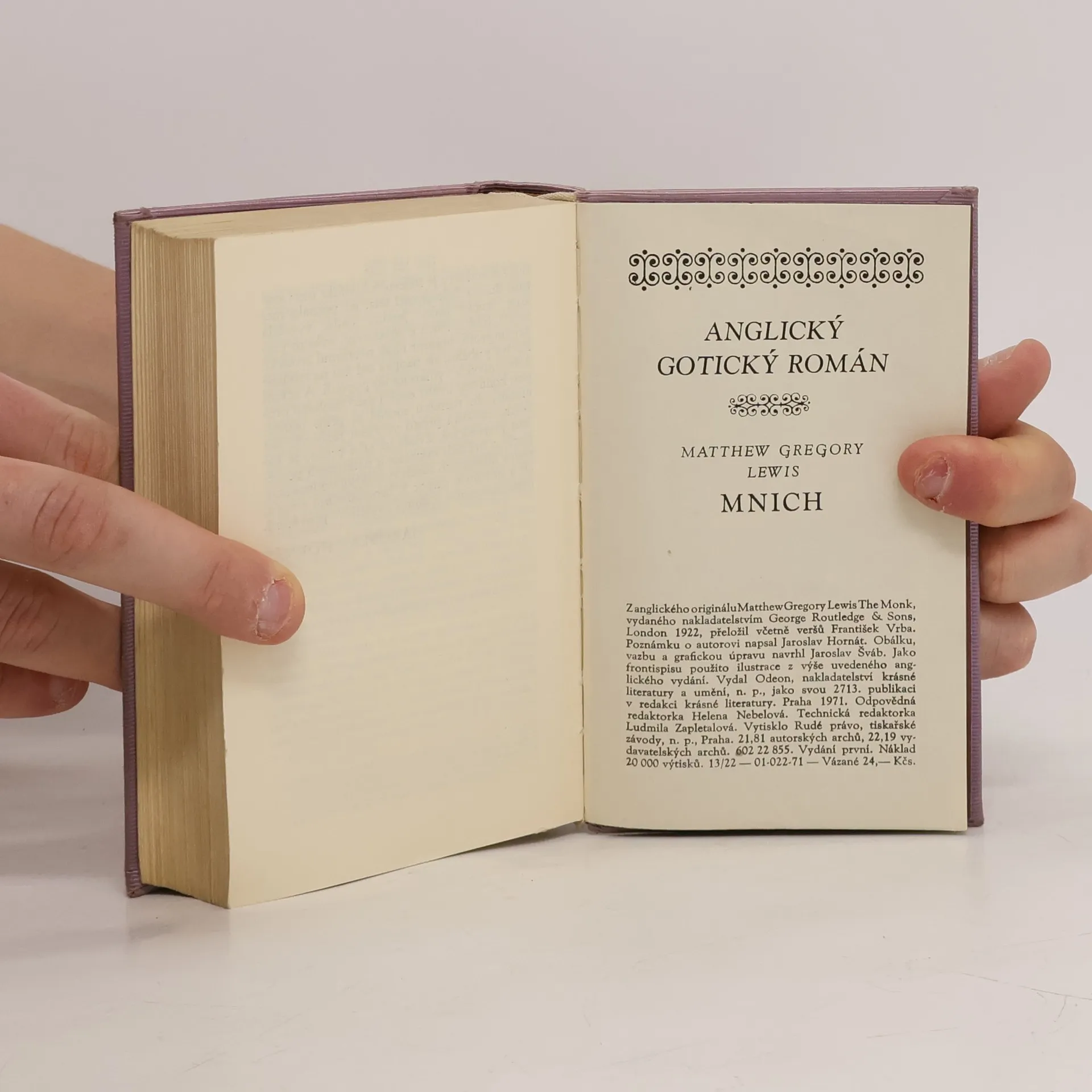 První a také jediný román, který z rozsáhlé tvorby anglického spisovatele a dramatika vstoupil do literárních dějin. Autor totiž v tomto díle přináší do romantické literatury vůbec a zejména pak do hrůzostrašného žánru anglického gotického románu v postavě mnicha novou problematiku tragédie duše. Příběh vypráví o mnichovi, který neodolá svodům Satanovým, propadne neřestným vášním tělesného chtíče a pod maskou ctihodnosti kupí pomocí kouzel jeden zločin na druhý, přičemž současně prožívá i duševní utrpení nad scestnou vášní přemáhající ctnostná předsevzetí. Poznámku o autorovi napsal Jaroslav Hornát.