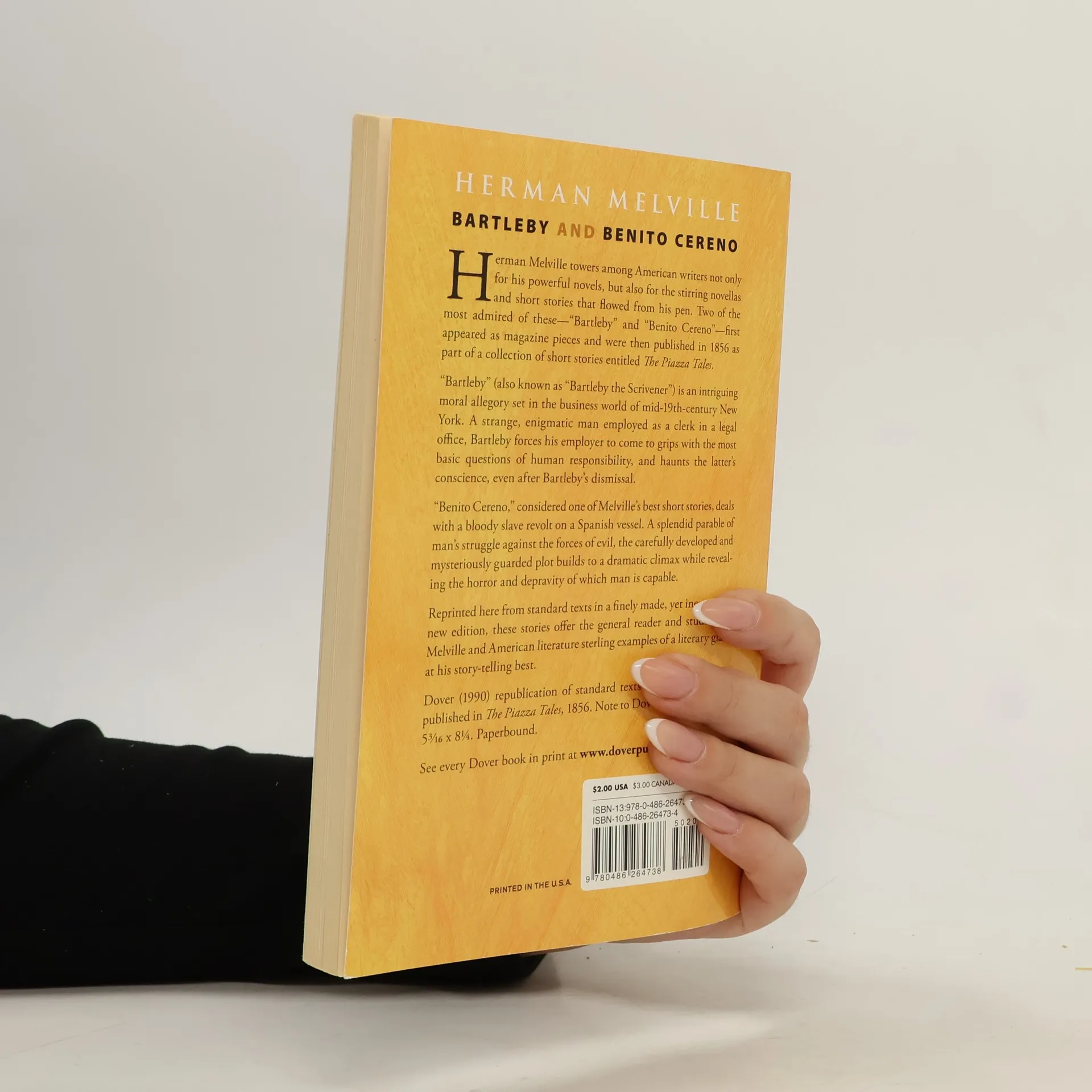 Herman Melville towers among American writers not only for his powerful novels, but also for the stirring novellas and short stories that flowed from his pen. Two of the most admired of these — "Bartleby" and "Benito Cereno" — first appeared as magazine pieces and were then published in 1856 as part of a collection of short stories entitled The Piazza Tales."Bartleby" (also known as "Bartleby the Scrivener") is an intriguing moral allegory set in the business world of mid-19th-century New York. A strange, enigmatic man employed as a clerk in a legal office, Bartleby forces his employer to come to grips with the most basic questions of human responsibility, and haunts the latter's conscience, even after Bartleby's dismissal."Benito Cereno," considered one of Melville's best short stories, deals with a bloody slave revolt on a Spanish vessel. A splendid parable of man's struggle against the forces of evil, the carefully developed and mysteriously guarded plot builds to a dramatic climax while revealing the horror and depravity of which man is capable.Reprinted here from standard texts in a finely made, yet inexpensive new edition, these stories offer the general reader and students of Melville and American literature sterling examples of a literary giant at his story-telling best.--back cover