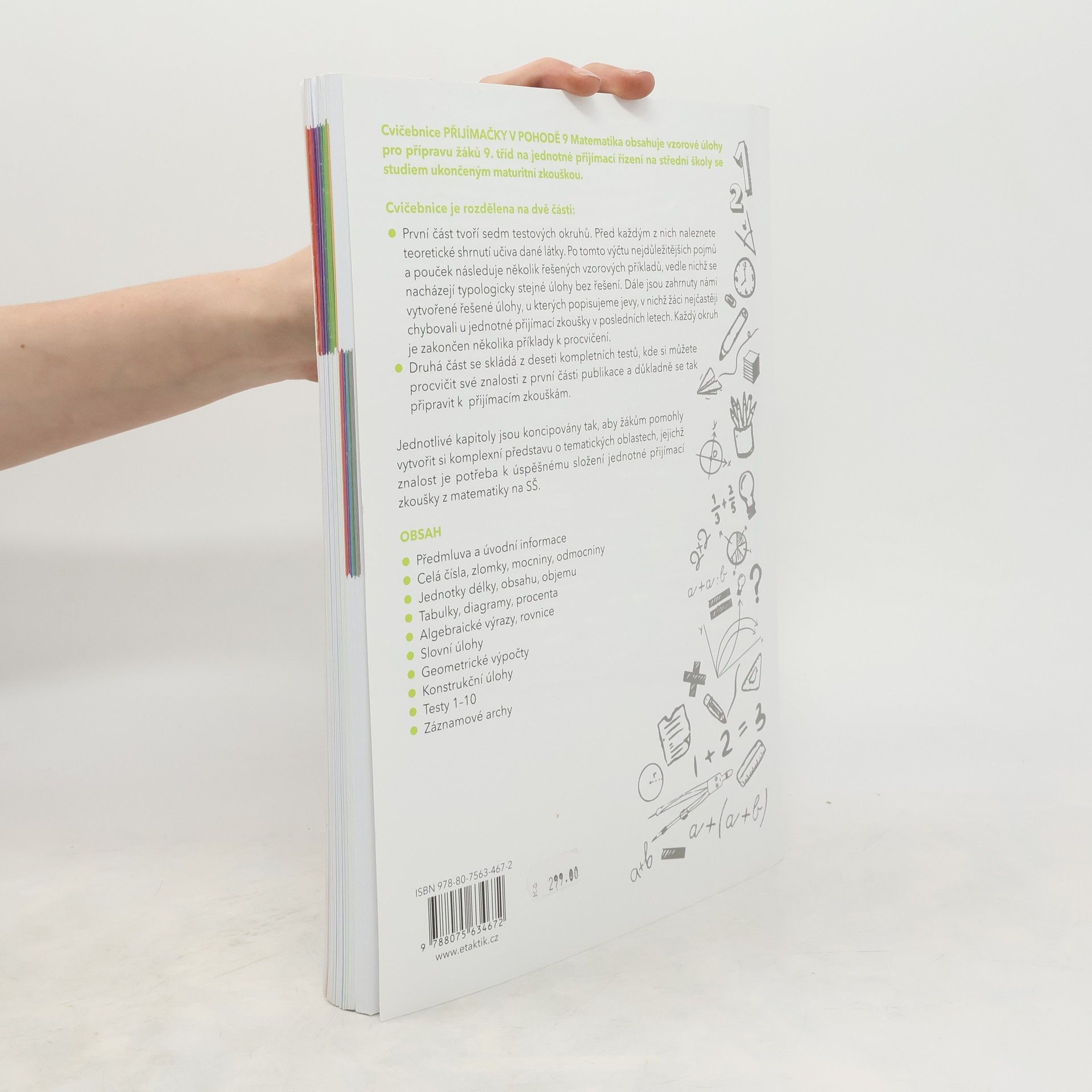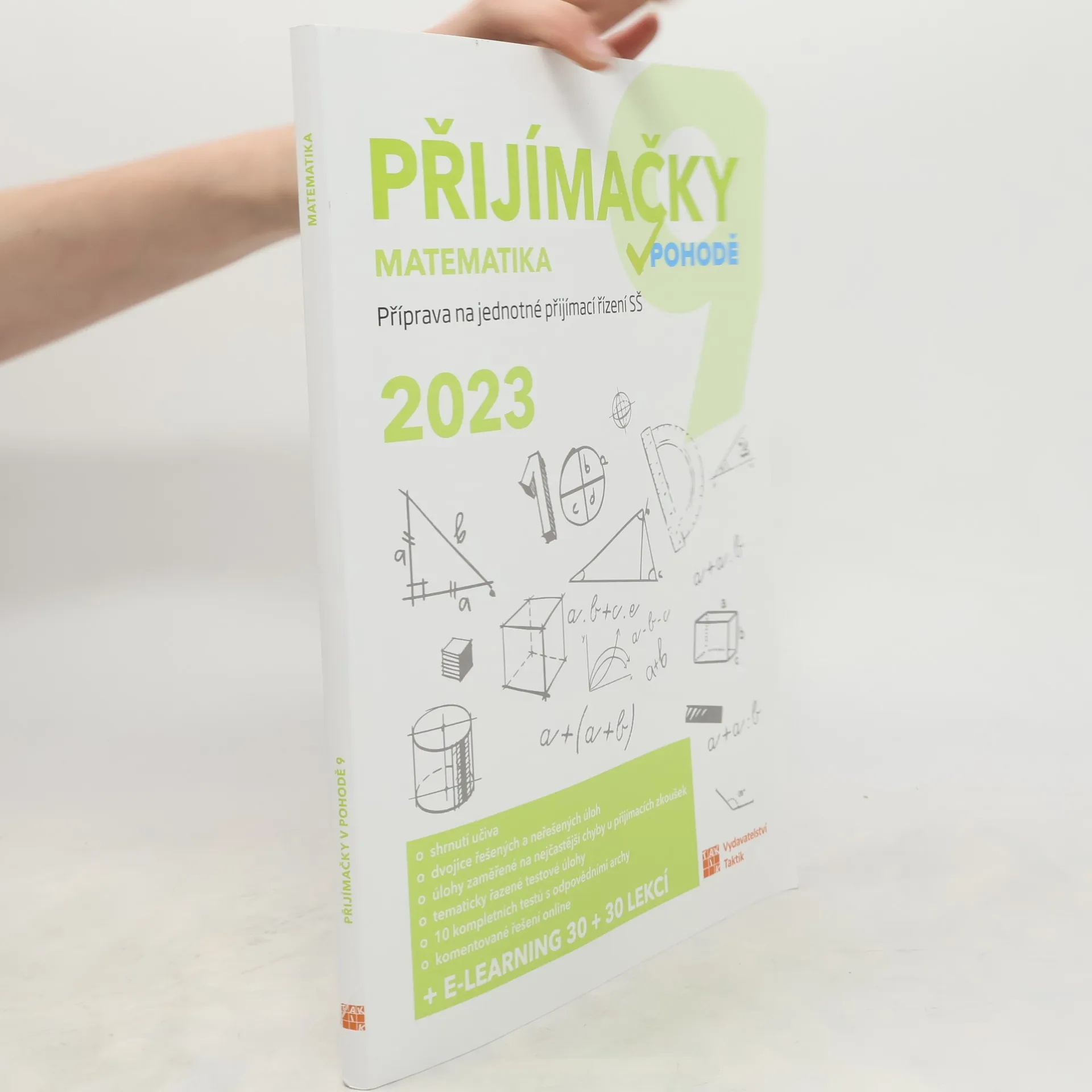 Cvičebnice Přijímačky v pohodě 9 - matematika obsahuje materiály pro komplexní přípravu na Jednotou přijímací zkoušku (JPZ) na střední školy se studiem ukončeným maturitní zkouškou. Příručka obsahuje 7 testovacích okruhů. Každý okruh se skládá ze shrnutí učiva, aby si žák mohl zopakovat potřebnou látku, dvojic řešených a neřešených úloh, kde si žák může prohlédnout vyřešené a podle nich vypočítat ty neřešené, a tím se seznámit s typologií úloh v didaktickém testu. Následují vypracované úlohy, ve kterých se v minulých letech nejvíce chybovalo s radami, jak se chybám vyhnout. Okruh uzavírají úlohy k procvičení. Nakonec si své znalosti muže žák procvičit pomocí 10 ukázkových didaktických testu i s odpovědními archy. K cvičebnici je navíc e-learning s videi vysvětlujícími učivo a dalšími úlohami. Přístup získáte po zaregistrování a zadání přístupového kódu na studium.vpohode.cz, kde najdete vypracovaná řešení a odpovědní archy k úlohám z příručky.