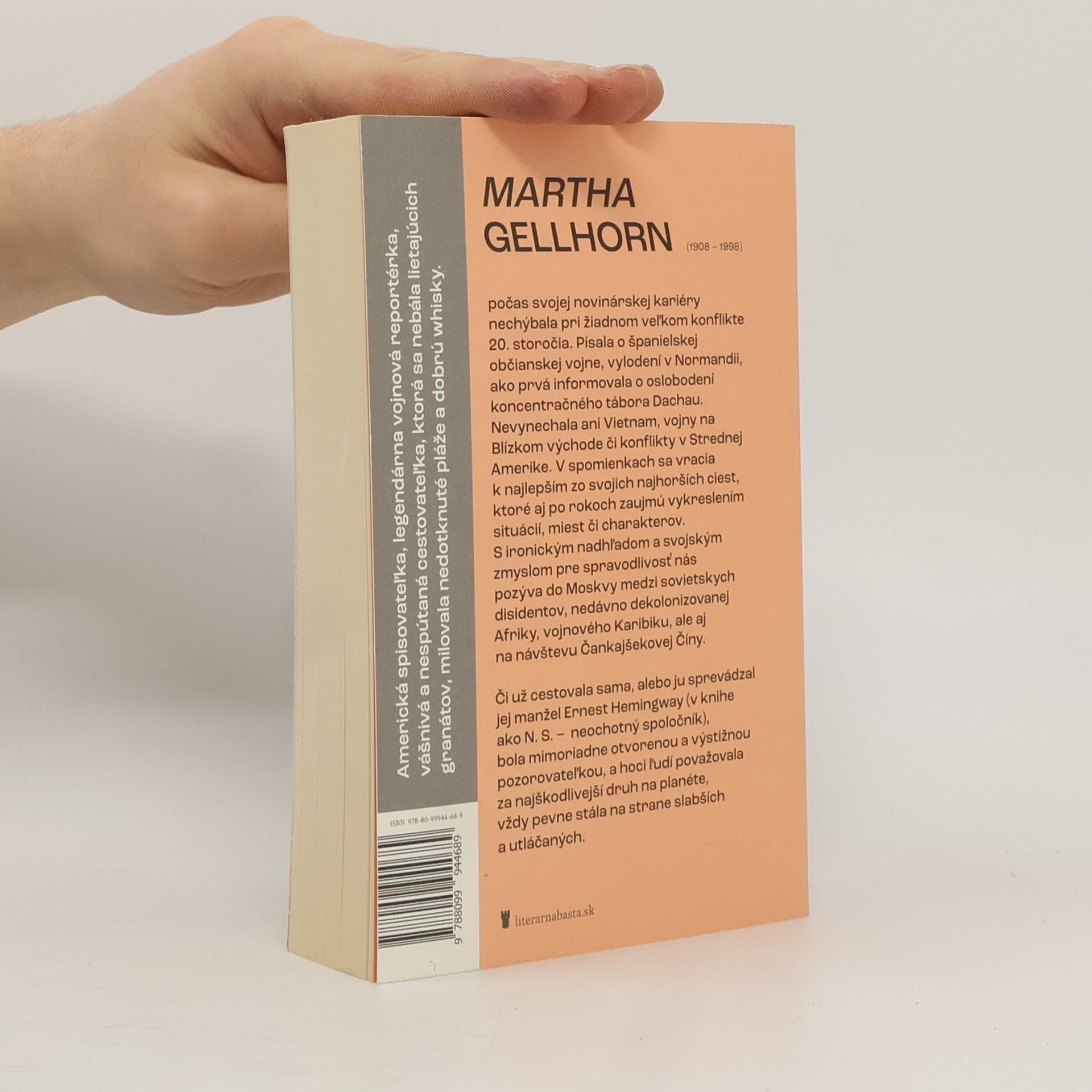 Americká spisovateľka, legendárna vojnová reportérka, vášnivá a nespútaná cestovateľka, ktorá sa nebála lietajúcich granátov, milovala nedotknuté pláže a dobrú whisky. Martha Gellhorn (1908–1998) počas svojej novinárskej kariéry nechýbala pri žiadnom veľkom konflikte 20. storočia. Písala o španielskej občianskej vojne, vylodení v Normandii, ako prvá informovala o oslobodení koncentračného tábora Dachau. Nevynechala ani Vietnam, vojny na Blízkom východe či konflikty v Strednej Amerike. V spomienkach sa vracia k najlepším zo svojich najhorších ciest, ktoré aj po rokoch zaujmú vykreslením situácií, miest či charakterov. S ironickým nadhľadom a svojským zmyslom pre spravodlivosť nás pozýva do Moskvy medzi sovietskych disidentov, nedávno dekolonizovanej Afriky, vojnového Karibiku, ale aj na návštevu Čankajšekovej Číny. Či už cestovala sama, alebo ju sprevádzal jej manžel Ernest Hemingway (v knihe ako N. S. – neochotný spoločník), bola mimoriadne otvorenou a výstižnou pozorovateľkou, a hoci ľudí považovala za najškodlivejší druh na planéte, vždy pevne stála na strane slabších a utláčaných.