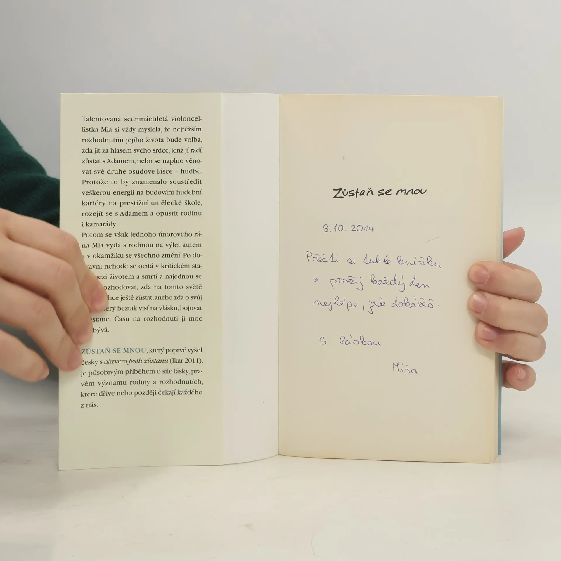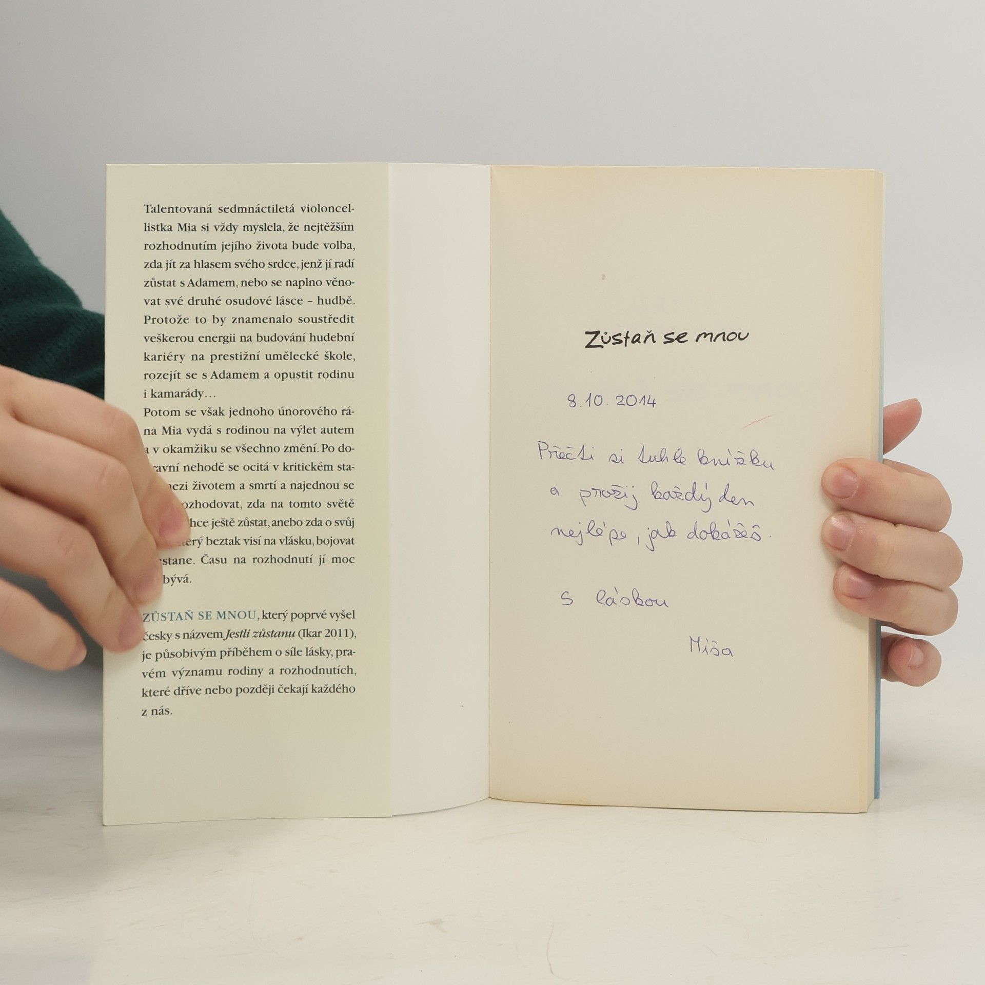 Talentovaná violoncellistka Mia si vždy myslela, že nejtěžším rozhodnutím jejího života bude volba, zda jít za hlasem svého srdce, jenž jí radí zůstat s Adamem, nebo se naplno věnovat druhé osudové lásce – hudbě –, protože to by znamenalo soustředit veškerou energii na studium na prestižní umělecké škole. Jednoho únorového rána se však všechno změní. Když se Mia po děsivé autonehodě probere, nic necítí. Vidí své mrtvé rodiče, těžce zraněného bratra – a nakonec samu sebe. Zatímco její tělo je v kómatu, ona sama může vidět a slyšet vše, co kolem děje. A najednou se musí rozhodovat, zda na tomto světě vlastně chce ještě zůstat, anebo zda o svůj život, který beztak visí na vlásku, bojovat přestane. Druhé vydání celosvětového bestselleru, který poprvé vyšel česky pod názvem Jestli zůstanu (Ikar 2011).