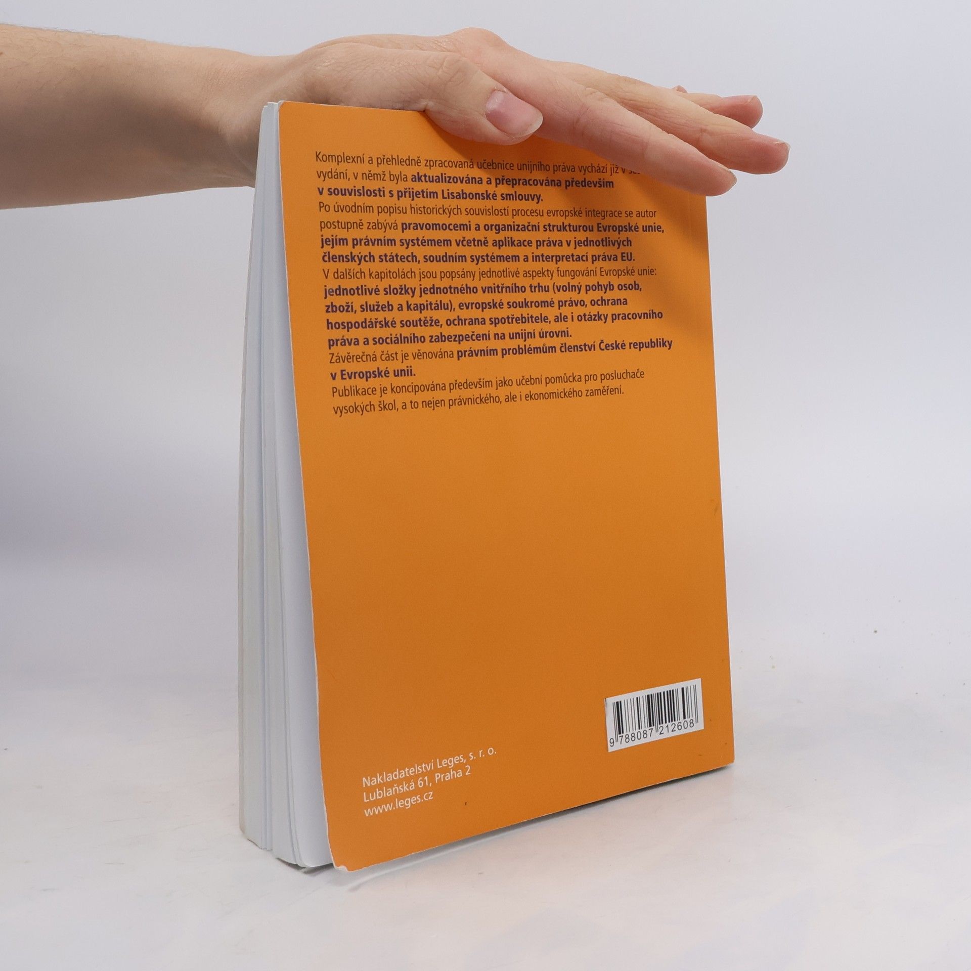Na úvod je popsán proces evropské integrace od konce 2. světové války až do současnosti. V dalších částech se autor postupně zabývá organizační strukturou Evropských společenství a Evropské unie, právním systémem Společenství včetně aplikace práva, jednotlivými složkami jednotného vnitřního trhu (volný pohyb osob, zboží, služeb a kapitálu), hospodářskou soutěží, ochranou spotřebitele a souvisícími otázkami. Závěrečná část je věnována právním problémům členství České republiky v Evropské unii. Učebnice je koncipována jako učební pomůcka studentům ekonomických vysokých škol, ale pro své komplexní a přehledné zpracování ji ocení i studenti právnických fakult.