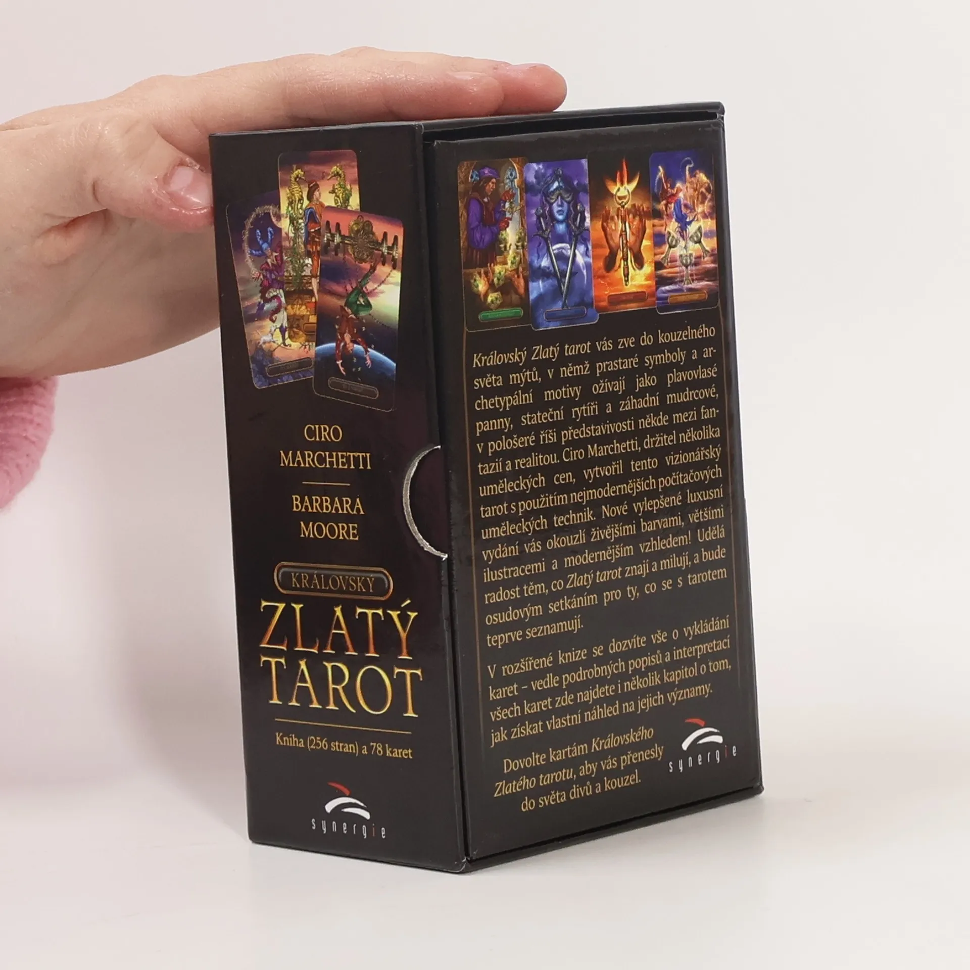 Královský Zlatý tarot vás zve do kouzelného světa mýtů, v němž prastaré symboly a archetypální motivy ožívají jako plavovlasé panny, stateční rytíři a záhadní mudrcové, v pološeré říši představivosti někde mezi fantazií a realitou. Ciro Marchetti, držitel několika uměleckých cen, vytvořil tento vizionářský tarot s použitím nejmodernějších počítačových uměleckých technik. Nové vylepšené luxusní vydání vás okouzlí živějšími barvami, většími ilustracemi a modernějším vzhledem! Udělá radost těm, co Zlatý tarot znají a milují, a bude osudovým setkáním pro ty, co se s tarotem teprve seznamují. Dovolte kartám Královského Zlatého tarotu, aby vás přenesly do světa divů a kouzel.