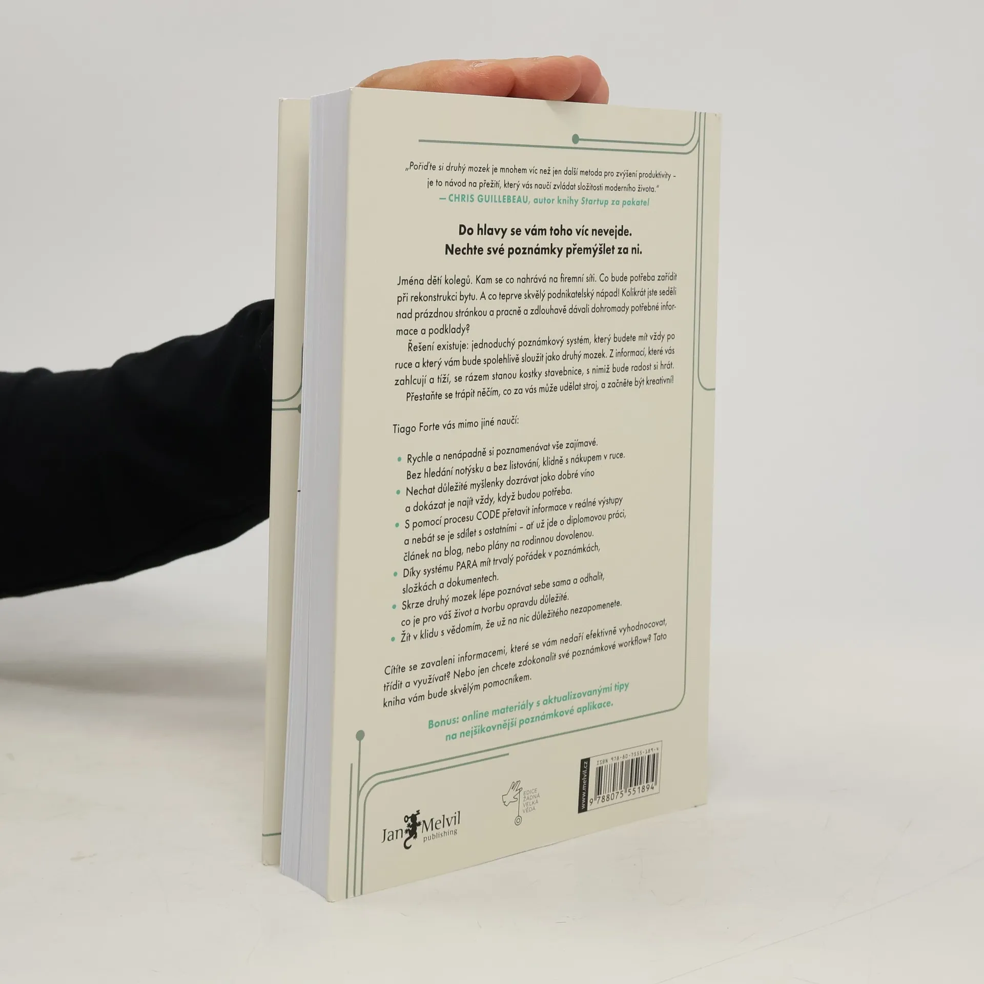 Poprvé v historii mají lidé snadný přístup k veškerému vědění, které je jen pár kliknutí daleko. Tato dostupnost však často vede k pocitu zahlcení a paralyzace množstvím informací, názorů a možností, které nás obklopují. Místo efektivní práce často jen ukládáme články a videa na později, aniž bychom se k nim někdy vrátili. Množství drobných povinností a myšlenek nám brání věnovat se kreativní činnosti, což je škoda. Řešení spočívá v vytvoření druhého mozku. Autor přichází s praktickou metodou, jak si zřídit jednoduchý a přehledný systém poznámek, který usnadní vyhledávání potřebných informací. Tento systém vám umožní nahlížet na věci z různých perspektiv, uvolní vám ruce pro kreativní projekty a zajistí, že už nikdy nezačnete od nuly. Kniha vás provede dvěma jednoduchými systémy, díky nimž se naučíte třídit, ukládat a efektivně pracovat s informacemi. Pomůže vám uspořádat digitální svět tak, aby vás nezahlcoval, a uvolní prostor pro váš tvůrčí potenciál. Všechny užitečné informace budete mít na dosah v momentě, kdy je skutečně potřebujete.