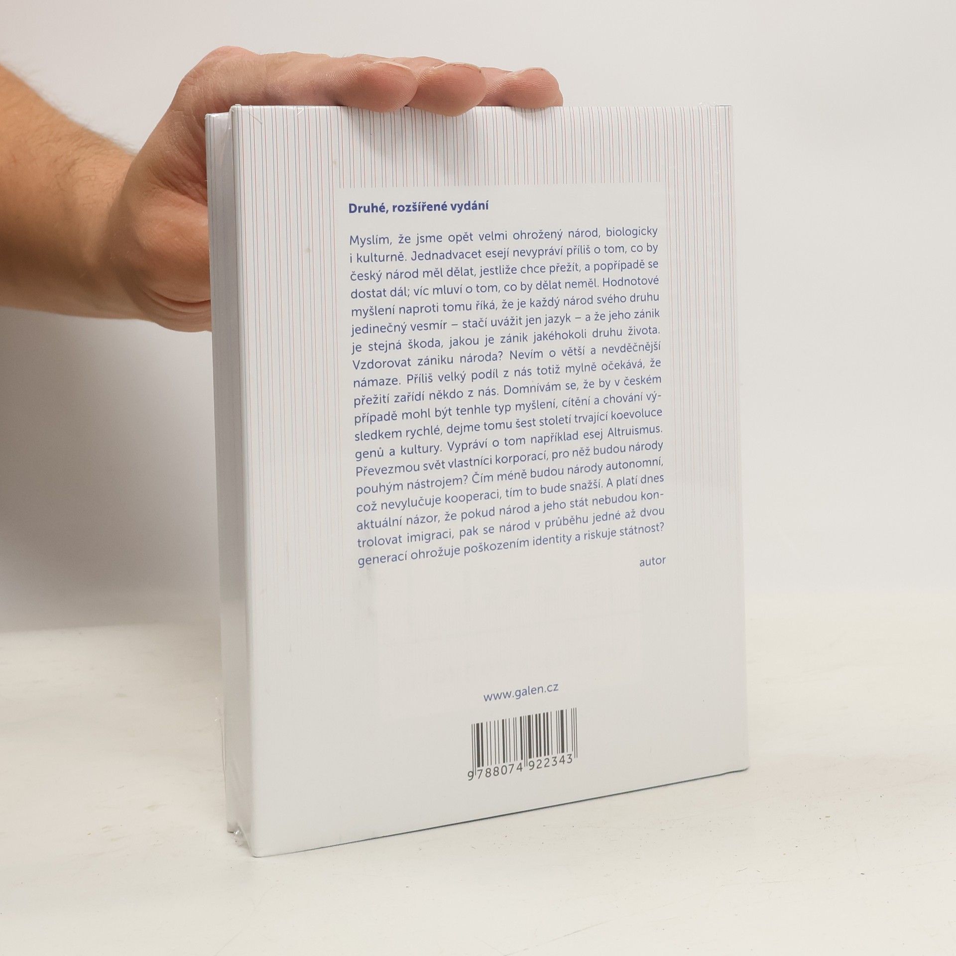 Myslím, že jsme opět velmi ohrožený národ, biologicky i kulturně. Jedenadvacet esejí nevypráví příliš o tom, co by český národ měl dělat, jestliže chce přežít, a popřípadě se dostat dál; víc mluví o tom, co by dělat neměl. Hodnotové myšlení naproti tomu říká, že je každý národ svého druhu jedinečný vesmír – stačí uvážit jen jazyk – a že jeho zánik je stejná škoda, jakou je zánik jakéhokoli druhu života. Vzdorovat zániku národa? Nevím o větší a nevděčnější námaze. Příliš velký podíl z nás totiž mylně očekává, že přežití zařídí někdo z nás. Domnívám se, že by v českém případě mohl být tenhle typ myšlení, cítění a chování výsledkem rychlé, dejme tomu šest století trvající koevoluce genů a kultury. Vypráví o tom například esej Altruismus. Převezmou svět vlastníci korporací, pro něž budou národy pouhým nástrojem? Čím méně budou národy autonomní, což nevylučuje kooperaci, tím to bude snažší. A platí dnes aktuální názor, že pokud národ a jeho stát nebudou kontrolovat imigraci, pak se národ v průběhu jedné až dvou generací ohrožuje poškozením identity a riskuje státnost? autor