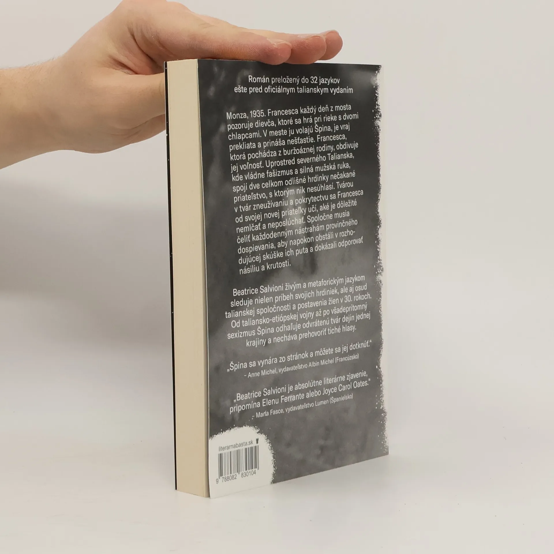Príbeh nezabudnuteľného priateľstva z fašistického Talianska, ktorý preložili do 32 jazykov ešte pred jeho oficiálnym vydaním.Monza, 1935. Francesca každý deň z mosta pozoruje dievča, ktoré sa hrá pri rieke s dvomi chlapcami. V meste ju volajú Špina, je vraj prekliata a prináša nešťastie. Francesca, ktorá pochádza z buržoáznej rodiny, obdivuje jej voľnosť. Uprostred severného Talianska, kde vládne fašizmus a silná mužská ruka, spojí dve celkom odlišné hrdinky nečakané priateľstvo, s ktorým nik nesúhlasí. Tvárou v tvár zneužívaniu a pokrytectvu sa Francesca od svojej novej priateľky učí, aké je dôležité nemlčať a neposlúchať. Spoločne musia čeliť každodenným nástrahám provinčného dospievania, aby napokon obstáli v rozhodujúcej skúške ich puta a dokázali odporovať násiliu a krutosti.Beatrice Salvioni živým a metaforickým jazykom sleduje nielen príbeh svojich hrdiniek, ale aj osud talianskej spoločnosti a postavenia žien v 30. rokoch. Od taliansko-etiópskej vojny až po všadeprítomný sexizmus Špina odhaľuje odvrátenú tvár dejín jednej krajiny a necháva prehovoriť tiché hlasy.
