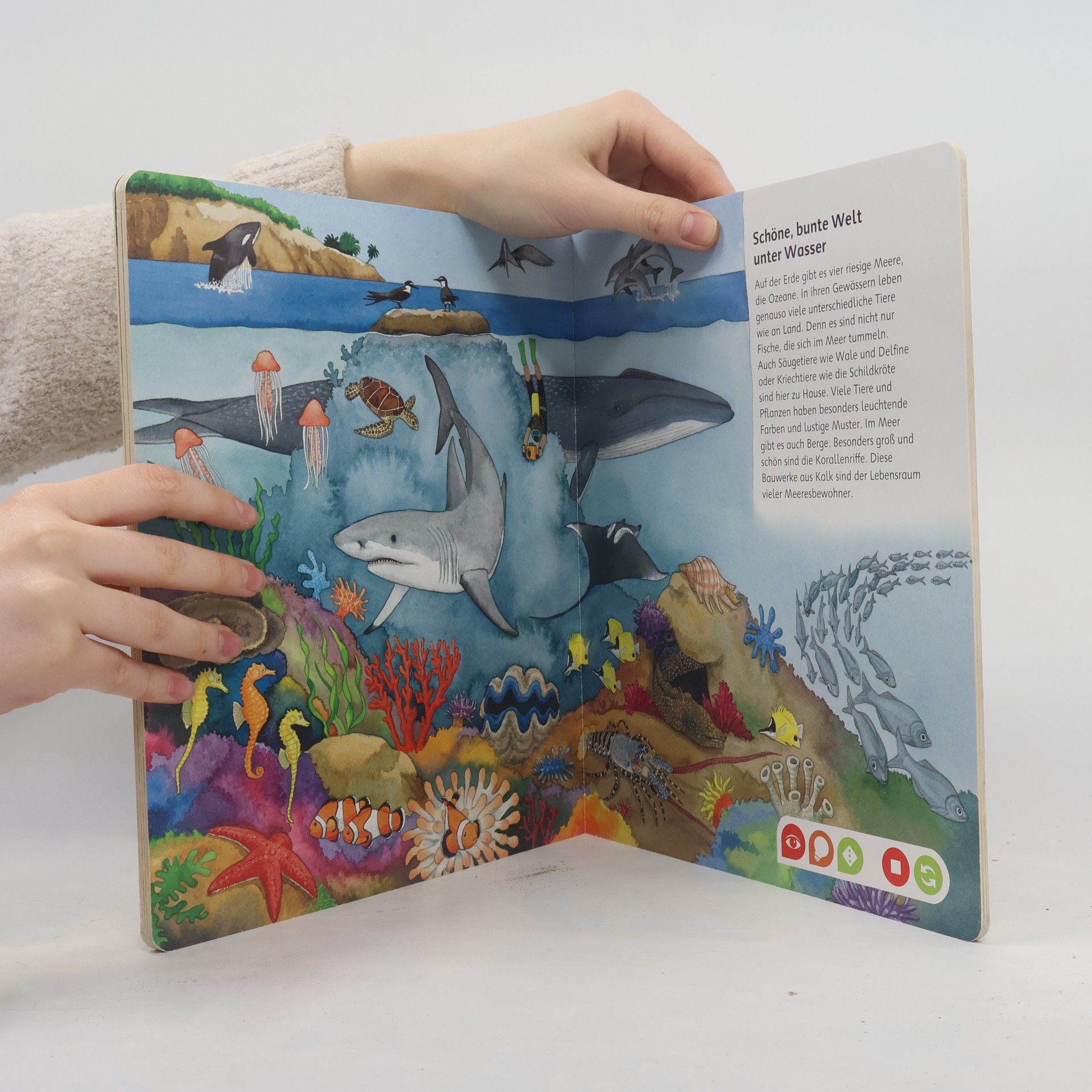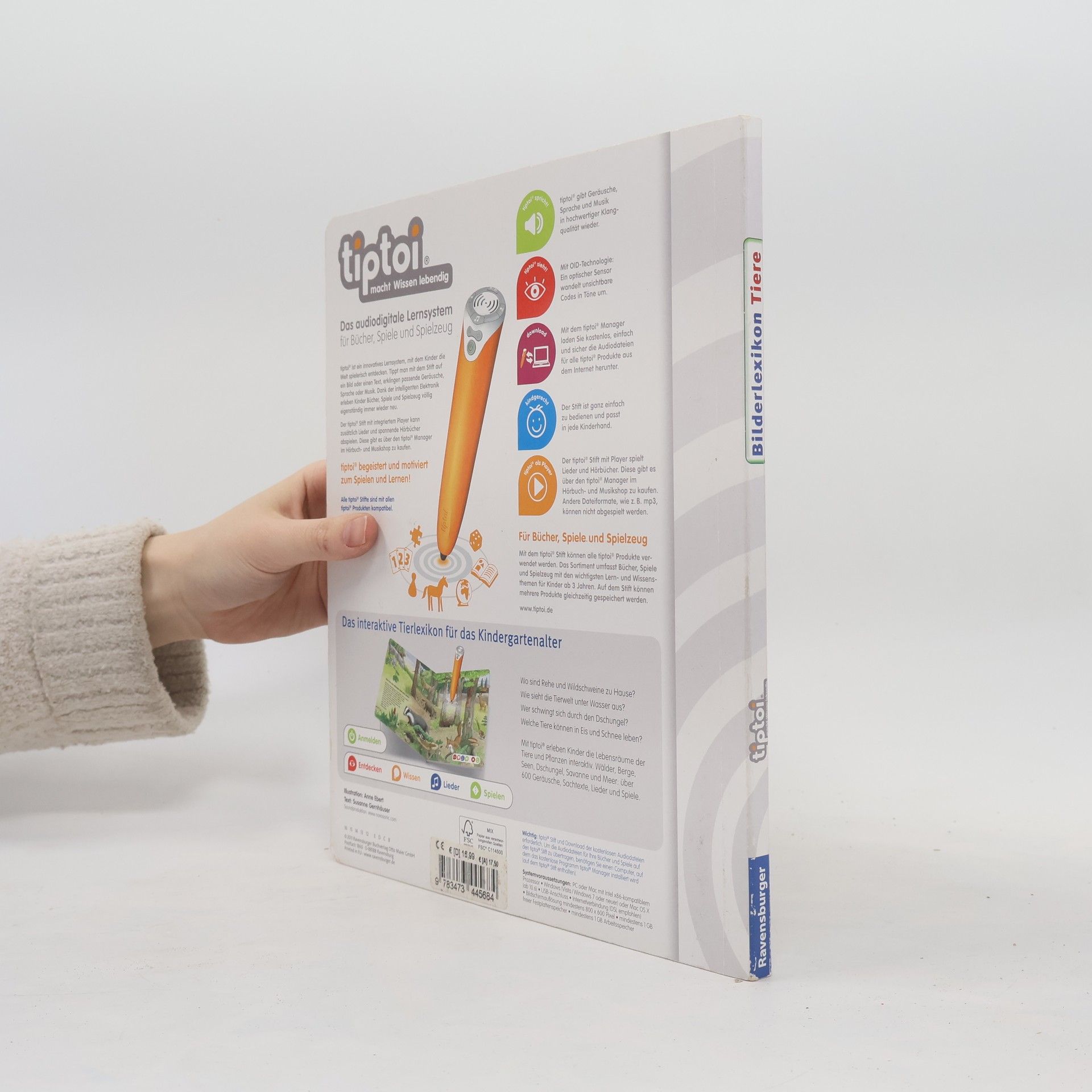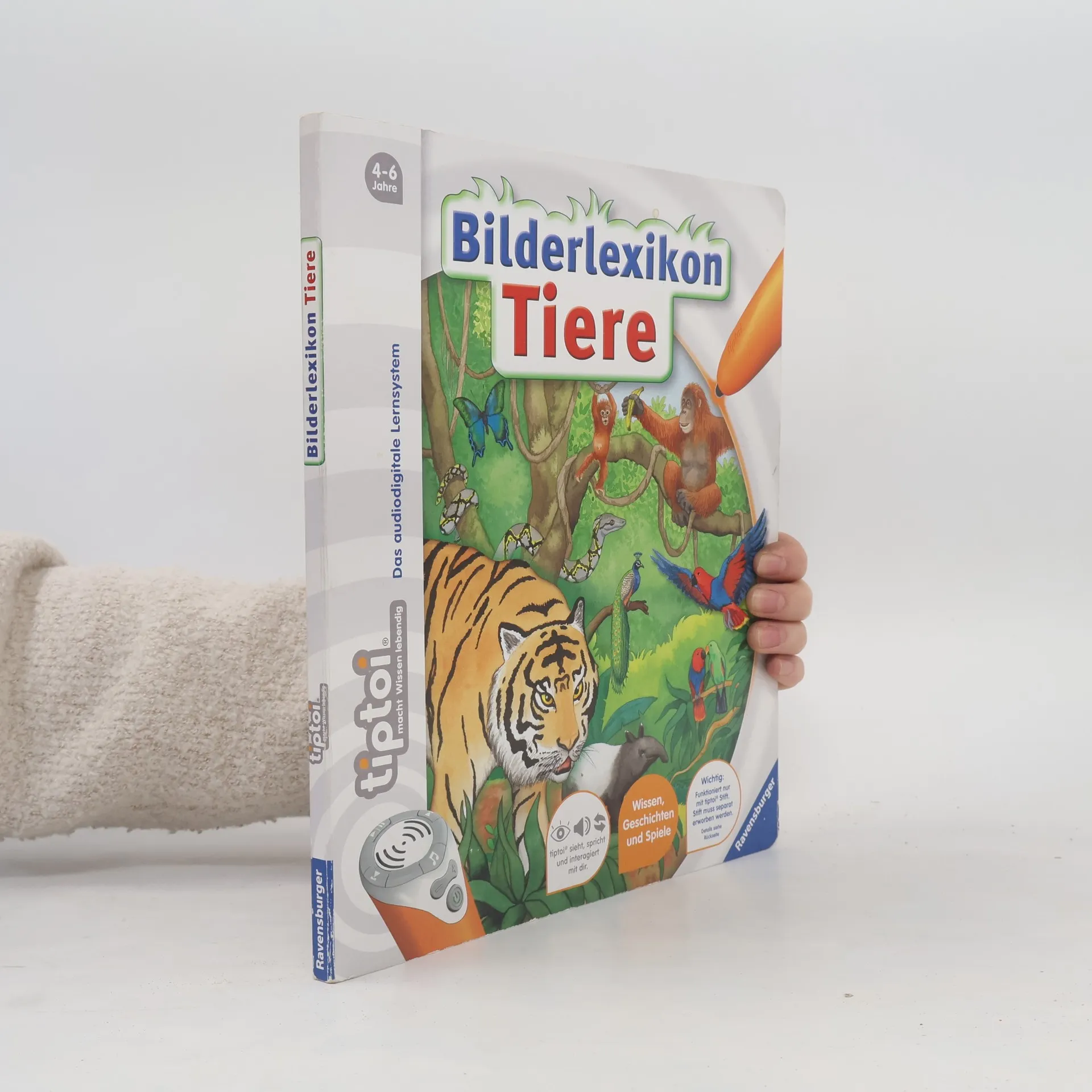 Das interaktive Tierlexikon für das Kindergartenalter Der tiptoi-Stift nimmt kleine Entdecker mit auf eine aufregende Reise ins Tierreich. Ob in den Bergen, der Arktis und Antarktis, im Wald, am Wasser, im Meer oder Dschungel: Die Bewohner unterschiedlichster Lebensräume warten darauf entdeckt zu werden - und mit ihnen viele spannende Geräusche, Geschichten, Lieder und Spiele. Kindgerecht wird so erstes Sachwissen rund um die vielfältige Tierwelt erlebbar gemacht! Wo sind Rehe und Wildschweine zu Hause? Wie sieht die Tierwelt unter Wasser aus? Wer lebt in der Savanne? In diesem Bilderbuch lernen Kinder ab 4 Jahren interaktiv die Welt der Tiere kennen. Spannendes Sachwissen, authentische Geräusche und kurze Geschichten lassen die detailreichen Illustrationen lebendig werden. Spielerisch wird die Konzentrationsfähigkeit gefördert und die Neugier beim selbstständigen Ausprobieren und Lernen geweckt. tiptoi-Stift nicht enthalten. Muss separat erworben werden.