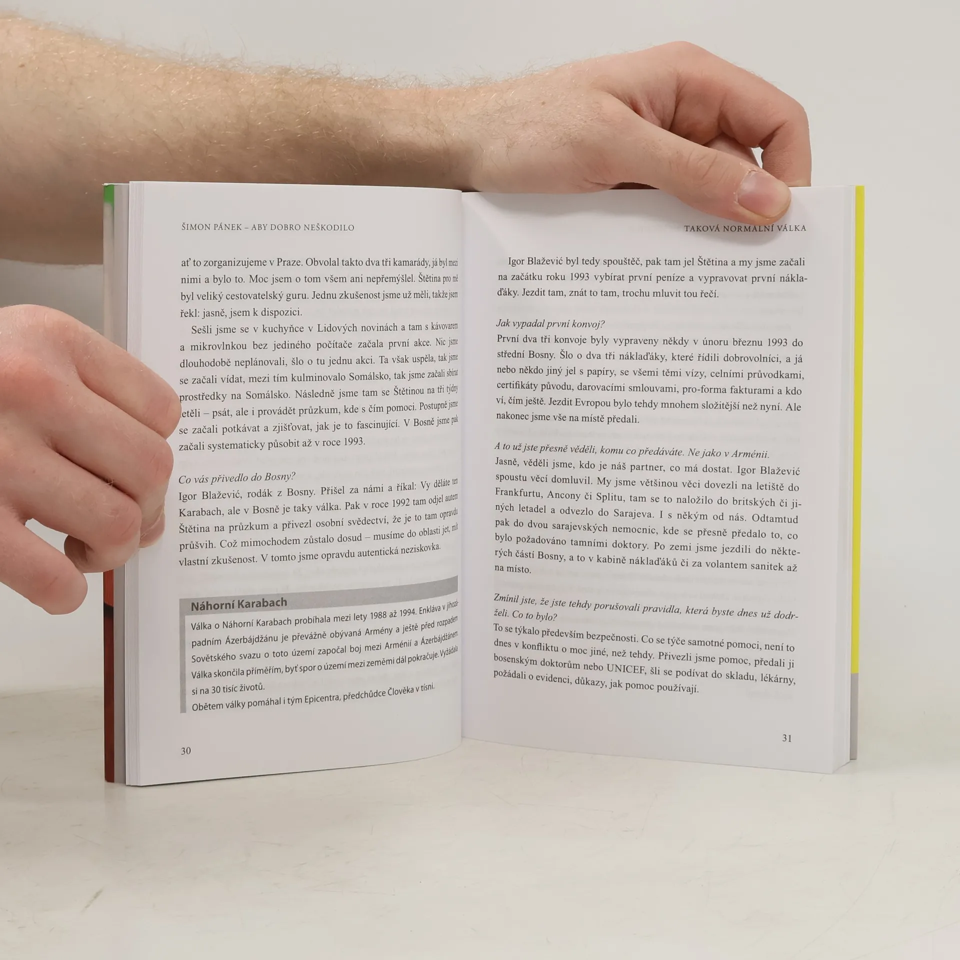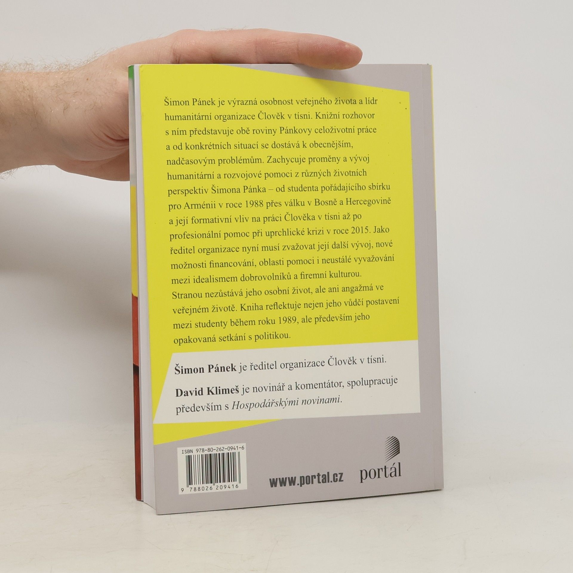 Šimon Pánek je výrazná osobnost veřejného života a humanitární manažer. Knižní rozhovor představuje obě roviny jeho celoživotní práce a od konkrétních životních situací se dostává k obecnějším, nadčasovým problémům. Rozhovor zachycuje proměny a vývoj humanitární pomoci z různých životních perspektiv Šimona Pánka – od studenta pořádajícího sbírku pro Arménii v roce 1988 přes vznik Nadace Lidových novin až po profesionální pomoc prostřednictvím Člověka v tísni. Jako řídící manažer Člověka v tísni nyní musí zvažovat další vývoj organizace, nové možnosti financování, nové oblasti pomoci i neustálé vyvažování mezi idealismem dobrovolníků a firemní kulturou. Stranou nezůstává ani jeho angažmá ve veřejném životě. Kniha reflektuje nejen jeho vůdčí postavení mezi studenty během roku 1989, ale především jeho opakované návraty k politice, které však dosud nikdy neskončily kandidaturou na politickou funkci. Šimon Pánek je ředitel organizace Člověk v tísni. David Klimeš je novinář a komentátor, spolupracuje hlavně s Hospodářskými novinami.