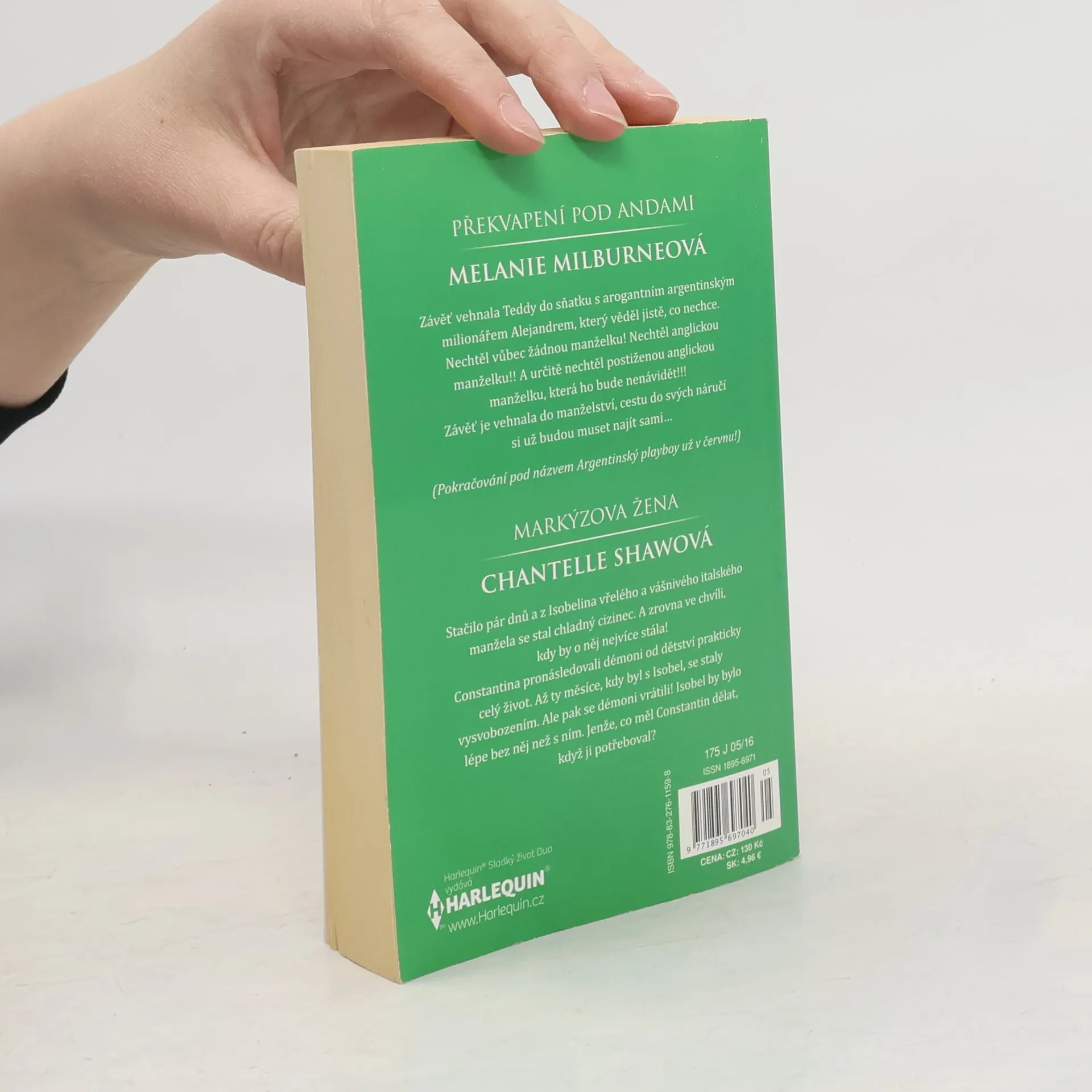 Překvapení pod Andami Závěť vehnala Teddy do sňatku s arogantním argentinským milionářem Alejandrem, který věděl jistě, co nechce. Nechtěl vůbec žádnou manželku! Nechtěl anglickou manželku!! A určitě nechtěl postiženou anglickou manželku, která ho bude nenávidět!!! Závěť je vehnala do manželství, cestu do svých náručí si už budou muset najít sami… (Pokračování pod názvem Argentinský playboy už v červnu!) Markýzova žena Stačilo pár dnů a z Isobelina vřelého a vášnivého italského manžela se stal chladný cizinec. A zrovna ve chvíli, kdy by o něj nejvíce stála! Constantina pronásledovali démoni od dětství prakticky celý život. Až ty měsíce, kdy byl s Isobel, se staly vysvobozením. Ale pak se démoni vrátili! Isobel by bylo lépe bez něj než s ním. Jenže, co měl Constantin dělat, když ji potřeboval?