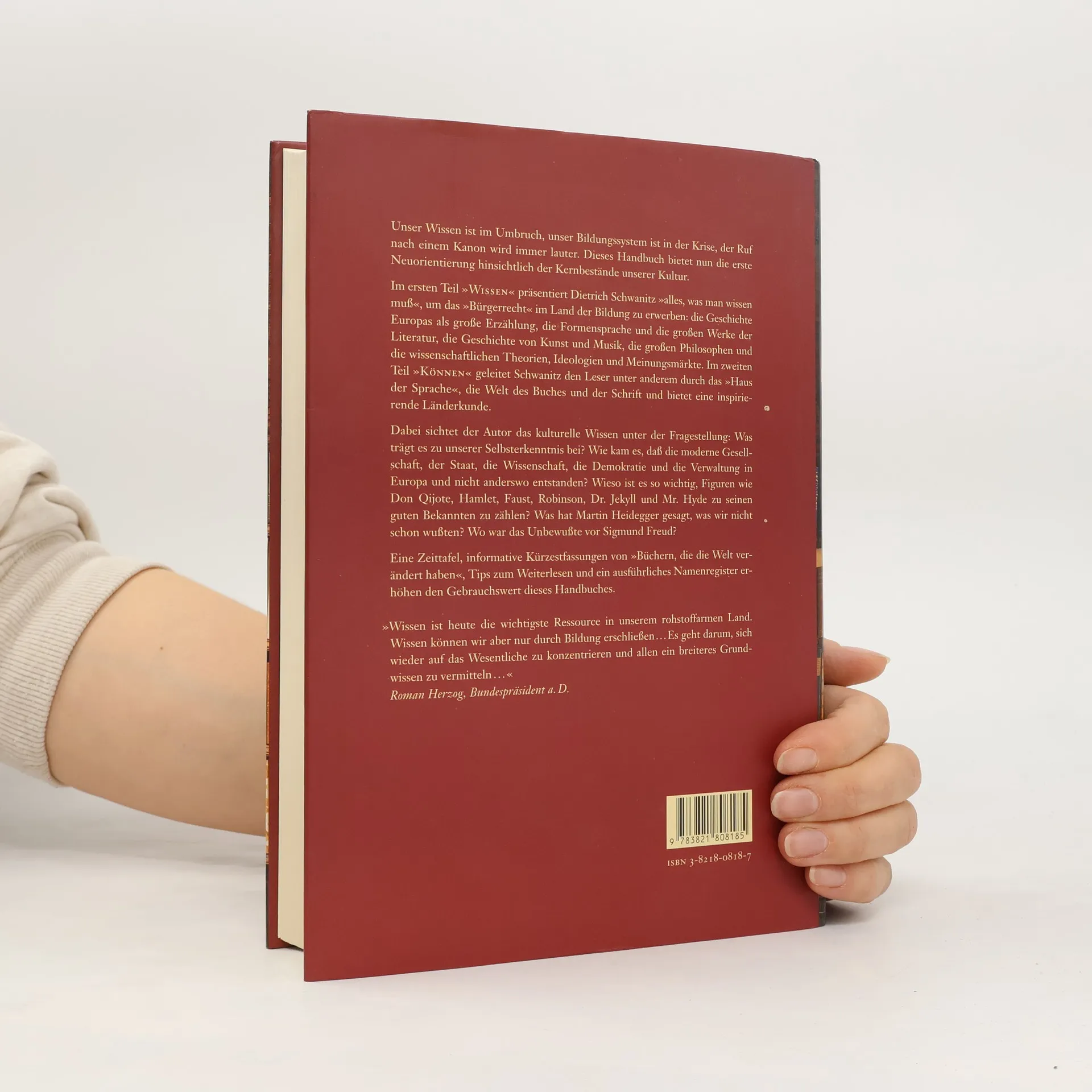 Ein Bildungskanon, der aufzeigt, was wesentlich ist. Schwanitz hat unser Allgemeinwissen durchleuchtet und unser kulturelles Gedächtnis neu ausgerichtet. Er beseitigt die Barrieren, die vielen den Zugang zu unserer Kultur versperren, und unterdrückt jeden Bildungsdünkel. In Zeiten eines Bildungssystems in der Krise wird der Ruf nach einem Kanon lauter. Dieses Handbuch bietet eine Neuorientierung zu den Kernbeständen unserer Kultur. Im ersten Teil „Wissen“ präsentiert Schwanitz alles, was man wissen muss, um das „Bürgerrecht“ im Land der Bildung zu erwerben: die große Erzählung der europäischen Geschichte, die Formensprache und bedeutende literarische Werke, Kunst- und Musikgeschichte, Philosophen sowie wissenschaftliche Theorien und Ideologien. Der zweite Teil „Können“ führt den Leser durch das „Haus der Sprache“, die Welt des Buches und der Schrift und bietet inspirierende Länderkunde. Schwanitz fragt, was unser kulturelles Wissen zur Selbsterkenntnis beiträgt und untersucht die Ursprünge moderner Gesellschaften in Europa. Er beleuchtet die Bedeutung bekannter literarischer Figuren und bietet informative Zusammenfassungen von „Büchern, die die Welt verändert haben“. Eine Zeittafel, Tipps zum Weiterlesen und ein ausführliches Namenregister erhöhen den Nutzen dieses Handbuchs.