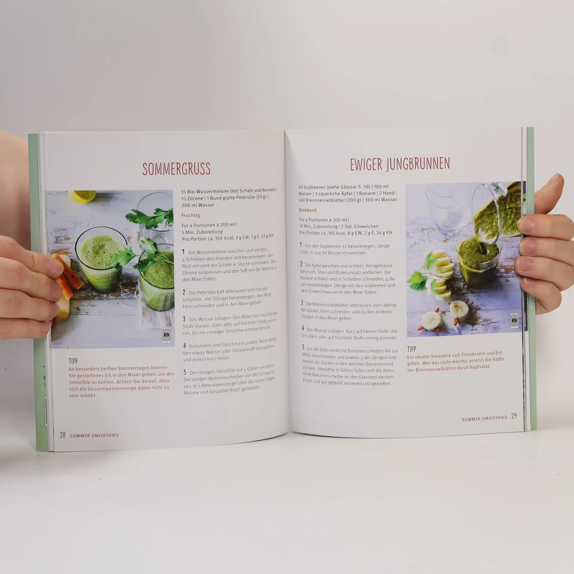 Eingeführte Reihe, seit 2013 in neuem Layout: ansprechende, zeitgemäe︢ Aufmachung und handliches Format, nun mit einer kostenlosen App zum Sammeln der Lieblingsrezepte. Geblieben sind die ausklappbaren Umschlagseiten, hier mit Basics, Tipps, weiteren Rezepten und Saisonkalender. Im Hauptteil werden rund 40 Rezepte für die "Zauberdrinks" aus dem Mixer vorgestellt, für jede Jahreszeit den passenden Power-Drink. Eingeteilt in die 4 Jahreszeiten findet man hier Drinks mit etwas ausgefallenen Namen wie Vitales Liebesglück, Grüne Verführung, Rapunzels grünes Haar oder Frostschutz für die Zellen etc. Vorab Basiswissen und Wildkräuter im Porträt. - Eine hübsch aufgemachte, gut brauchbare kleine Sammlung mit klaren Arbeitsanleitungen und Farbfoto zu jedem Rezept. Der gleichnamige Titel aus der Reihe (ID-A 10/13) bietet andere Rezepte. (2)