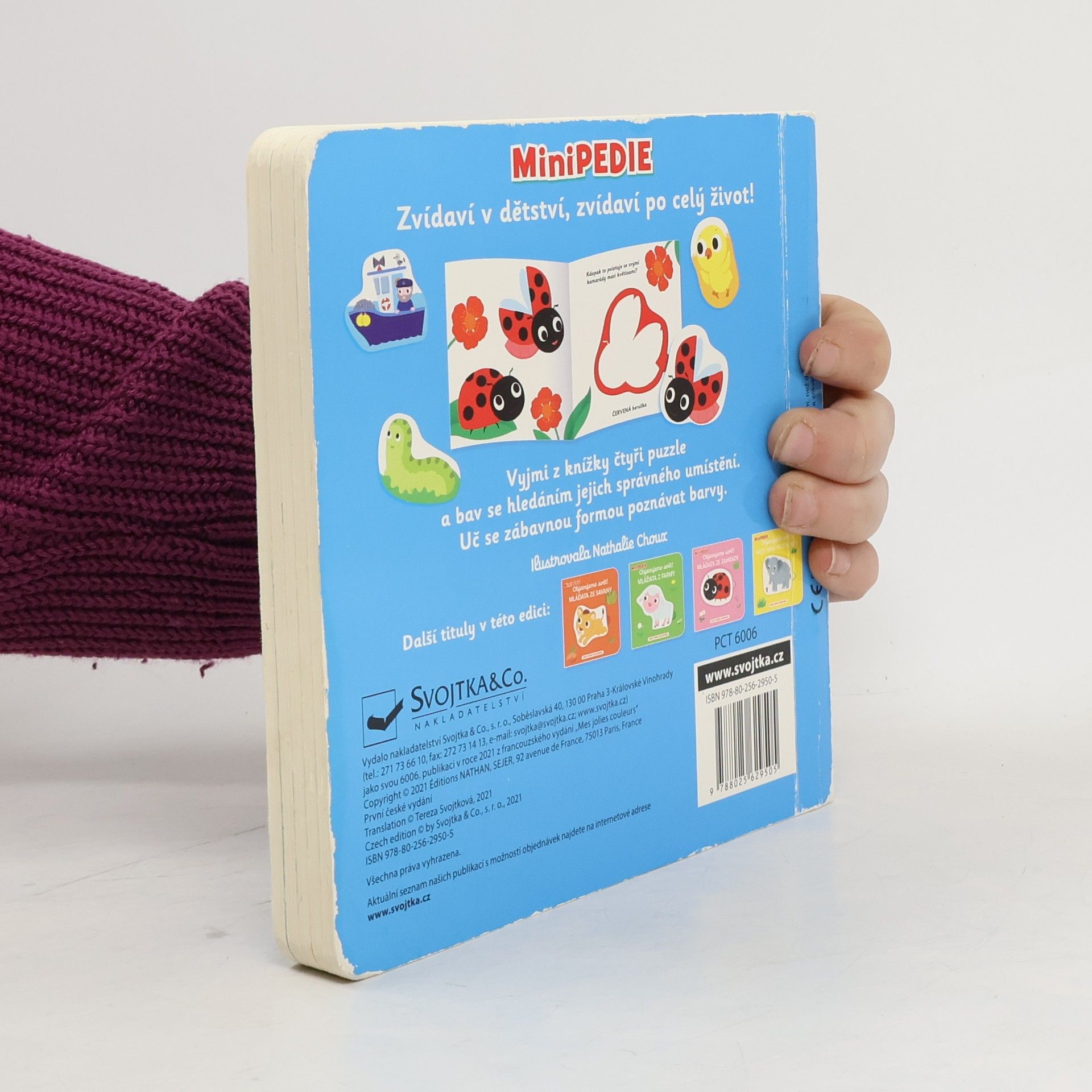 Jakou barvu má tato krásná loďka ve vlnách? A jakou beruška a mlsná housenka v listech? Pojď prozkoumat svět barev, bav se vyndáváním a zandáváním puzzle a uč se barvy se zvířátky v tomto roztomile ilustrovaném leporelu! Knížka s pevnými stránkami, rozkošnými obrázky a krátkými popiskyobsahuje velké kusy puzzle a je vhodná pro nejmenší děti, které si procvičí jemnou motoriku a fantazii. Zábavné puzzle dětem prohlížení a čtení mile oživí. Knížka s prvky Montessori.