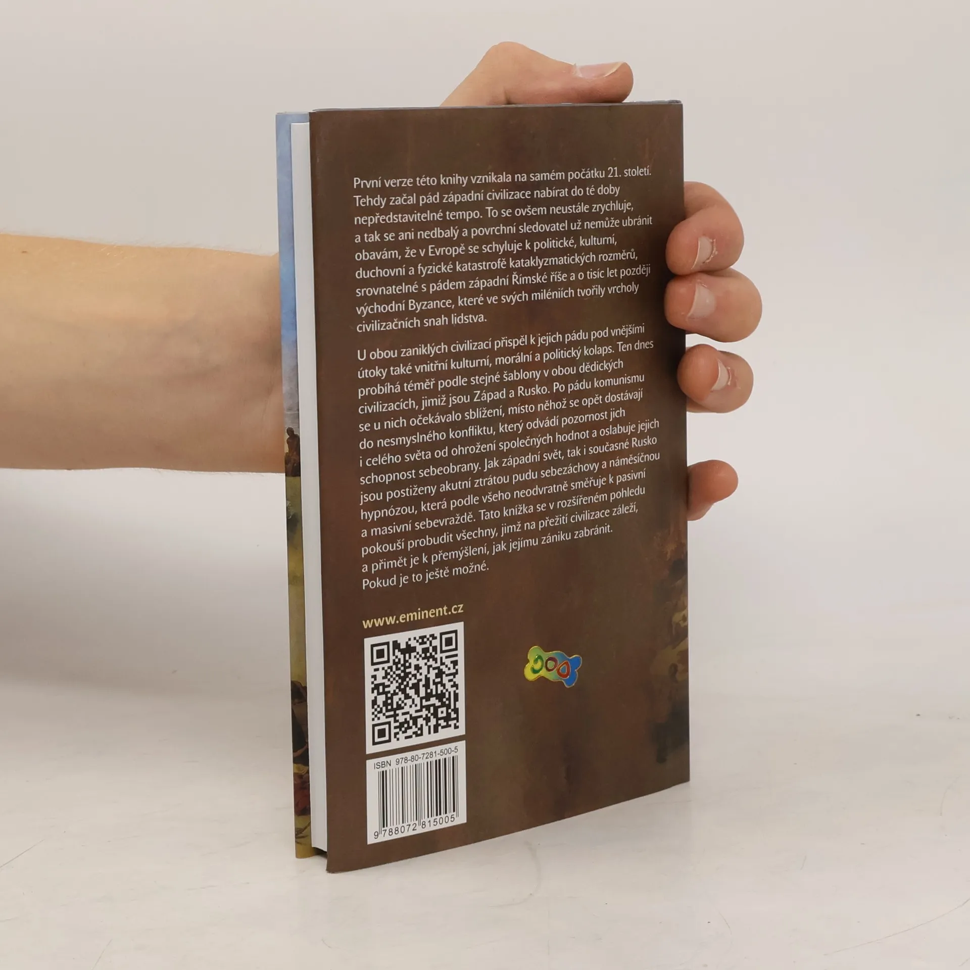 První verze této knihy vznikala na samém počátku 21. století. V té době začal pád západní civilizace nabírat do té doby nepředstavitelné tempo. To se ovšem neustále zrychluje, a tak se ani nedbalý a povrchní sledovatel už nemůže ubránit obavám, že v Evropě se schyluje k politické, kulturní, duchovní a fyzické katastrofě kataklyzmatických rozměrů, srovnatelné s pádem západní Římské říše a o tisíc let později východní Byzance, které ve svých miléniích tvořily vrcholy civilizačních snah lidstva. U obou zaniklých civilizací přispěl k jejich pádu pod vnějšími útoky také vnitřní kulturní, morální a politický kolaps. Ten dnes probíhá téměř podle stejné šablony v obou dědických civilizacích, jimiž jsou Západ a Rusko. Po pádu komunismu se u nich očekávalo sblížení, místo něhož se opět dostávají do nesmyslného konfliktu, který odvádí pozornost jich i celého světa od ohrožení společných hodnot a oslabuje jejich schopnost sebeobrany. Jak západní svět, tak i současné Rusko jsou postiženy akutní ztrátou pudu sebezáchovy a náměsíčnou hypnózou, která podle všeho neodvratně směřuje k pasivní a masivní sebevraždě. Tato knížka se v rozšířeném pohledu pokouší probudit všechny, jimž na přežití civilizace záleží, a přimět je k přemýšlení, jak jejímu zániku zabránit. Pokud je to ještě možné.