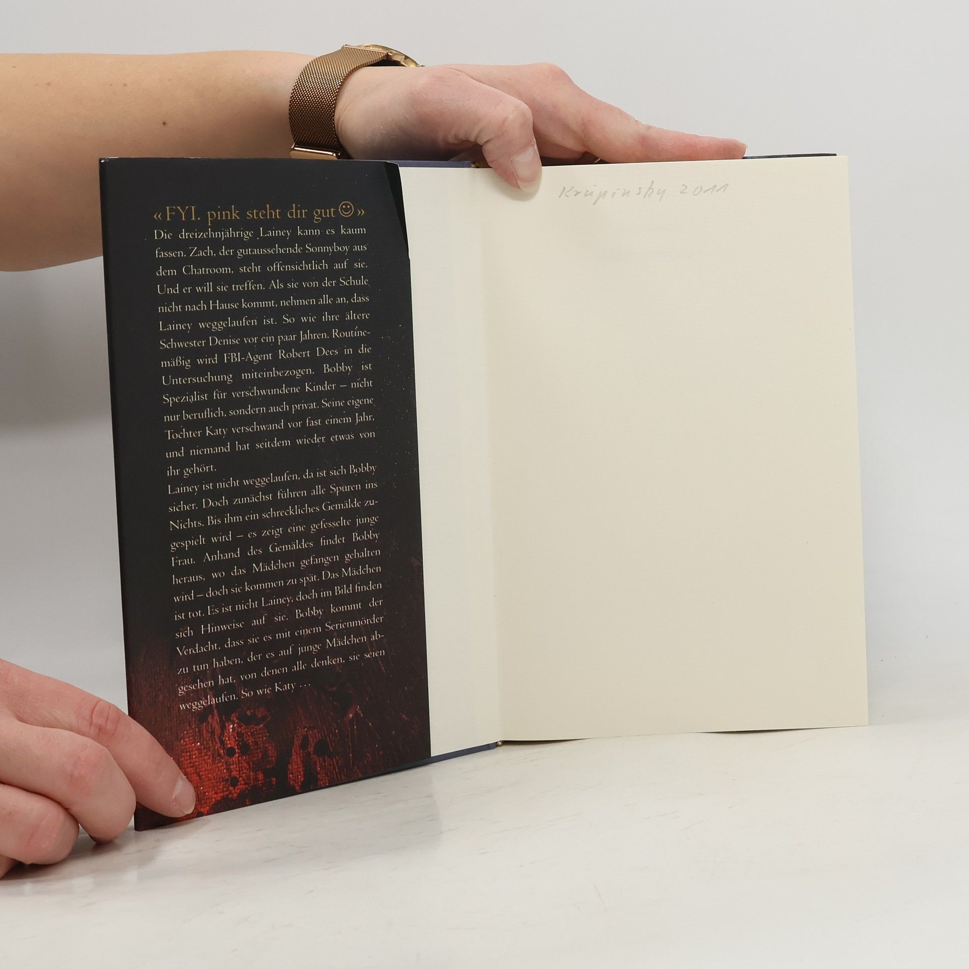«FYI. pink steht dir gut (Smiley)»Die dreizehnjährige Lainey kann es kaum fassen. Zach, der gutaussehende Sonnyboy aus dem Chatroom, steht offensichtlich auf sie. Und er will sie treffen. Als sie von der Schule nicht nach Hause kommt, nehmen alle an, dass Lainey weggelaufen ist. So wie ihre ältere Schwester Denise vor ein paar Jahren. Routinemäßig wird FBI-Agent Robert Dees in die Untersuchung miteinbezogen. Bobby ist Spezialist für verschwundene Kinder – nicht nur beruflich, sondern auch privat. Seine eigene Tochter Katy verschwand vor fast einem Jahr, und niemand hat seitdem wieder etwas von ihr gehört.Lainey ist nicht weggelaufen, da ist sich Bobby sicher. Doch zunächst führen alle Spuren ins Nichts. Bis ihm ein schreckliches Gemälde zugespielt wird – es zeigt eine gefesselte junge Frau. Anhand des Gemäldes findet Bobby heraus, wo das Mädchen gefangen gehalten wird – doch sie kommen zu spät. Das Mädchen ist tot. Es ist nicht Lainey, doch im Bild finden sich Hinweise auf sie. Bobby kommt der Verdacht, dass sie es mit einem Serienmörder zu tun haben, der es auf junge Mädchen abgesehen hat, von denen alle denken, sie seien weggelaufen. So wie Katy …