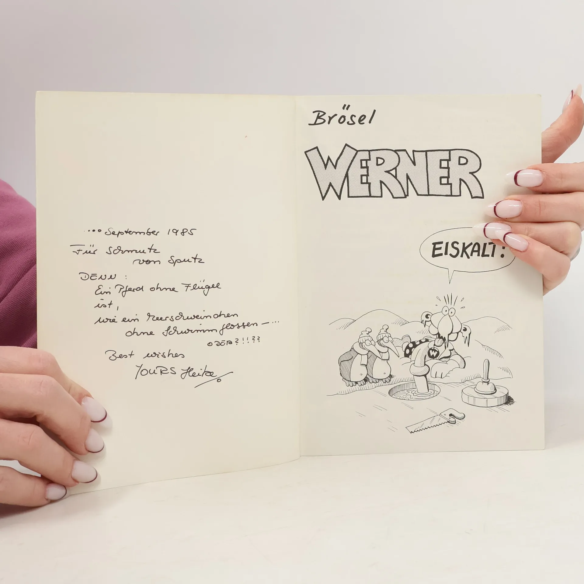 WERNER – EISKALT! Neuauflage in HDO steht an! Nach heißen und eiskalten Zeiten für Werners Zeichner Brösel alias Rötger Feldmann drückt er im eigenen Bröseline Verlach jetzt wieder voll auf die Tube! Nach dem Verlachsdebüt WERNER – WAT NU!? (Band 13, 2018) – dem ersten Werner-Band seit 14 Jahren – geht’s nun mit den ersten sechs Bänden weiter – und zwar in HDO (High Definition Offset)! So gut sah Werner noch nie aus! Ab Januar 2019 erscheint monatlich ein neuer alter Band der Reihe. In WERNER – EISKALT! (1985) sagt uns Werner endlich mal, was was taucht, wie das Urheberrecht funktioniert, zeigt uns die beste Güllepumpe auffe Welt, erklärt uns Watt und Gema, stellt den Wurstblinker der Öffentlichkeit vor, zeigt, wie man Nieten gewinnt, was ein Auslaufmodell ist und wie Wassagen aussieht. Und... der größte Knaller seit Ben Huä – Das Rennen, die Wahnsinns-Geschichte mit – damals noch – ungeahnten Folgen. Da fehlt nix! Brösel: WERNER — EISKALT ! Bröseline Verlag ISBN 978-3-947626-03-8 Erscheinungstermin 26.04.2019