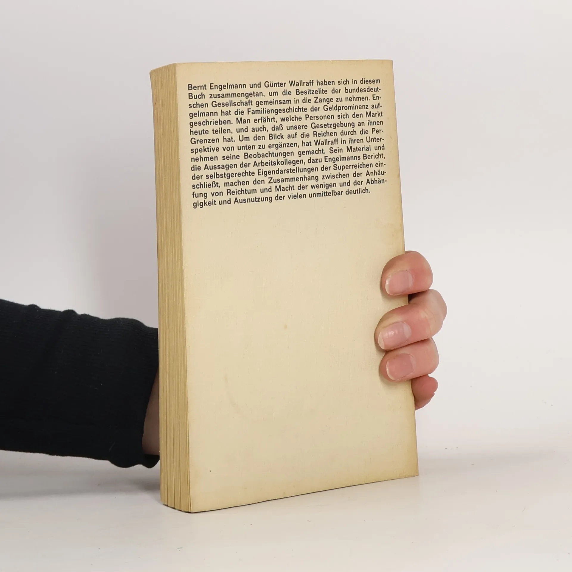 Bernt Engelmann und Günter Wallraff haben sich in diesem inzwischen berühmt gewordenen Buch zusammengetan, um die bundesdeutsche Gesellschaft vereint in die Zange zu nehmen. Aus verschiedenen Richtungen gehen sie ihr gemeinsames Ziel an: das Ausmaß des Widerspruchs zwischen der Anhäufung von Reichtum und Macht der wenigen und der Abhängigkeit und Ausnutzung der vielen aus unmittelbarer Anschauung durchsichtig zu machen. Die Welt der Milliardäre, für Millionen Leser in den Illustrierten verklärt, rückt hier nah und zeigt ihren weniger glänzenden Hintergrund. Engelmann war zu Besuch bei der Prominenz. Aus seinen Beobachtungen ergibt sich beiläufig die Geschichte des westdeutschen Nachkriegskapitals, die fast immer ein Beleg ist für die Wahrheit des Leitspruchs »Unrecht Gut gedeihe gut.«Wallraff war bei denen »da unten«, als Arbeiter, Vertreter, Bote, Portier oder Lakaien-Mönch. Er hat sich dabei den oft brutalen, oft verschrobenen Arbeitsbedingungen ausgesetzt. In seinen Berichten enthüllt sich die Pathologie der Reichen und vor allem die Realität, dass Geld, in Milliardenbeträgen in den Händen einzelner konzentriert, umschlägt in eine weit verzweigte politische Macht, der in unserer Gesellschaft kein Gesetz beizukommen vermag.