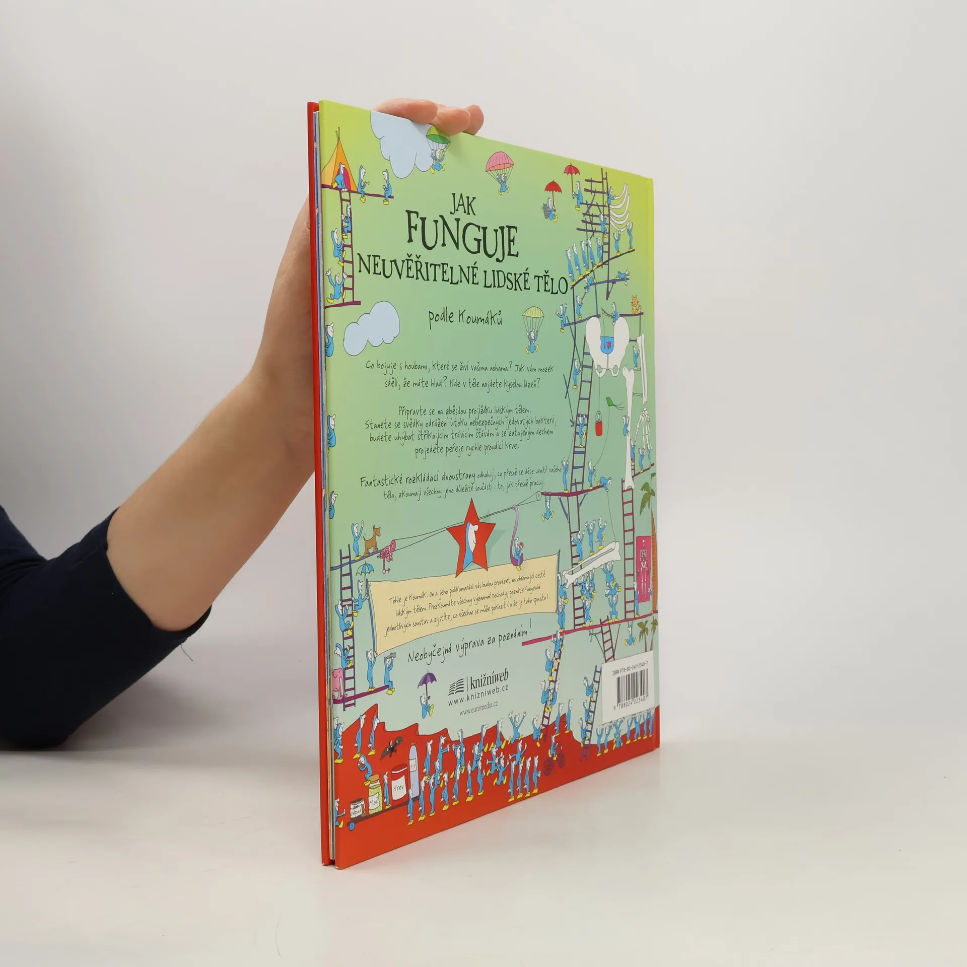 Podnikavé, energické a všetečné postavičky jménem Koumáci vás provedou fungováním lidského těla tak, jak jste je ještě nepoznali. Vydáte se pod kůži, abyste nakoukli do toho úžasného, neuvěřitelného a taky trochu nechutného stroje nazývaného lidské tělo. Prohlédnete si všechny tělesné soustavy, které vás udržují při životě: trávení, dýchání, nervy, smysly, svaly, kosti a mnohem víc. V knize je i řada rozkládacích stran, přičemž každá taková skládanka je zaměřená na určitou hlavní část těla a významný tělesný pochod: například jak pružná sada svalů uvádí do pohybu kostru nebo jaké neskutečné množství vzkazů vysílá a přijímá mozek každou nanosekundu. Koumáci vás zvou k báječnému anatomickému dobrodružství.