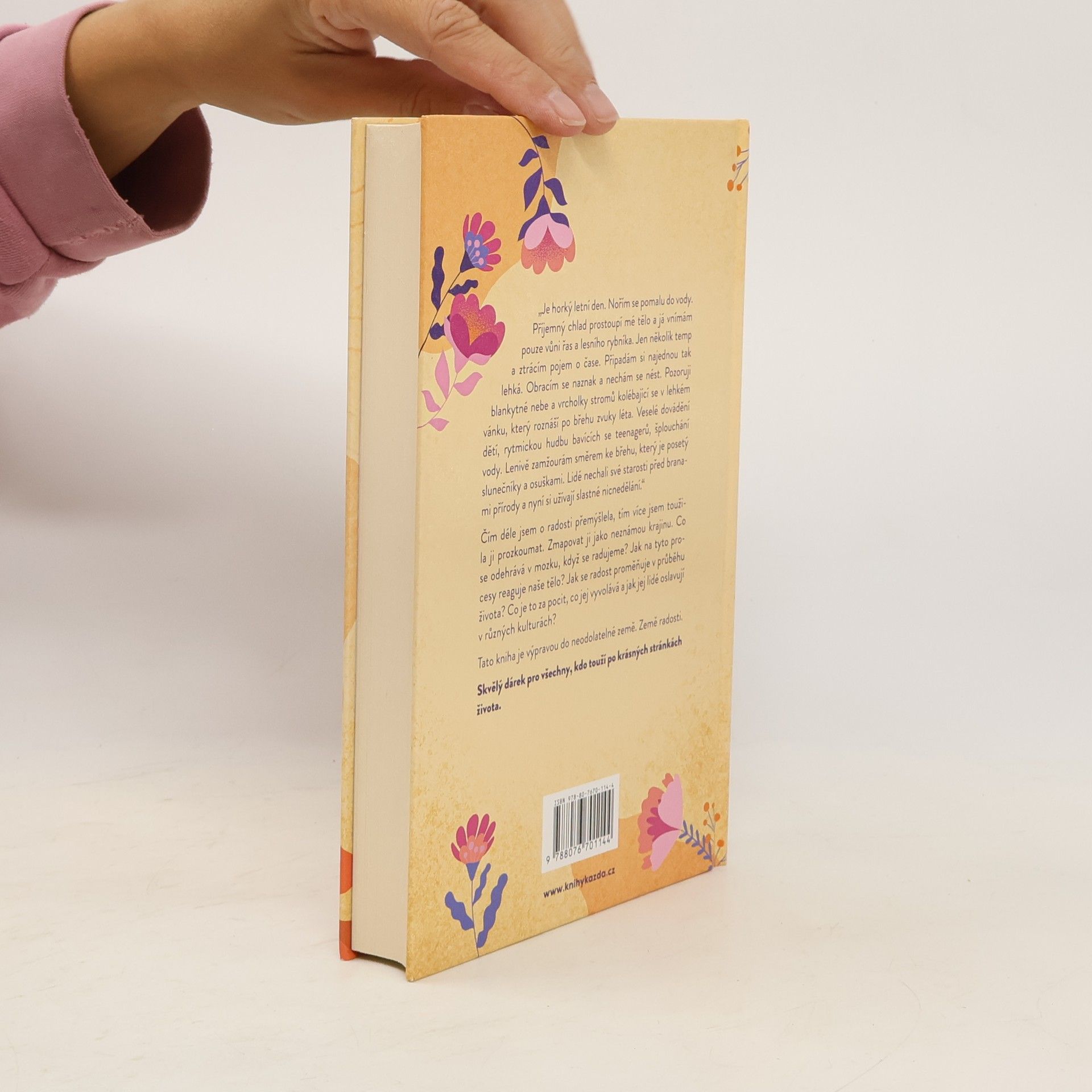 „Je horký letní den. Nořím se pomalu do vody. Příjemný chlad prostoupí mé tělo a já vnímám pouze vůni řas a lesního rybníka. Jen několik temp a ztrácím pojem o čase. Připadám si najednou tak lehká. Obracím se naznak a nechám se nést. Pozoruji blankytné nebe a vrcholky stromů kolébající se v lehkém vánku, který roznáší po břehu zvuky léta. Veselé dovádění dětí, rytmickou hudbu bavících se teenagerů, šplouchání vody. Lenivě zamžourám směrem ke břehu, který je posetý slunečníky a osuškami. Lidé nechali své starosti před branami přírody a nyní si užívají slastné nicnedělání.“Čím déle jsem o radosti přemýšlela, tím více jsem toužila ji prozkoumat. Zmapovat ji jako neznámou krajinu. Co se odehrává v mozku, když se radujeme? Jak na tyto procesy reaguje naše tělo? Jak se radost proměňuje v průběhu života? Co je to za pocit, co jej vyvolává a jak jej lidé oslavují v různých kulturách?Tato kniha je výpravou do neodolatelné země. Země radosti.Skvělý dárek pro všechny, kdo touží po krásných stránkách života.