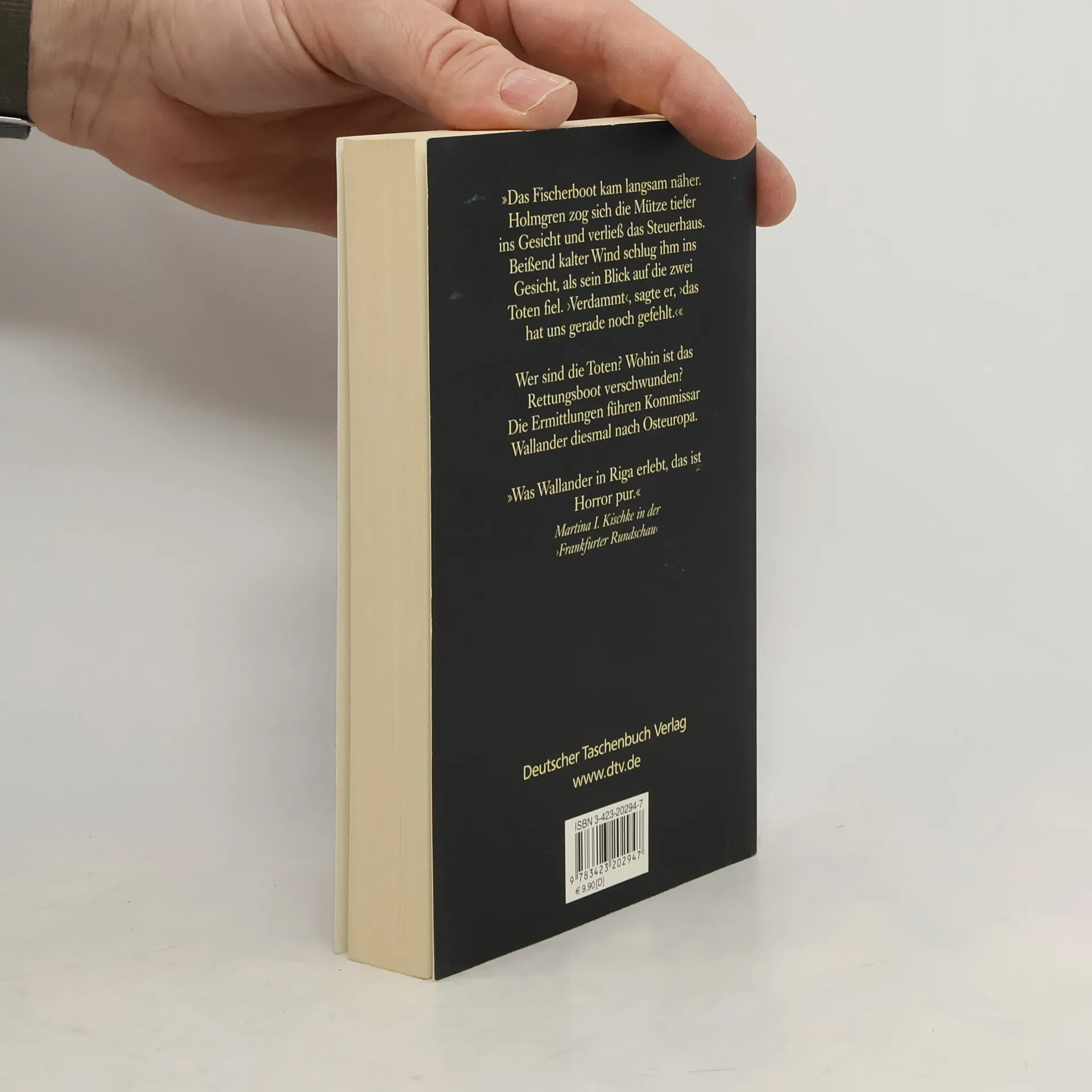 Ein Rettungsboot mit zwei toten Männern treibt an Land. Die Ermittlungen führen nach Osteuropa. Wallanders zweiter Fall. Kriminalkommissar Kurt Wallander saß in seinem Zimmer im Polizeipräsidium von Ystad und gähnte. In diesem Moment kam Martinson ins Zimmer. „Vor ein paar Minuten haben wir einen merkwürdigen Anruf erhalten“, begann er, „er kam aus einer Telefonzelle. Ein Mann behauptete, daß bald irgendwo hier an der Küste ein Rettungsboot mit zwei toten Männern an Land treiben würde. Dann legte er auf.“ - Wer sind die Toten? Und wohin ist das Rettungsboot verschwunden? Die Ermittlungen führen Kommissar Wallander nach Osteuropa. Er gerät immer tiefer hinein in ein kaum noch zu durchschauendes Komplott unsichtbarer Mächte, in dem er nicht nur seinen Glauben an die Gerechtigkeit verliert, sondern auch fast sein Leben läßt.
