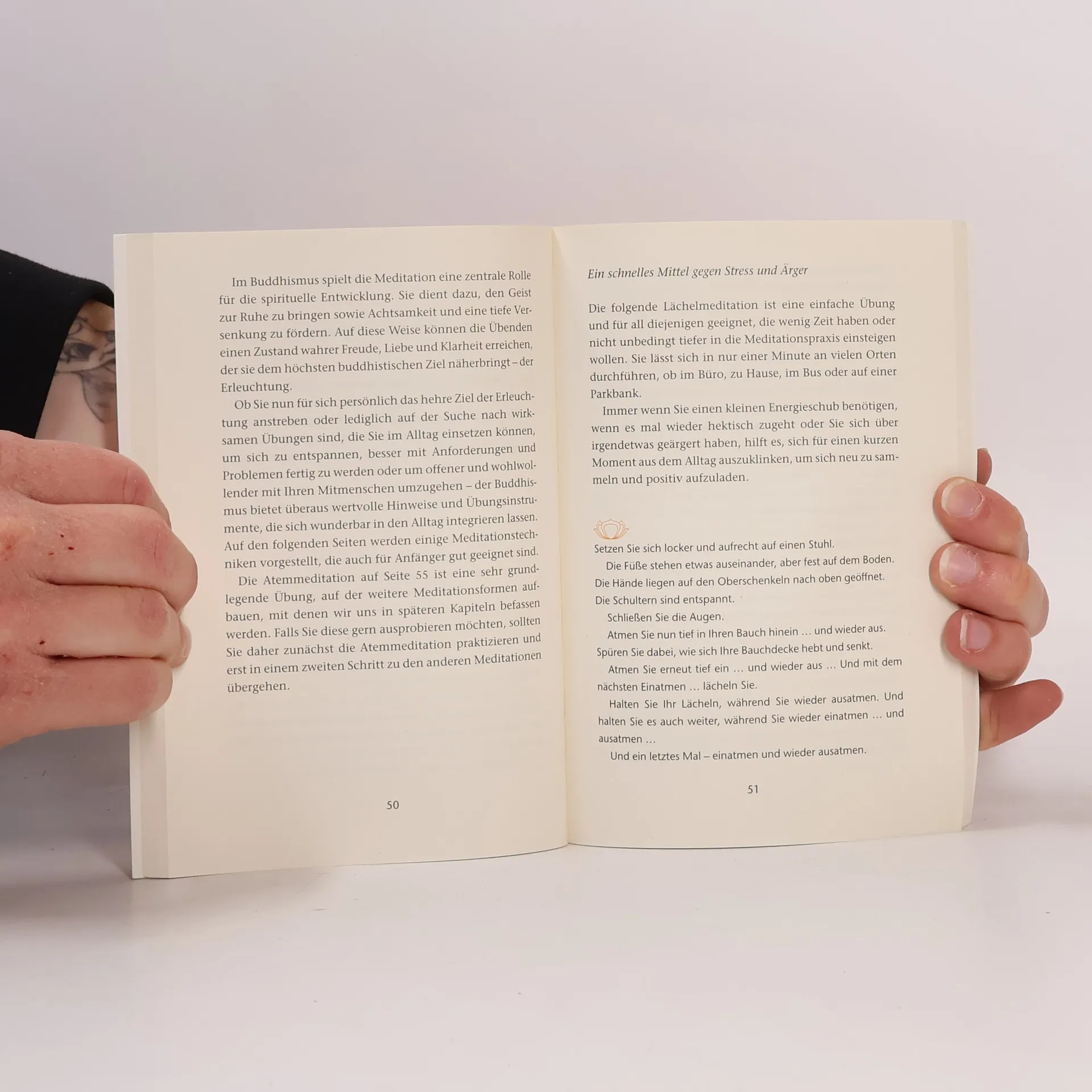 Buddhas Lehren für den Alltag. Dieser kleine Ratgeber vermittelt grundlegende buddhistische Lehren auf einfache, verständliche Weise und bietet Inspiration sowie konkrete Hilfe für den Alltag. Lehrreiche Geschichten und kurze Zitate veranschaulichen die elementaren buddhistischen Prinzipien. Darüber hinaus zeigen viele praktische Ratschläge und Übungen, wie man gelassen »buddhistisch« im Alltag reagieren kann.