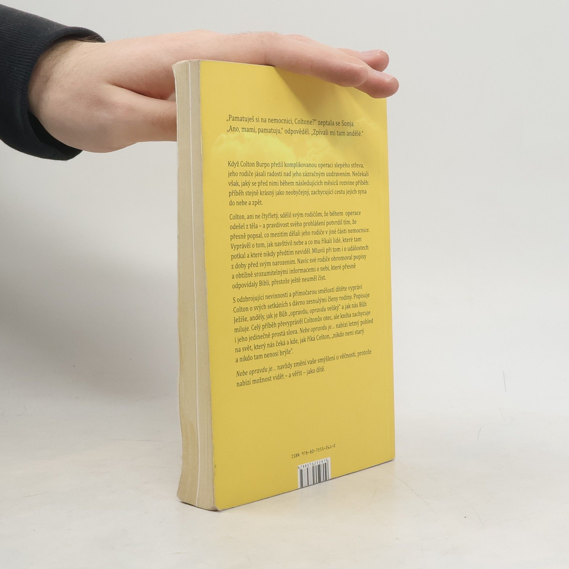 Neuvěřitelné vyprávění o cestě malého chlapce do nebe a zpět Když Colton Burpo přežil komplikovanou operaci slepého střeva, jeho rodiče jásali radostí nad jeho zázračným uzdravením. Nečekali však, jaký se před nimi během následujících měsíců rozvine příběh: příběh stejně krásný jako neobyčejný, zachycující cestu jejich syna do nebe a zpět. Colton, ani ne čtyřletý, sdělil svým rodičům, že během operace odešel z těla - a pravdivost svého prohlášení potvrdil tím, že přesně popsal, co mezitím dělali jeho rodiče v jiné části nemocnice. Vyprávěl o tom, jak navštívil nebe a co mu říkali lidé, které tam potkal a které nikdy předtím neviděl. Mluvil při tom i o událostech z doby před svým narozením. Navíc své rodiče ohromoval popisy a obtížně srozumitelnými informacemi o nebi, které přesně odpovídaly Bibli, přestože ještě neuměl číst. S odzbrojující a přímočarou smělostí dítěte vypráví Colton o svých setkáních s dávno zesnulými členy rodiny. Popisuje Ježíše, anděly, jak je Bůh "opravdu, opravdu veliký" a jak nás Bůh miluje. Celý příběh převyprávěl Coltonův otec, ale kniha zachycuje i jeho jedinečně prostá slova. Nebe opravdu je... nabízí letmý pohled na svět, který nás čeká a kde, jak říká Colton, "nikdo není starý a nikdo tam nenosí brýle". Nebe opravdu je... navždy změní vaše smýšlení o věčnosti, protože nabízí možnost vidět - a věřit - jako dítě.