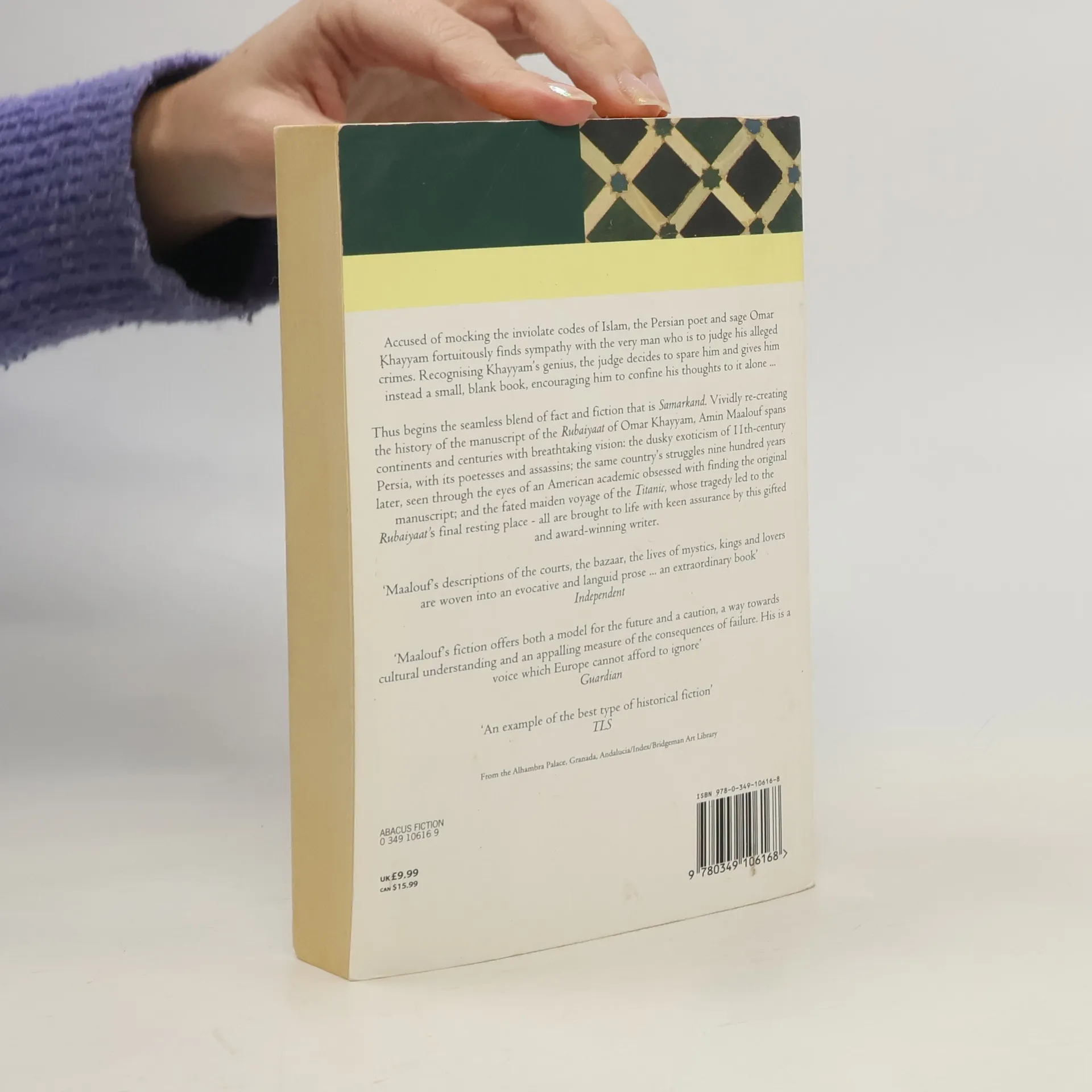 Accused of mocking the inviolate codes of Islam, the Persian poet and sage Omar Khayyam fortuitously finds sympathy with the very man who is to judge his alleged crimes. Recognising genuis, the judge decides to spare him and gives him instead a small, blank book, encouraging him to confine his thoughts to it alone. Thus beginds the seamless blend of fact and fiction that is Samarkand. Vividly re-creating the history of the manuscript of the Rubaiyaat of Omar Khayyam, Amin Maalouf spans continents and centuries with breathtaking vision: the dusky exoticism of 11th-century Persia, with its poetesses and assassins; the same country's struggles nine hundred years later, seen through the eyes of an American academic obsessed with finding the original manuscript ; and the fated maiden voyage of the Titanic, whose tragedy led to the Rubaiyaat's final resting place - all are brought to life with keen assurance by this gifted and award-winning writer.