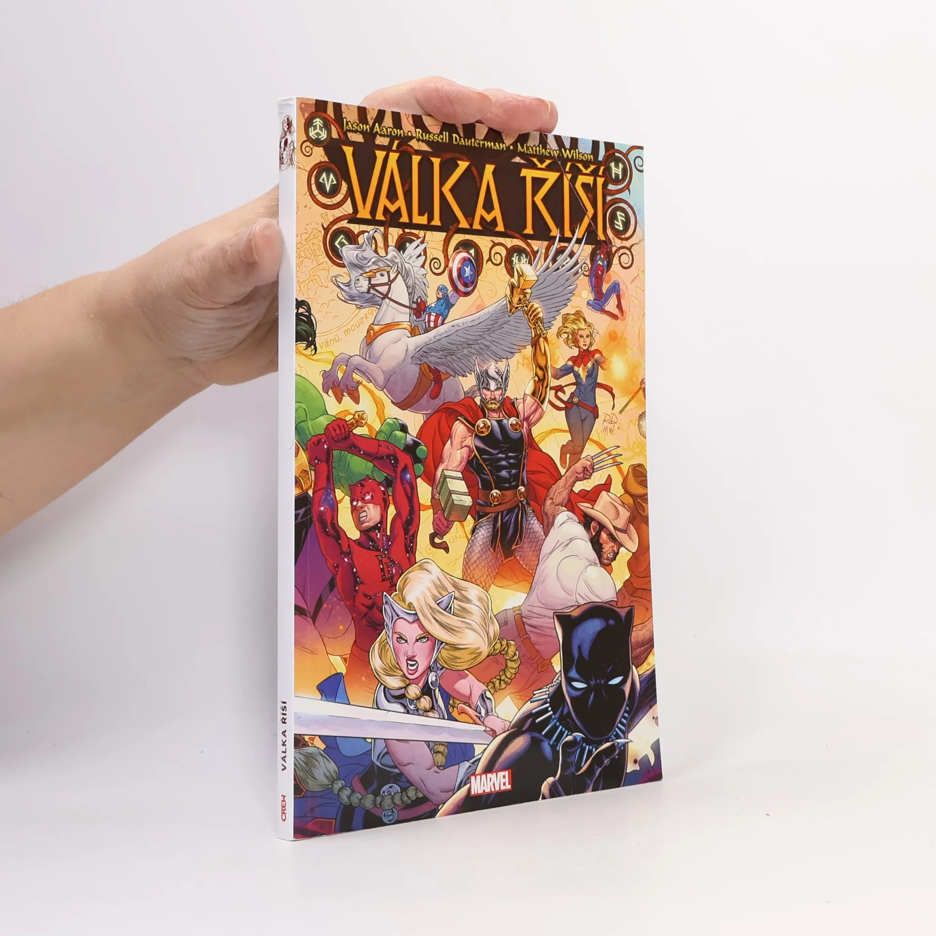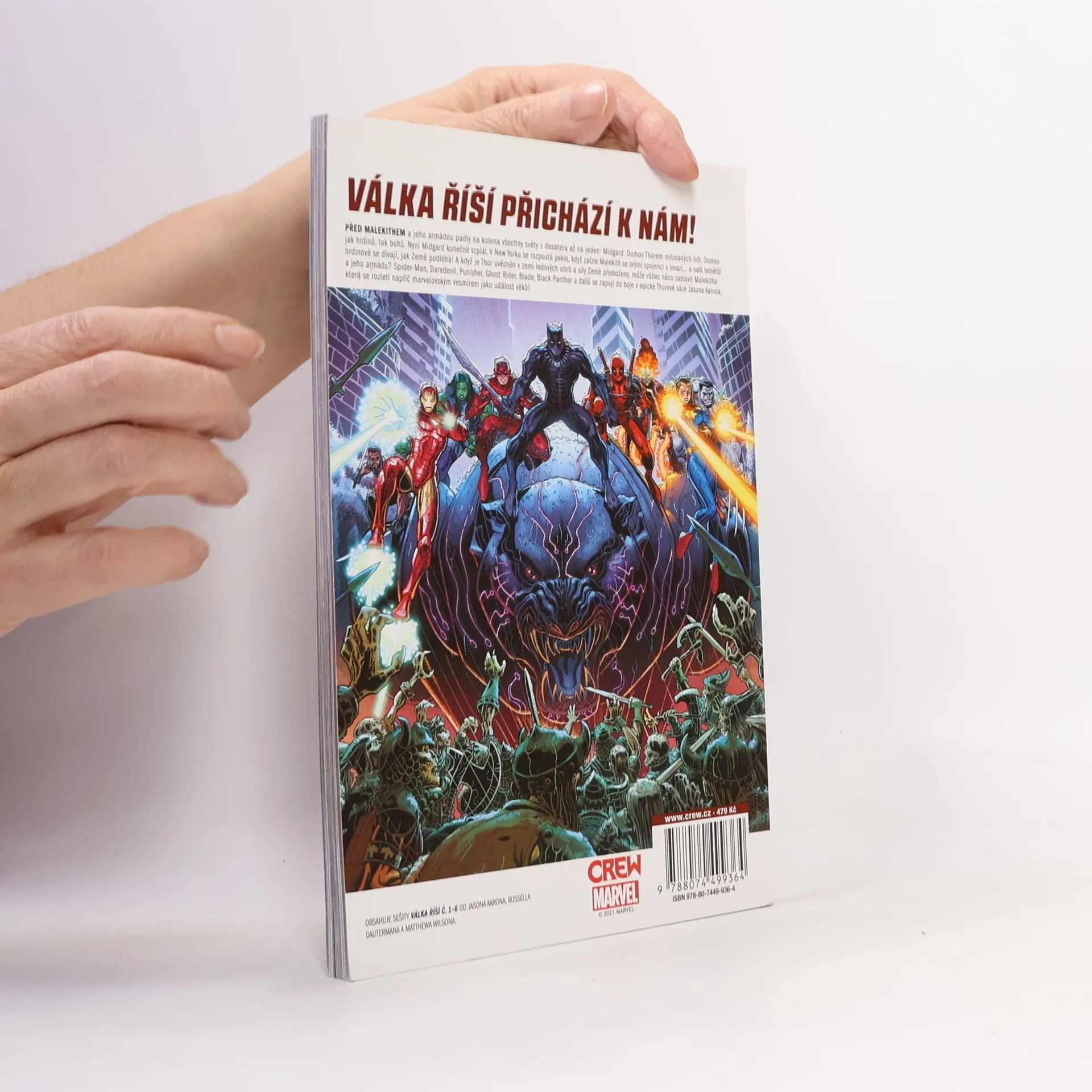 VÁLKA ŘÍŠÍ PŘICHÁZÍ K NÁM! Před Malekithem a jeho armádou padly na kolena všechny světy z desatera až na jeden: Midgard. Domov Thorových milovaných lidí. Domov jak hrdinů, tak bohů. Nyní Midgard konečně vzplál. V New Yorku se rozpoutá peklo, když začne Malekith se svými spojenci s invazí... a naši největší hrdinové se dívají, jak Země podléhá! A když je Thor uvězněn v zemi ledových obrů a síly Země přemoženy, může vůbec něco zastavit Malekitha a jeho armádu? Thor, Spider-Man, Daredevil, Punisher, Ghost Rider, Blade, Black Panther a další se zapojí do boje v epické sáze Jasona Aarona, která se rozletí napříč marvelovským vesmírem jako událost věků! OBSAHUJE SEŠITY VÁLKA ŘÍŠÍ Č. 1–6 OD JASONA AARONA, RUSSELLA DAUTERMANA A MATTHEWA WILSONA.