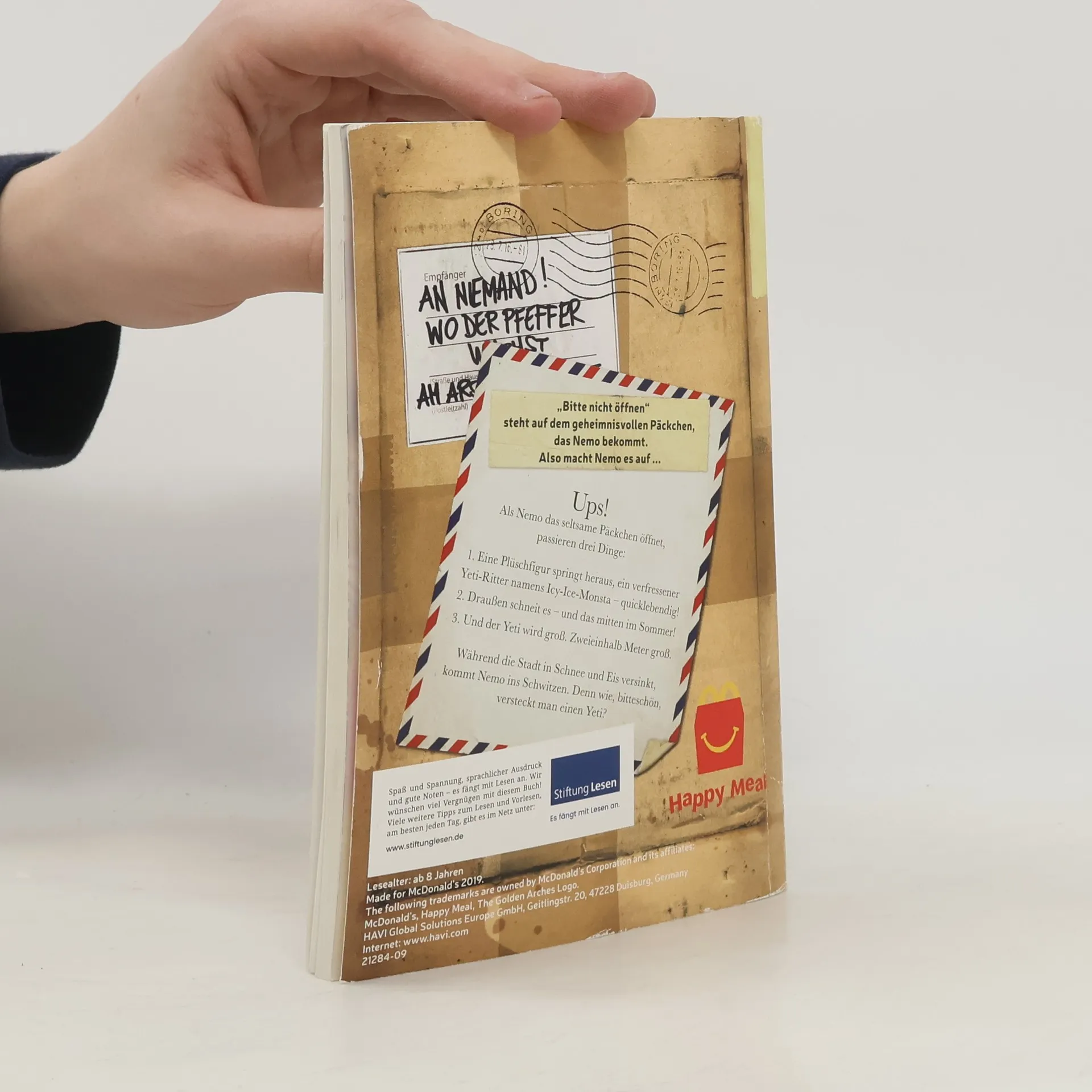 Ding-Dong, die Post ist da! Nemo schaut nicht schlecht, als er vom Postboten ein Paket mit dem Aufdruck „Bitte nicht öffnen“ entgegennimmt. Die Anschrift ist ebenfalls mysteriös: „An Niemand! Wo der Pfeffer wächst. Am Arsch der Welt“. Was soll das denn? Nemo denkt nicht lange nach, öffnet das Päckchen - und eine lebendige Yeti-Actionfigur springt heraus! Seitdem ist in Nemos Leben nichts mehr normal: Während draußen ein Schneesturm mitten im Sommer tobt, wächst ihm der kleine, plüschige Yeti buchstäblich über den Kopf. Zum Glück kann sich Nemo auf die Hilfe seiner Freunde verlassen. Denn wie, bitteschön, versteckt man einen zweieinhalb Meter großen Yeti? Und vor allem: Wie können sie das Eis-Monster wieder zurück in seine Heimat bringen? Wenn Spielzeug plötzlich lebendig wird – die Buchreihe „Bitte nicht öffnen“: Geheimnisvolle Pakete, urkomische Figuren und spannende Abenteuer: Für Fans von mysteriösen Detektivgeschichten und lustiger Fantasy Yeti, Drache oder Vampir – hinter jedem Band versteckt sich ein anderes Monster Große Schrift und Schwarz-Weiß-Bilder – ideal für Leseanfänger*innen und Zweitklässler*innen ab 8 Jahren Ein verlorenes Wesen, das nach Hause will, drei mutige Freunde und viele Überraschungen - für abenteuerlustige Mädchen und Jungen zum Vor- oder Selberlesen.