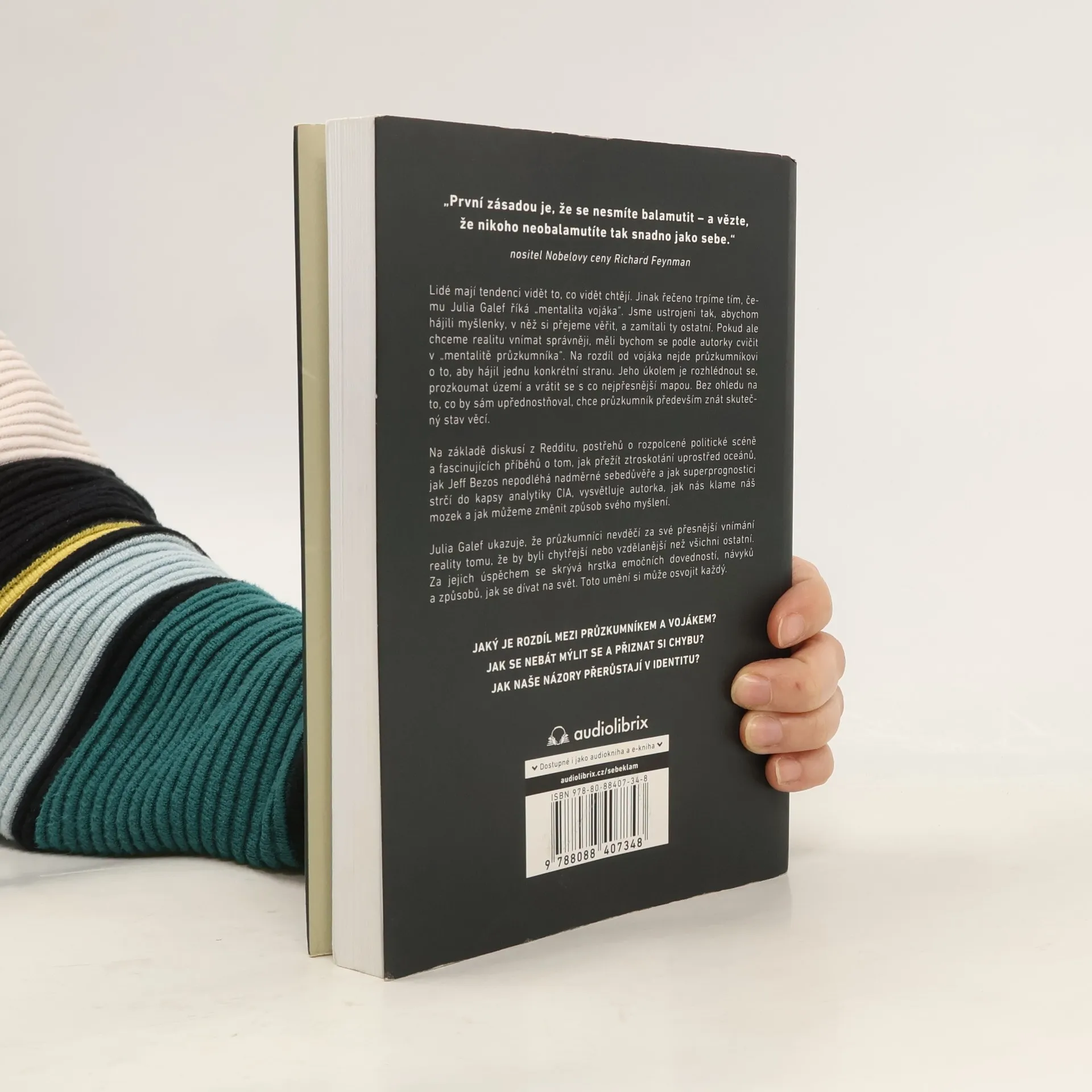 Lidé mají tendenci vidět to, co vidět chtějí. Jinak řečeno trpíme tím, čemu Julia Galef říká „mentalita vojáka“. Jsme ustrojeni tak, abychom hájili myšlenky, v které si přejeme věřit, a zamítali ty ostatní. Pokud ale chceme realitu vnímat správněji, měli bychom se podle autorky cvičit v „mentalitě průzkumníka“. Na rozdíl od vojáka nejde průzkumníkovi o to, aby hájil jednu konkrétní stranu. Jeho úkolem je rozhlédnout se, prozkoumat území a vrátit se s co nejpřesnější mapou. Bez ohledu na to, co by sám upřednostňoval, chce průzkumník především znát skutečný stav věcí. Na základě diskusí z Redditu, postřehů o rozpolcené politické scéně a fascinujících příběhů o tom, jak přežít ztroskotání uprostřed oceánů, jak Jeff Bezos nepodléhá nadměrné sebedůvěře a jak superprognostici strčí do kapsy analytiky CIA, vysvětluje autorka, jak nás klame náš mozek a jak můžeme změnit způsob svého myšlení.Julia Galef ukazuje, že průzkumníci nevděčí za své přesnější vnímání reality tomu, že by byli chytřejší nebo vzdělanější než všichni ostatní. Za jejich úspěchem se skrývá hrstka emočních dovedností, návyků a způsobů, jak se dívat na svět.Toto umění si může osvojit každý.