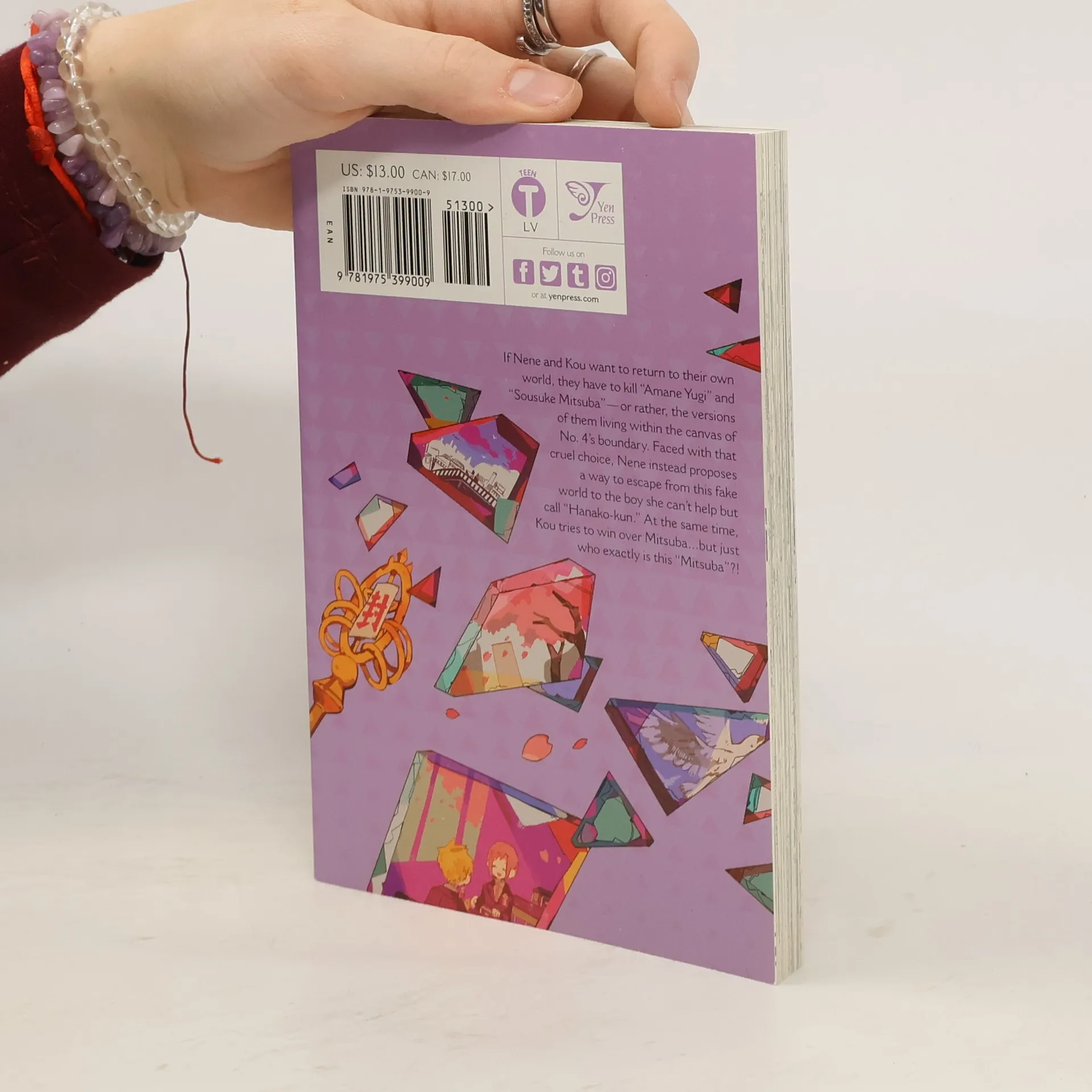 If Nene and Kou want to return to their own world, they have to kill"Amane Yugi" and "Sousuke Mitsuba"-or rather, theversions of them living within the canvas of Number Four's boundary.Faced with that cruel choice, Nene instead proposes a way to escape from thisfake world to the boy she can't help but call "Hanako-kun." Atthe same time, Kou tries to win over Mitsuba as well-but just who exactly isthis "Mitsuba"?!