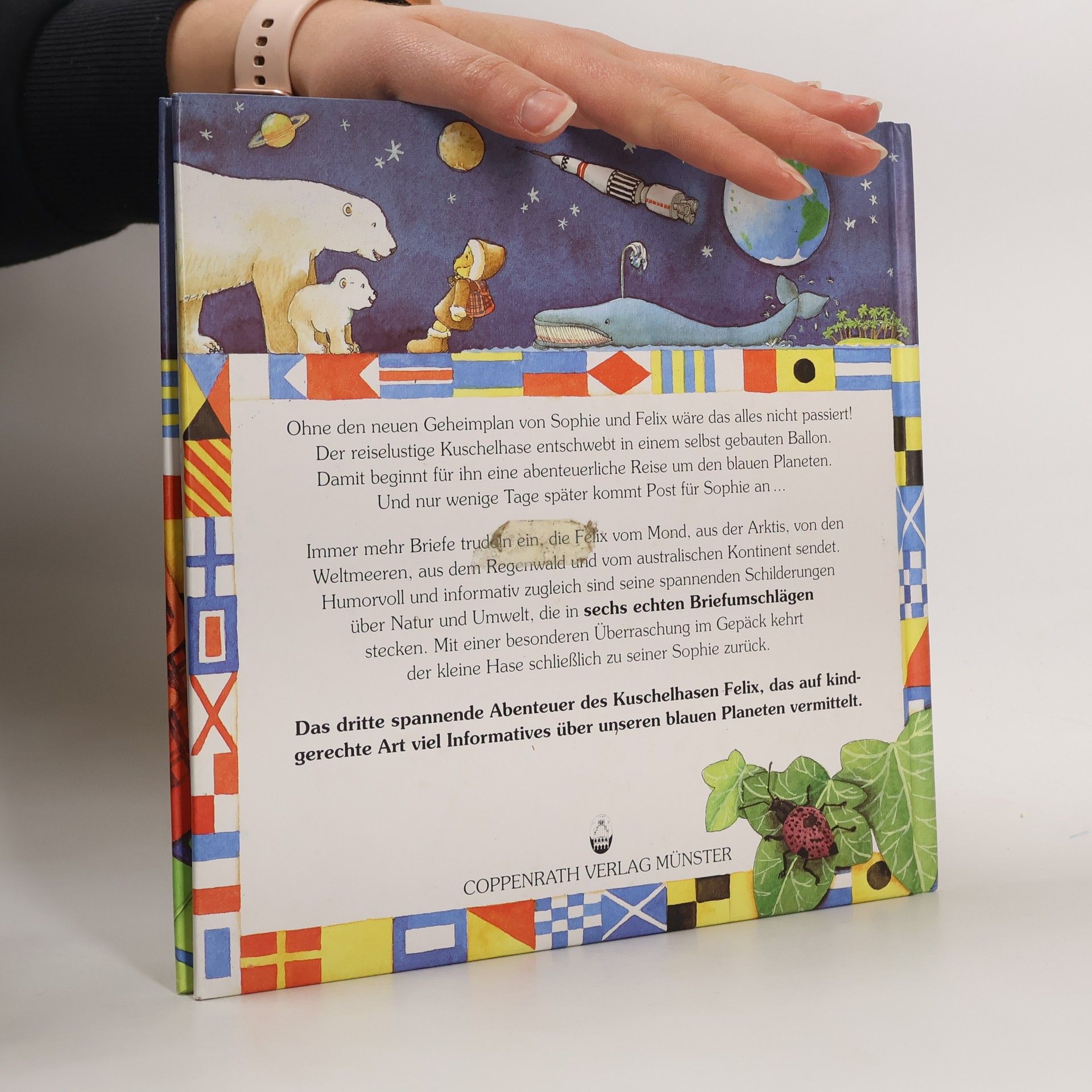 Ohne den Geheimplan von Sophie und Felix wäre das alles nicht passiert! Der reiselustige Kuschelhase entschwebt in einem selbst gebauten Ballon. Damit beginnt für ihn eine abenteuerliche Reise um den blauen Planeten. Und nur wenige Tage später kommt Post für Sophie an... Immer mehr Briefe trudeln ein, die Felix vom Mond, aus der Arktis, von den Weltmeeren, aus dem Regenwald und vom australischen Kontinent sendet. Humorvoll und informativ zugleich sind seine spannenden Schilderungen über Natur und Umwelt, die in sechs echten Briefumschlägen stecken. Das dritte spannende Abenteuer des Kuschelhasen Felix, das auf kindgerechte Art viel Informatives über unseren blauen Planeten vermittelt.
