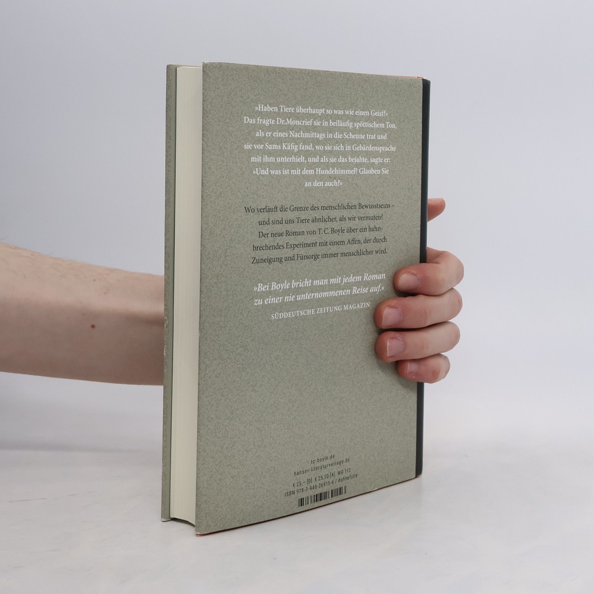 Wer ist menschlicher? Der Mensch oder der Affe? - „Wohl einer von Boyles besten – und traurigsten – Romanen, ein Buch, das die Grenzen zwischen Mensch und Tier auflöst.“ Irene Binal, Neue Zürcher Zeitung Sam, der Schimpanse, den Professor Schermerhorn in eine TV-Show bringt, kann in der Gebärdensprache nicht nur einen Cheeseburger bestellen, sondern auch seinen Namen sagen. Wie ein Kind wächst er umsorgt von Wissenschaftlern auf. Als die schüchterne Aimee dazu stößt, entspinnt sich eine einzigartige Beziehung: Sam erwidert ihre Gefühle und entwickelt sich regelrecht zu einem Individuum. Als jedoch die Vision Schermerhorns, der an das Menschliche im Tier glaubt, keine Schule macht, wird er für Tierexperimente von einer anderen Universität beschlagnahmt. Aimee ist am Boden zerstört und fasst einen verrückten Plan. T. C. Boyle geht ebenso komisch wie mitfühlend der Frage nach, ob uns Tiere ähnlicher sind, als wir vermuten.