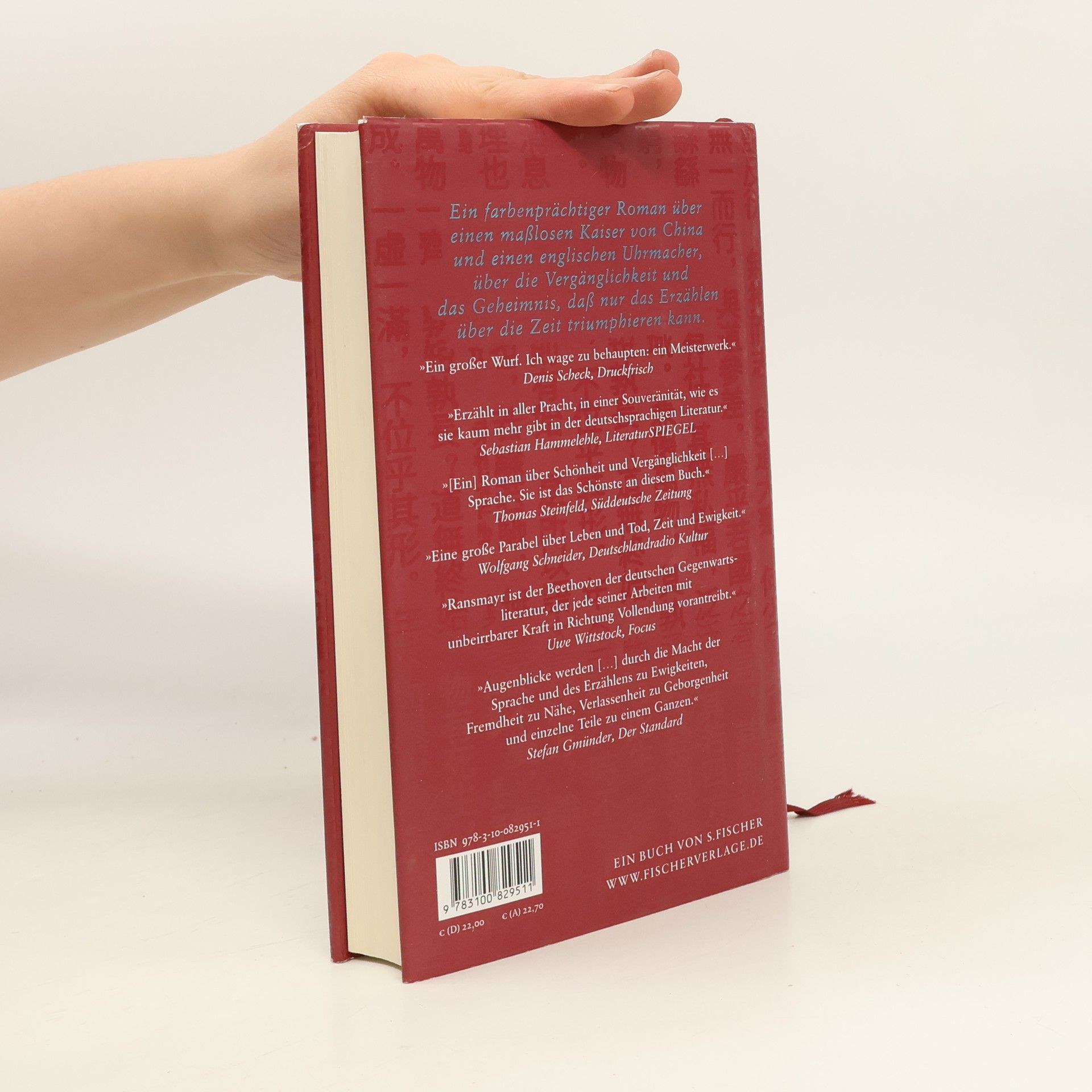 Ein farbenprächtiger Roman über einen maßlosen Kaiser von China und einen englischen Uhrmacher, über die Vergänglichkeit und das Geheimnis, dass nur das Erzählen über die Zeit triumphieren kann. Der mächtigste Mann der Welt, Qiánlóng, Kaiser von China, lädt den englischen Automatenbauer und Uhrmacher Alister Cox an seinen Hof. Der Meister aus London soll in der Verbotenen Stadt Uhren bauen, an denen die unterschiedlichen Geschwindigkeiten der Zeiten des Glücks, der Kindheit, der Liebe, auch von Krankheit und Sterben abzulesen sind. Schließlich verlangt Qiánlóng, der gemäß einem seiner zahllosen Titel auch alleiniger Herr über die Zeit ist, eine Uhr zur Messung der Ewigkeit. Cox weiß, dass er diesen ungeheuerlichen Auftrag nicht erfüllen kann, aber verweigert er sich dem Willen des Gottkaisers, droht ihm der Tod. Also macht er sich an die Arbeit.