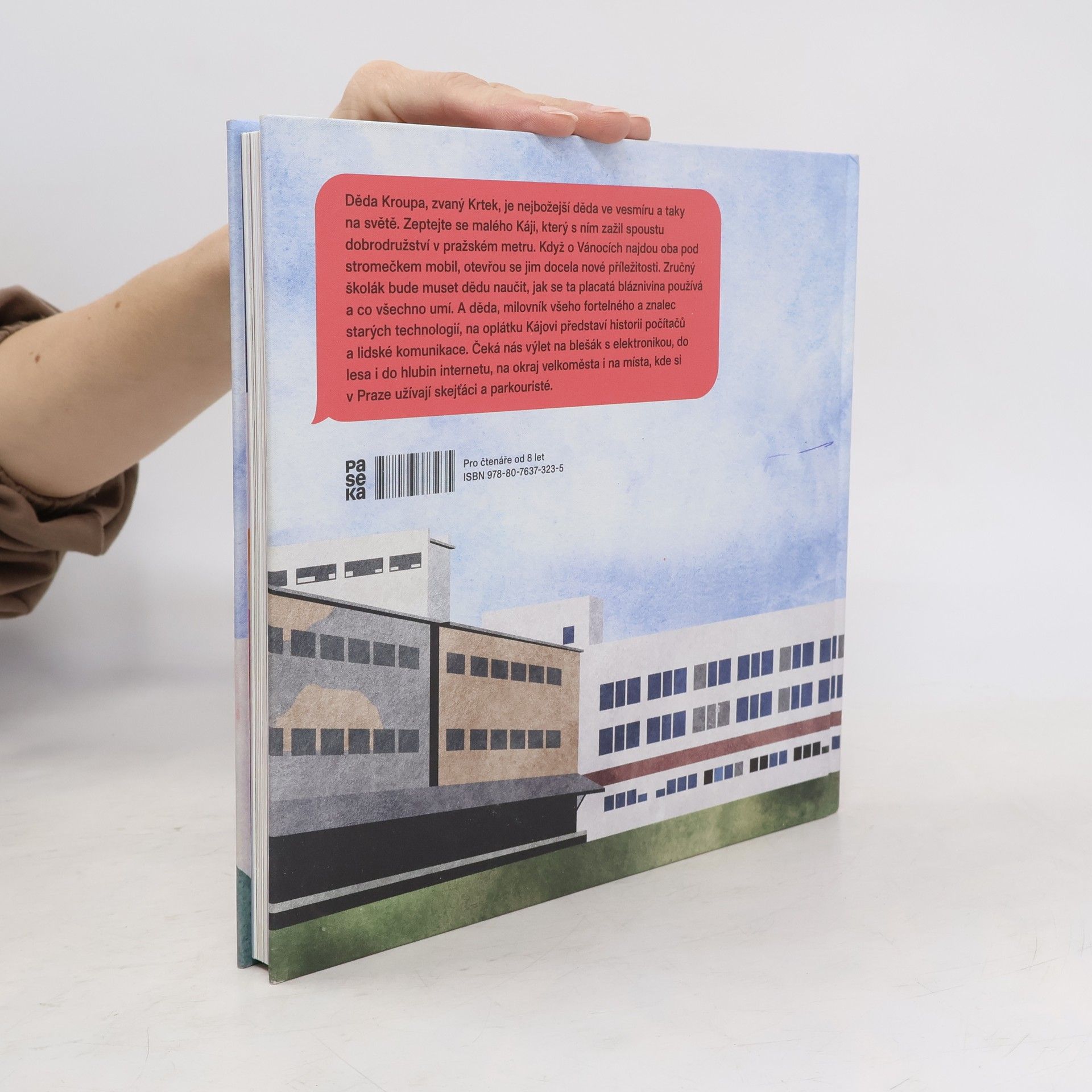 Děda Kroupa, zvaný Krtek, je nejbožejší děda ve vesmíru a taky na světě. Zeptejte se malého Káji, který s ním zažil spoustu dobrodružství v pražském metru. Když o Vánocích najdou oba pod stromečkem mobil, otevřou se jim docela nové příležitosti. Zručný školák bude muset dědu naučit, jak se ta placatá bláznivina používá a co všechno umí. A děda, milovník všeho fortelného a znalec starých technologií, na oplátku Kájovi představí historii počítačů a lidské komunikace. Čeká nás výlet na blešák s elektronikou, do lesa i do hlubin internetu, na okraj velkoměsta i na místa, kde se v Praze scházejí skejťáci a parkouristé. Tohle je knížka, která dětem vysvětlí, jak funguje náš moderní svět. A ukáže jim, proč stojí za to zvednout oči od displejů a vyrazit ven. Klidně i s mobilem v kapse. Protože jak říká děda, pokrok nezastavíš, čéče!