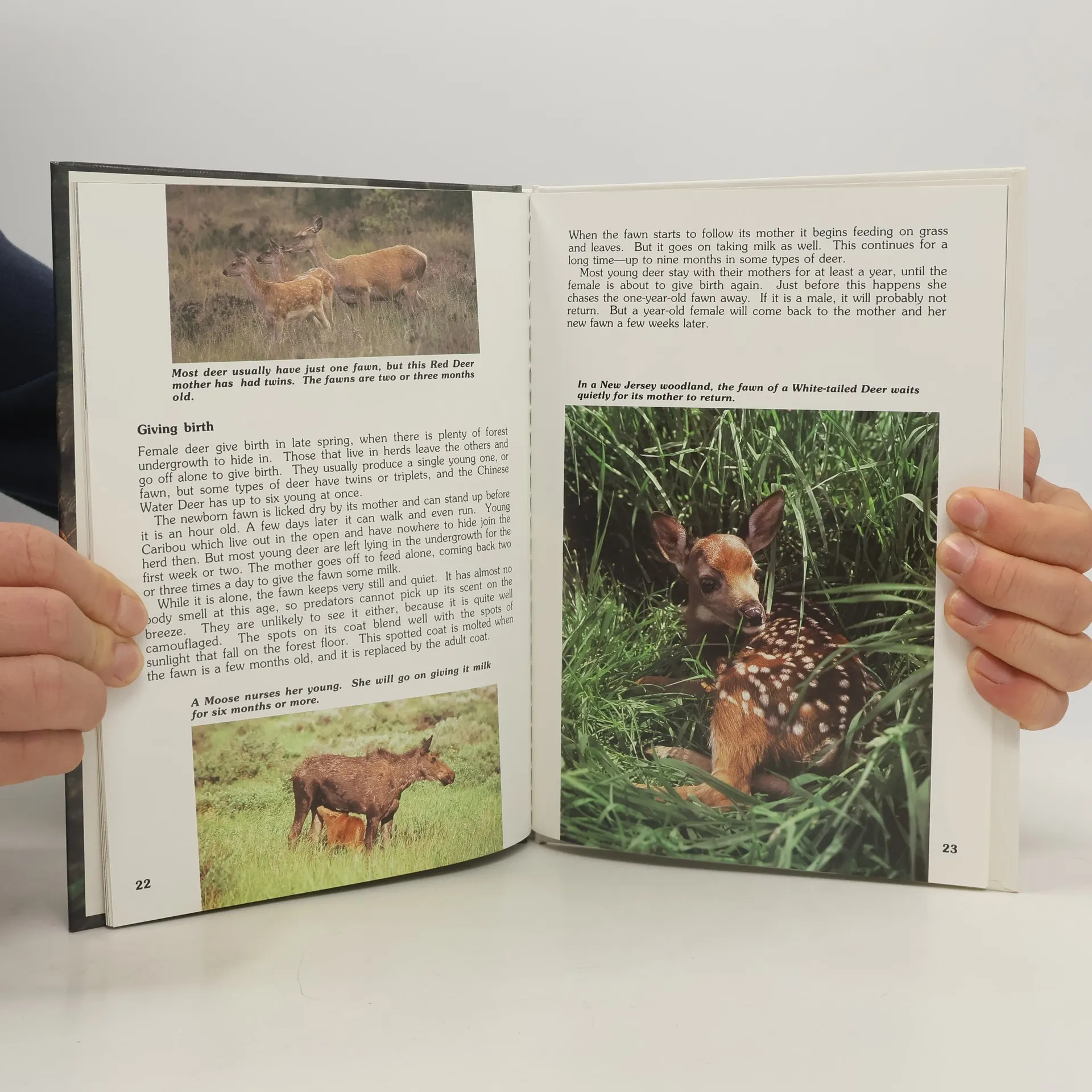 Text and photographs depict deer feeding, breeding, and defending themselves in their natural habitats