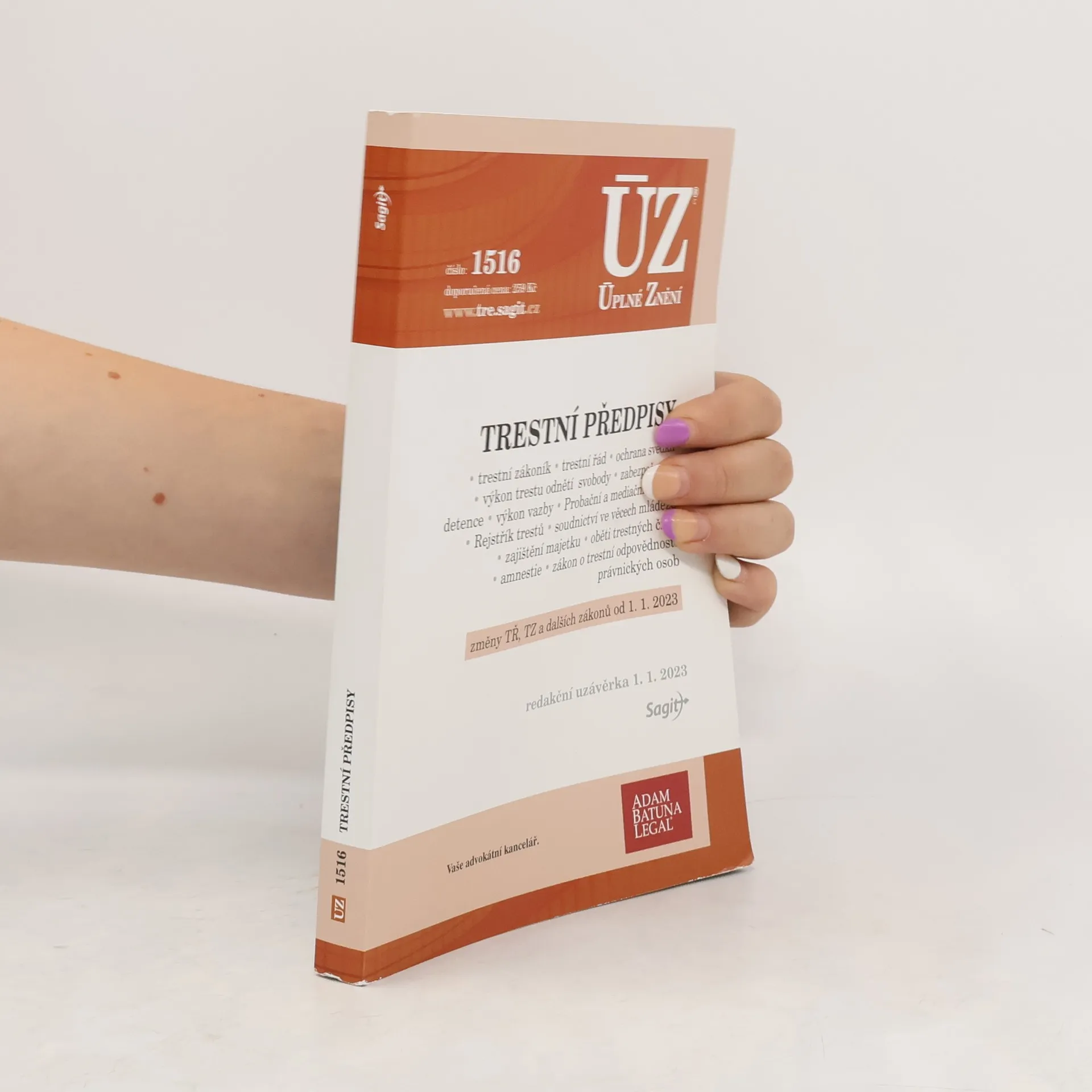 Od ledna 2023 nabývá účinnosti novela trestního řádu a trestního zákoníku; dále se také mění zákon o použití peněžních prostředků z majetkových trestních sankcí, zákon o výkonu zajištění majetku a zákon o soudnictví ve věcech mládeže. Celkově publikace obsahuje aktuální znění 26 předpisů rozdělených do sedmi kapitol: trestní předpisy, výkon trestu odnětí svobody, zabezpečovací detence, výkon vazby, Probační a mediační služba, oběti trestných činů, rozhodnutí prezidenta republiky o amnestii. Poslední změny všech předpisů jsou vyznačeny tučným písmem, odkazy na související předpisy jsou plně citovány.