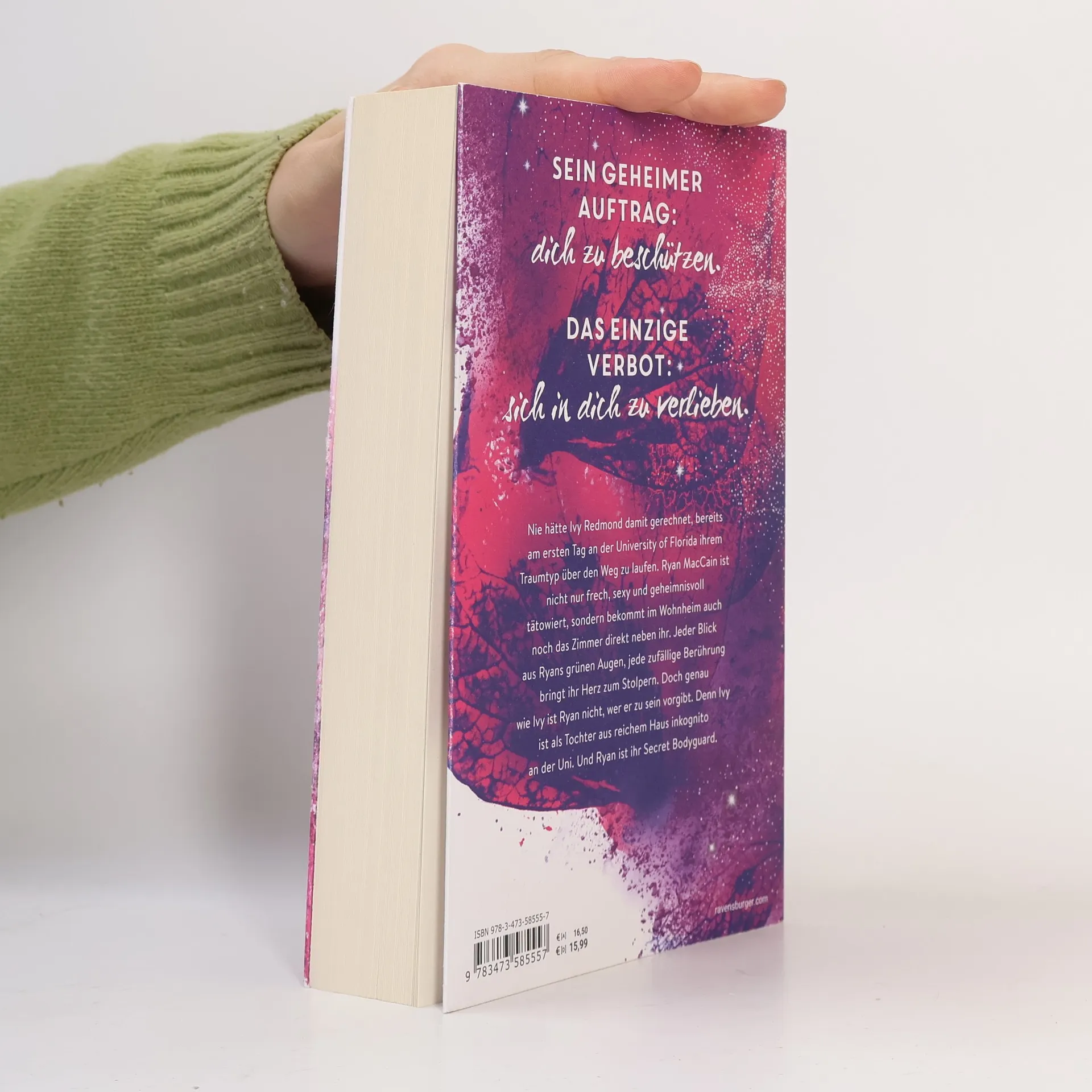Charmant. Unverschämt sexy. Prickelnd. Bodyguard-Romance at its best. Sein geheimer Auftrag: Dich zu beschützen. Das einzige Verbot: Sich in dich zu verlieben. Ivy Redmond trifft am ersten Tag an der University of Central Florida auf ihren Traumtypen, Ryan MacCain. Er ist nicht nur frech und sexy, sondern auch geheimnisvoll tätowiert und wohnt direkt neben ihr im Wohnheim. Jeder Blick aus seinen grünen Augen und jede zufällige Berührung lässt ihr Herz schneller schlagen. Doch sowohl Ivy als auch Ryan haben Geheimnisse. Ivy ist inkognito an der Uni, da sie aus reichem Haus stammt, und Ryan ist ihr Secret Bodyguard. In einer knisternden Szene wird die Spannung zwischen den beiden deutlich. Ivy spürt Ryans sehnsüchtigen Blick, während sie sich mit der Zunge über die Lippen fährt. Trotz des Verbots, sich zu verlieben, kann Ryan nicht widerstehen. Er gesteht, dass die Wahrscheinlichkeit hoch ist, dass er nicht mehr von ihr lassen kann, wenn er einmal anfängt. Ivy, verführt von der Nähe und der Anziehung, bittet ihn schließlich, sie zu küssen – nur noch einmal. Die Situation wird brenzlig, besonders wenn Ivys Vater auftaucht.