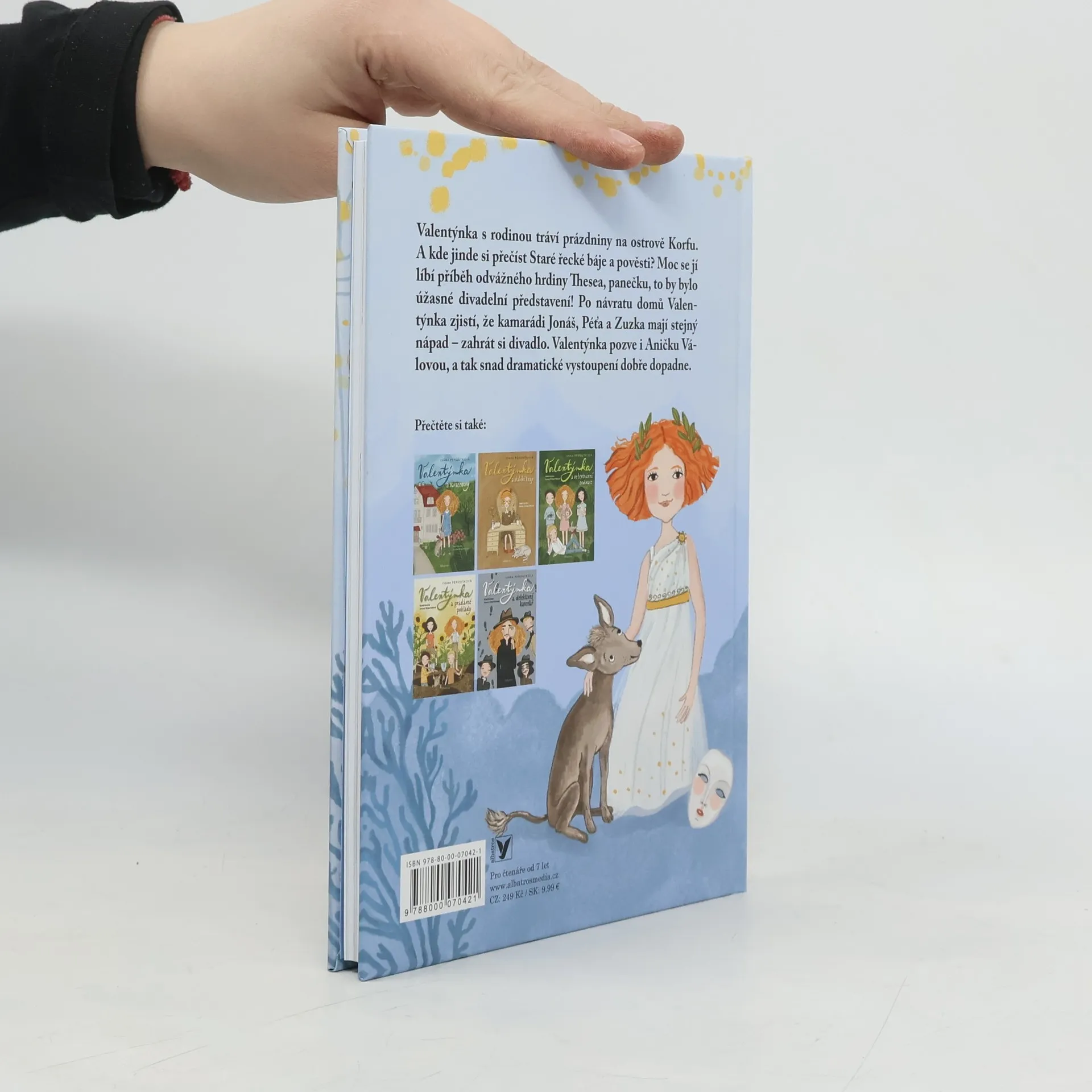 Valentýnka objevuje krásy divadla. Závěrečný díl oblíbené série. Valentýnka s rodinou tráví prázdniny na ostrově Korfu. Kde jinde si přečíst Staré řecké báje a pověsti? Nejvíc ze všech ji zaujme příběh odvážného hrdiny Thesea, který porazil netvora Minotaura. Podle jeho dobrodružství by se dalo nacvičit skvělé divadelní představení! Jakmile se Valentýnka vrátí domů, pustí se s kamarády do zkoušení. Bude mít jejich vystoupení úspěch? Když Valentýnčin gejzír nápadů i pochybností usměrní Anička Válová, určitě všechno dobře dopadne.