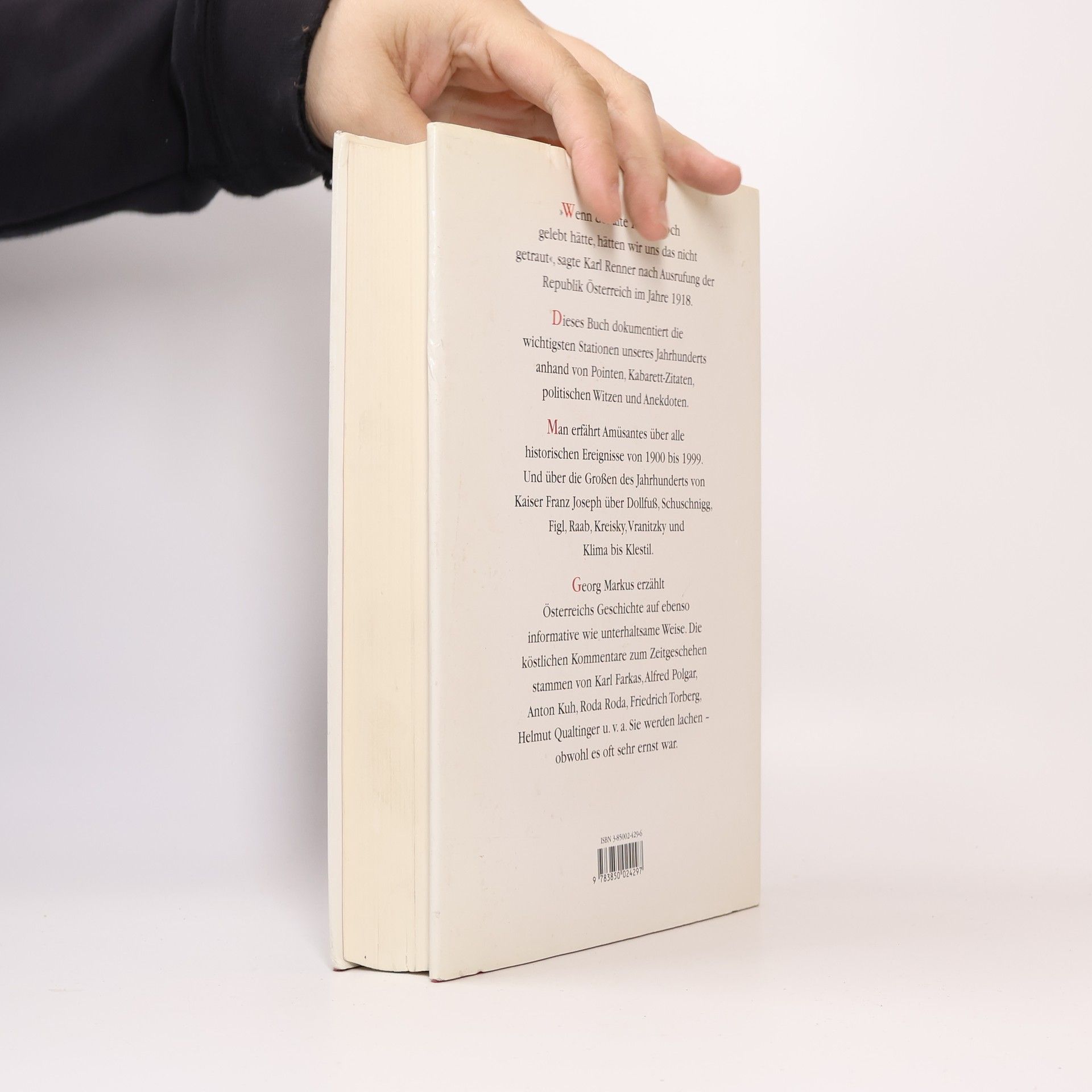 »Wenn der Kaiser noch gelebt hätte, hätten wir uns das nicht getraut«, sagte Karl Renner nach Ausrufung der Republik Österreich im Jahre 1918. Dieses Buch dokumentiert die wichtigsten Stationen unseres Jahrhunderts anhand von Pointen, Kabarett-Zitaten, politischen Witzen und Anekdoten. Man erfährt Amüsantes über alle historischen Ereignisse von 1900 bis 1999. Und über die Großen des Jahrhunderts von Kaiser Franz Joseph über Dollfuß, Schuschnigg, Figl, Raab, Kreisky, Vranitzky und Klima bis Klestil. Georg Markus erzählt Österreichs Geschichte auf ebenso informative wie unterhaltsame Weise. Die köstlichen Kommentare zum Zeitgeschehen stammen von Karl Farkas, Alfred Polgar, Anton Kuh, Roda Roda, Friedrich Torberg, Helmut Qualtinger u. v. a. Sie werden lachen – obwohl es oft sehr ernst war.