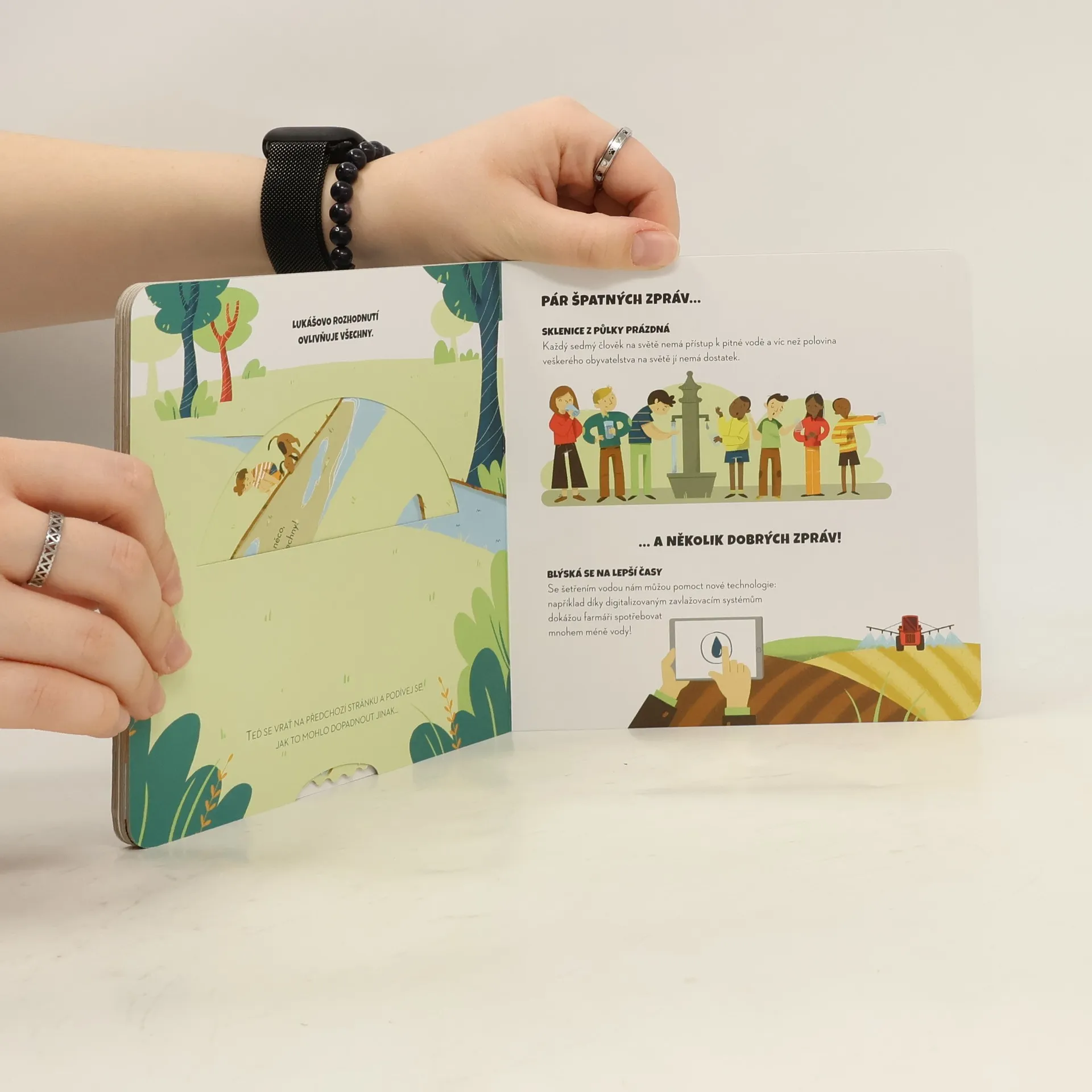Všichni můžeme přírodě podat pomocnou ruku a my vám ukážeme, jak na to! Na stránkách naší knížky se dozvíte, proč je voda tak důležitá a jak s ní co nejméně plýtvat. Nejste si jisti, co máte dělat? Stačí otočit kolečkem v knížce a odpovědi se objeví! Tato řada leporel pomůže dětem se rozhodovat správně v situacích, kdy jde o záchranu planety! Po krátkém úvodu najdou děti na každé stránce otočné kolečko. Pokud jím otočí tak, že výsledkem bude ekologické řešení, následující stránka bude zobrazovat šťastný konec. Pokud se ale rozhodnou neekologicky, v životním prostředí se stane něco špatného… ale z této zkušenosti se mohou poučit a znovu se nad svým chováním zamyslet! Je to jednoduchý, ale účinný nápad, jak dětem ukázat, že jejich chování ovlivňuje celou planetu. Mohou se z toho poučit a odnést si cenné lekce do života.