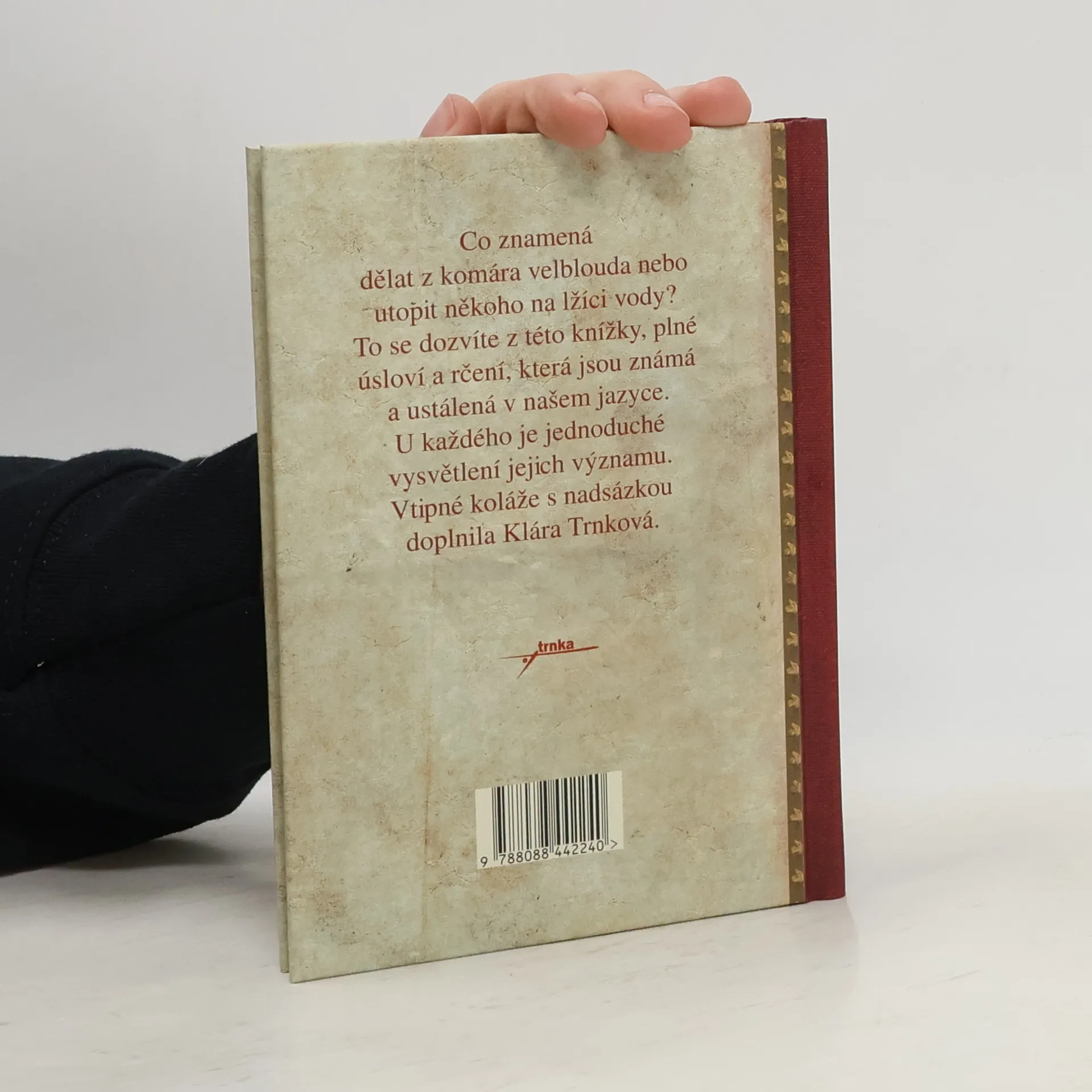 Co znamená dělat z komára velblouda nebo utopit někoho na lžíci vody? To se dozvíme z této knížky, plné úsloví a rčení, která jsou známá a ustálená v našem jazyce. U každého je jednoduché vysvětlení jejich významu. Vtipné koláže s nadsázkou doplnila Klára Trnková.